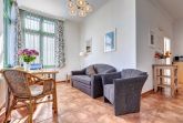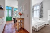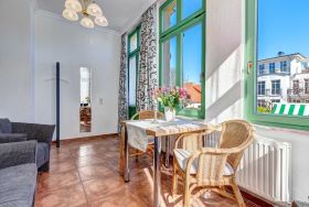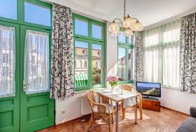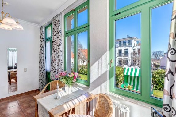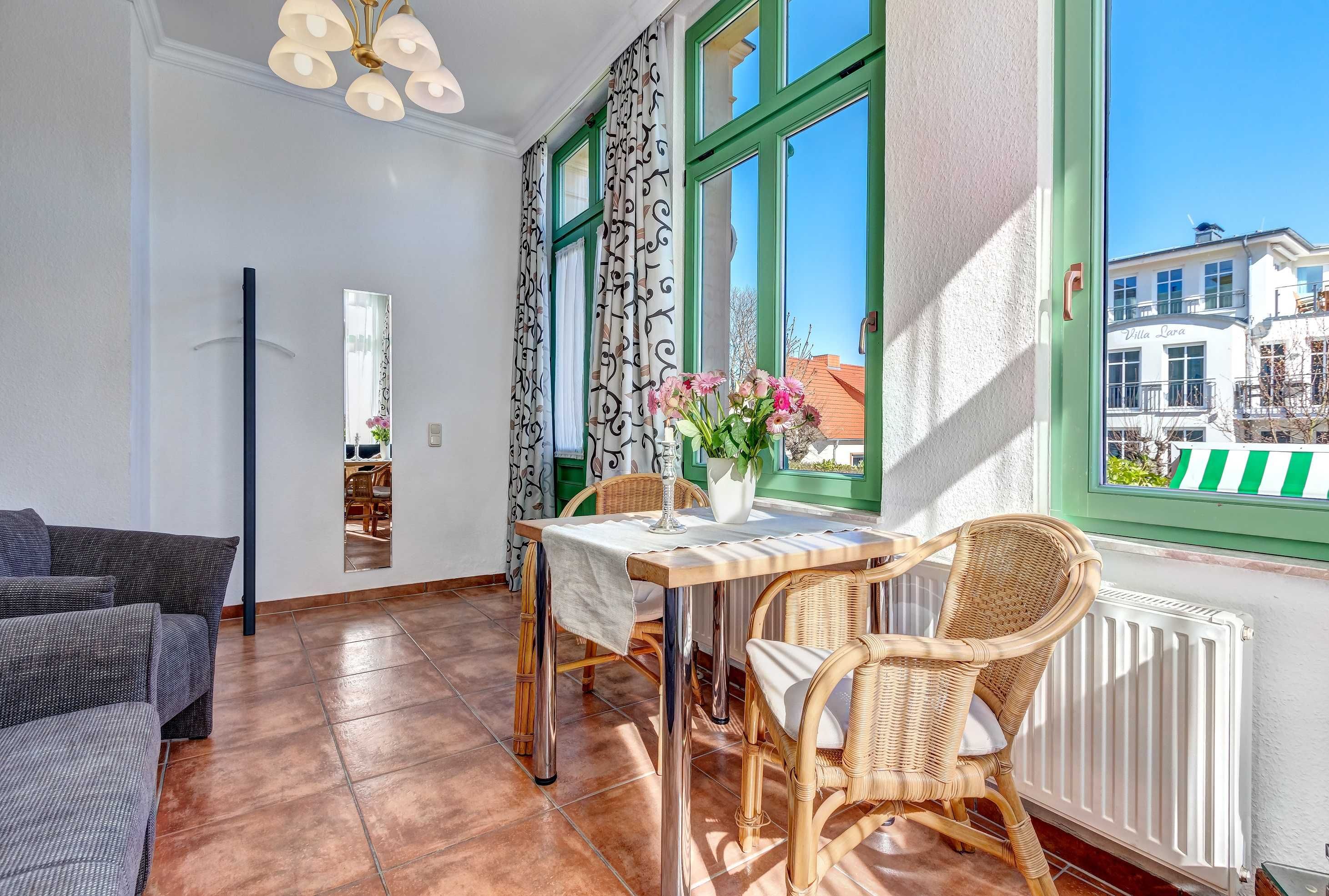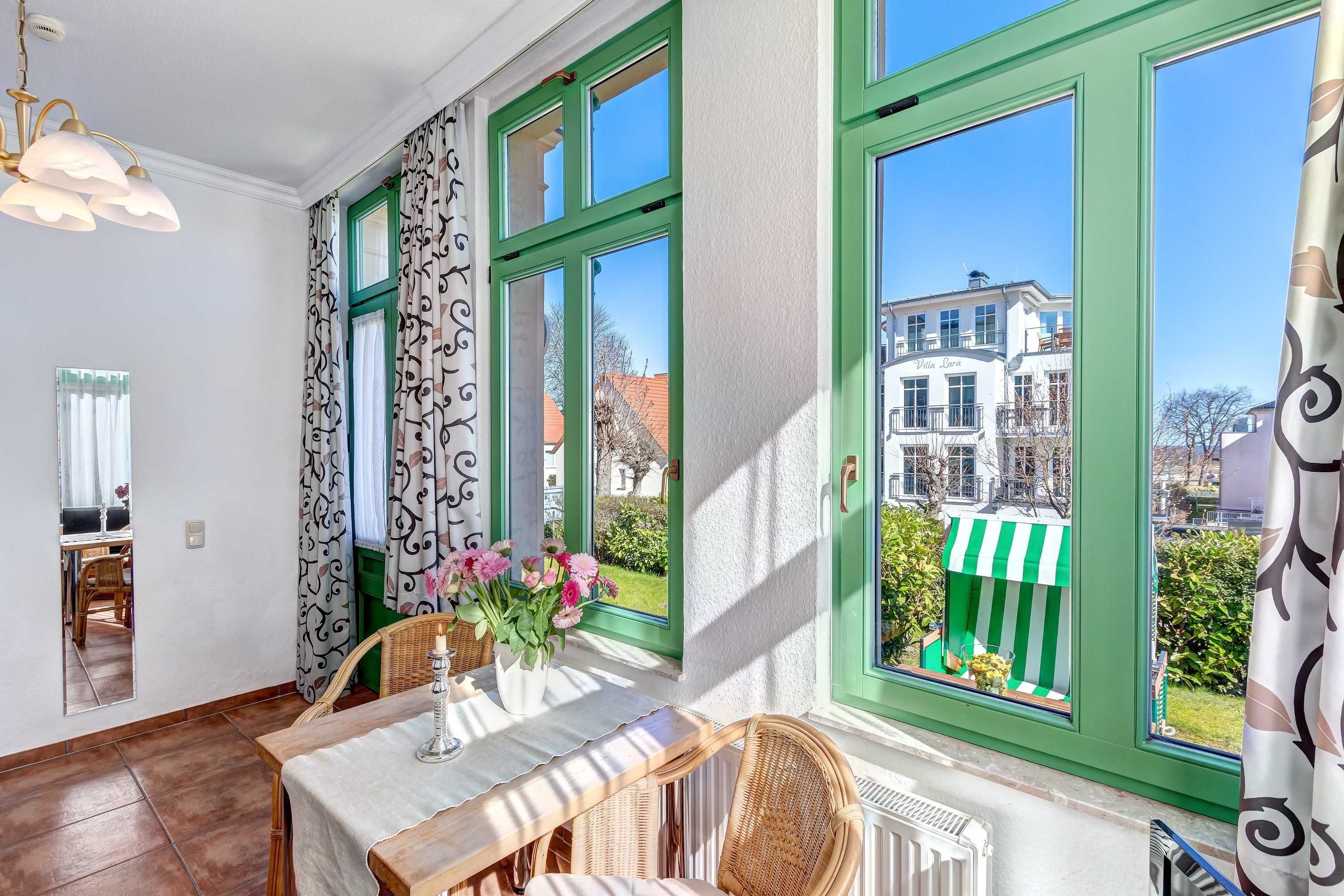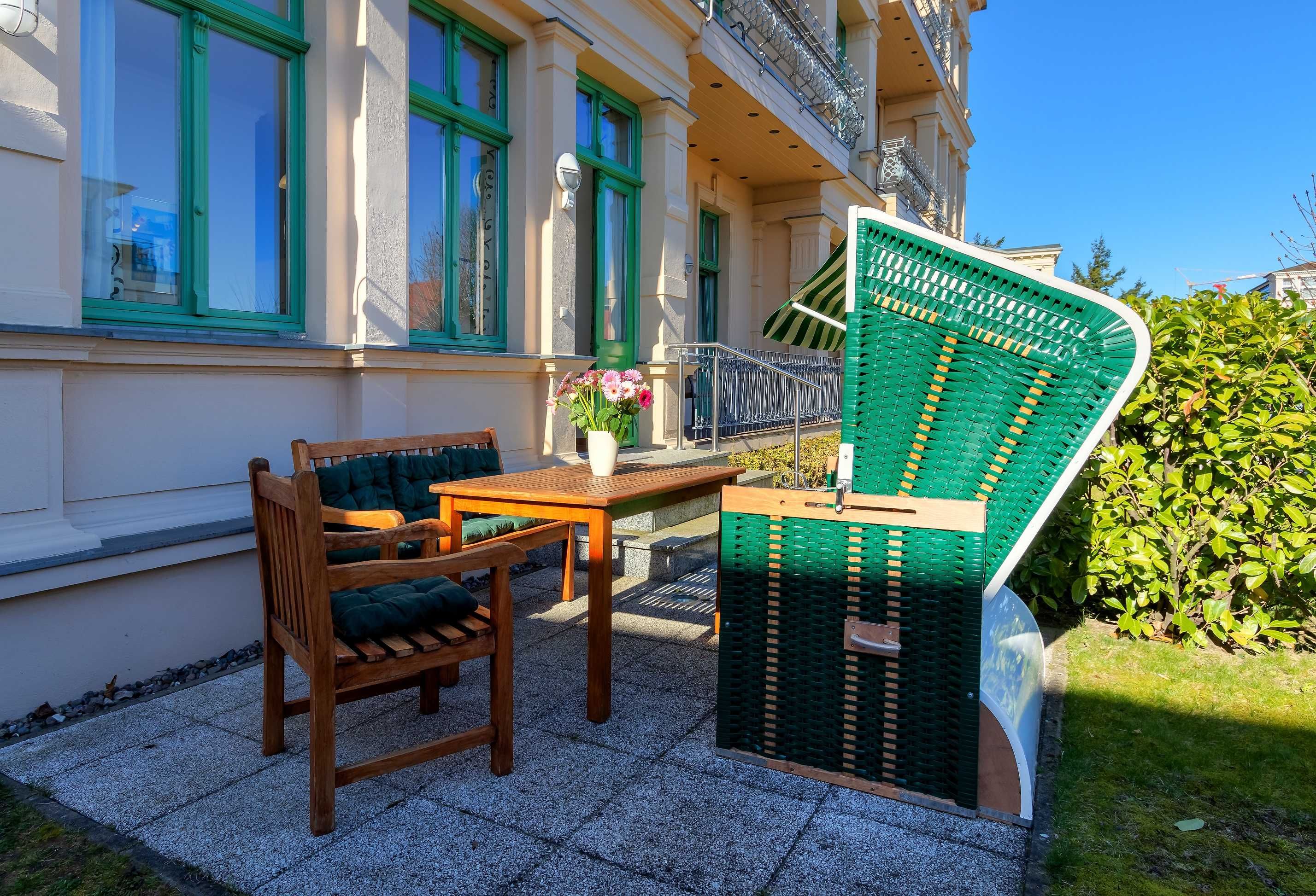 Das gemütliche 2-Zimmer-Appartement Nr. 5 hat einen separaten Eingang und befindet sich im Erdgeschoss der Villa Ostseewarte im Seebad Ahlbeck nur 2 Minuten vom Ostseestrand entfernt. Es verfügt über ein separates Schlafzimmer mit einem Doppelbett und einen Wohnbereich mit gemütlicher Sitzgruppe, auf welcher eine Aufbettung für eine dritte Person vorgenommen werden kann. Die integrierte Küchenzeile ist mit Geschirrspüler, Mikrowelle, Kaffeemaschine, Wasserkocher und Toaster ausgestattet. Das Bad verfügt über Dusche und WC. Zum Appartement gehört darüber hinaus eine große Terrasse mit Gartenmöbeln und einem Strandkorb. Ein Pkw-Stellplatz steht Ihnen auf dem Grundstück kostenfrei zur Verfügung und Ihre Fahrräder können Sie ebenfalls auf dem Grundstück in einem separaten Abstellraum unterbringen. Alle Wohnungen in der Villa Ostseewarte haben passwortgeschütztem DSL-WLAN Internetzugang (gerätegebunden, Euro 1,50 pro Tag und Gerät). Eine Waschmaschine können Sie gegen Gebühr gern nutzen (Münzgerät).