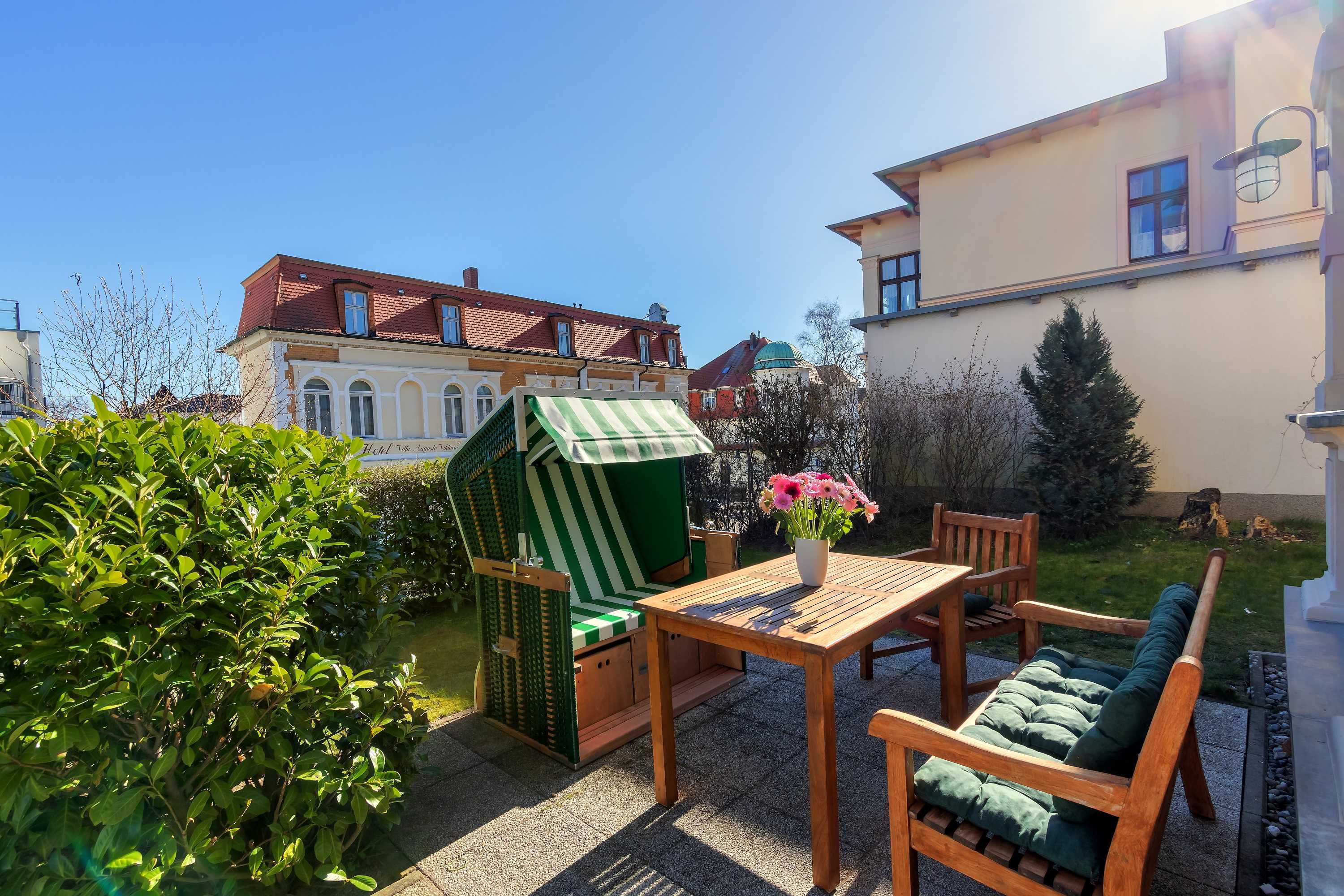 STRANDNAH! Nur ca. 100 m zur Strandpromenade mit TERRASSE, KLEINEM GARTEN und STRANDKORB! Gemütliches 2-Zimmer-Apartment mit freundlicher Ausstattung. Separates Schlafzimmer, Wohnzimmer mit Schlafcouch, Küchenzeile, Essplatz, geräumiges Duschbad, Terrasse mit Gartenmöbeln und STRANDKORB (Frühling bis Herbst) und kleinem Gartenstück, separater Eingang. Die Wohnung verfügt über einen Pkw-Stellplatz . Abstellraum für Fahrräder und ähnliches ist vorhanden. Eine Sauna in der Villa Germania kann kostenpflichtig genutzt werden. Vom Haus aus können Sie das Ortszentrum und die bekannte Ahlbecker Seebrücke in ca. 3 bzw. 5 Minuten zu Fuß erreichen.