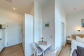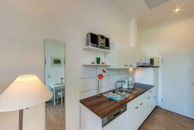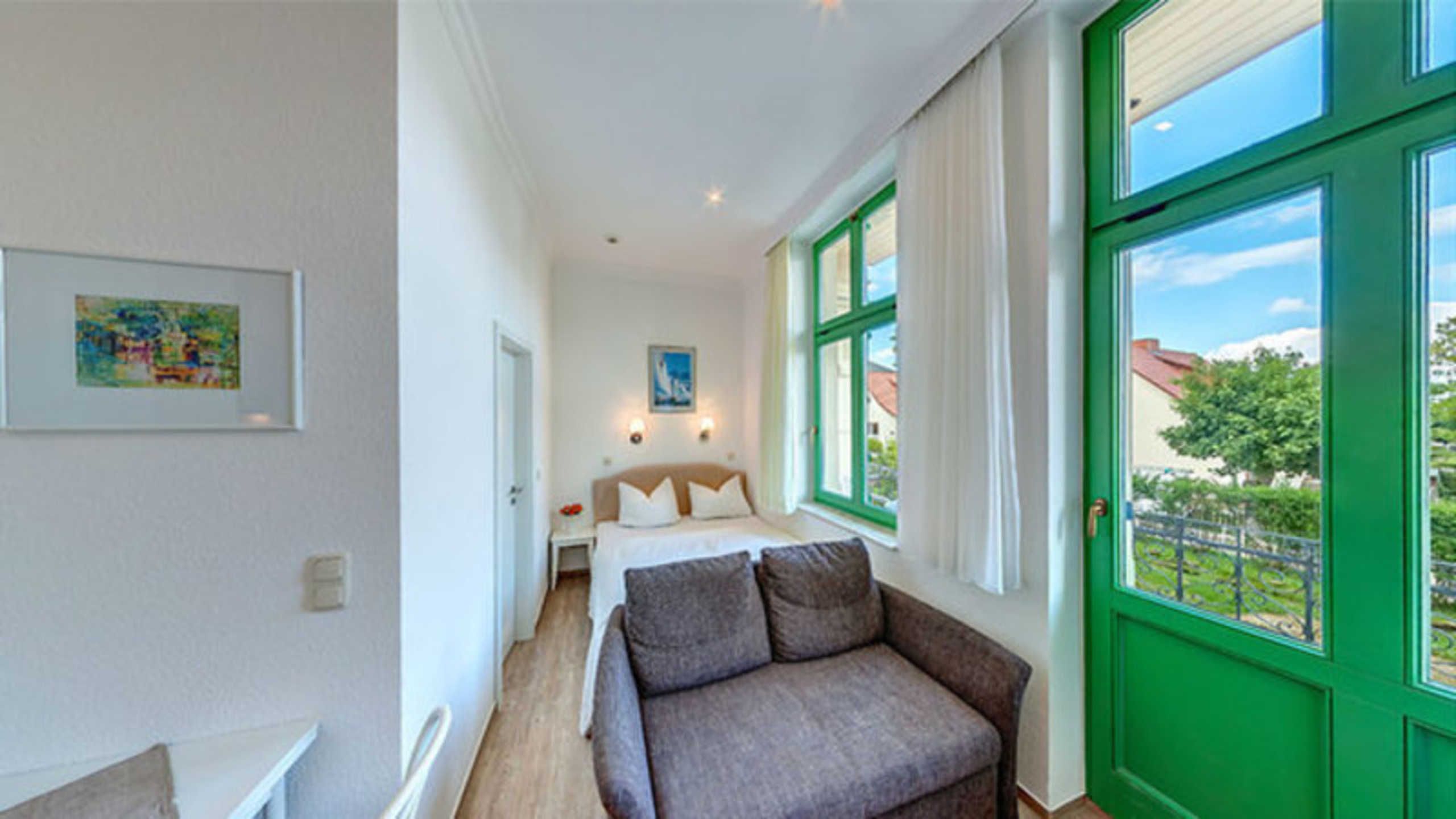 Das gemütliche 1-Zimmer-Appartement Nr. 3 befindet sich im Erdgeschoss der Villa Ostseewarte. Es verfügt über einen geräumigen Wohn- und Schlafraum mit einem Doppelbett, einer gemütlichen Sitzgruppe sowie einem Essplatz. Die integrierte Küchenzeile ist voll ausgestattetet mit Kaffeemaschine, Wasserkocher, Toaster und Mikrowelle. Das Bad verfügt über Dusche und WC. Zum Appartement gehört darüber hinaus ein Balkon. Ein Pkw-Stellplatz steht Ihnen auf dem Grundstück kostenfrei zur Verfügung und Ihre Fahrräder können Sie ebenfalls auf dem Grundstück in einem separaten Abstellraum unterbringen. Alle Wohnungen in der Villa Ostseewarte haben passwortgeschütztem DSL-WLAN Internetzugang (gerätegebunden, Euro 1,50 pro Tag und Gerät). Eine Waschmaschine können Sie gegen Gebühr gern nutzen (Münzgerät).