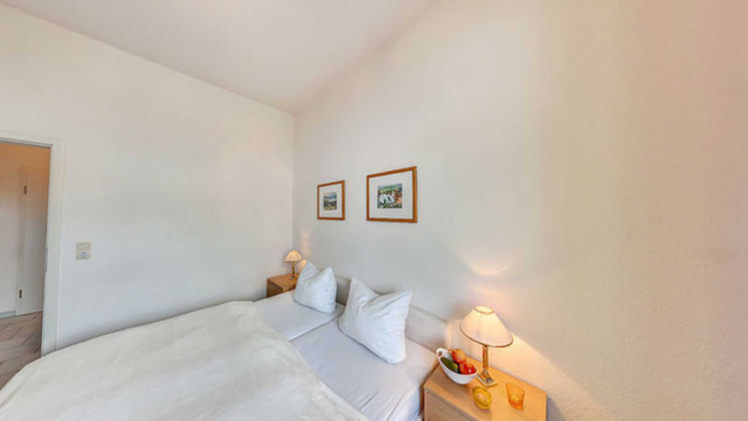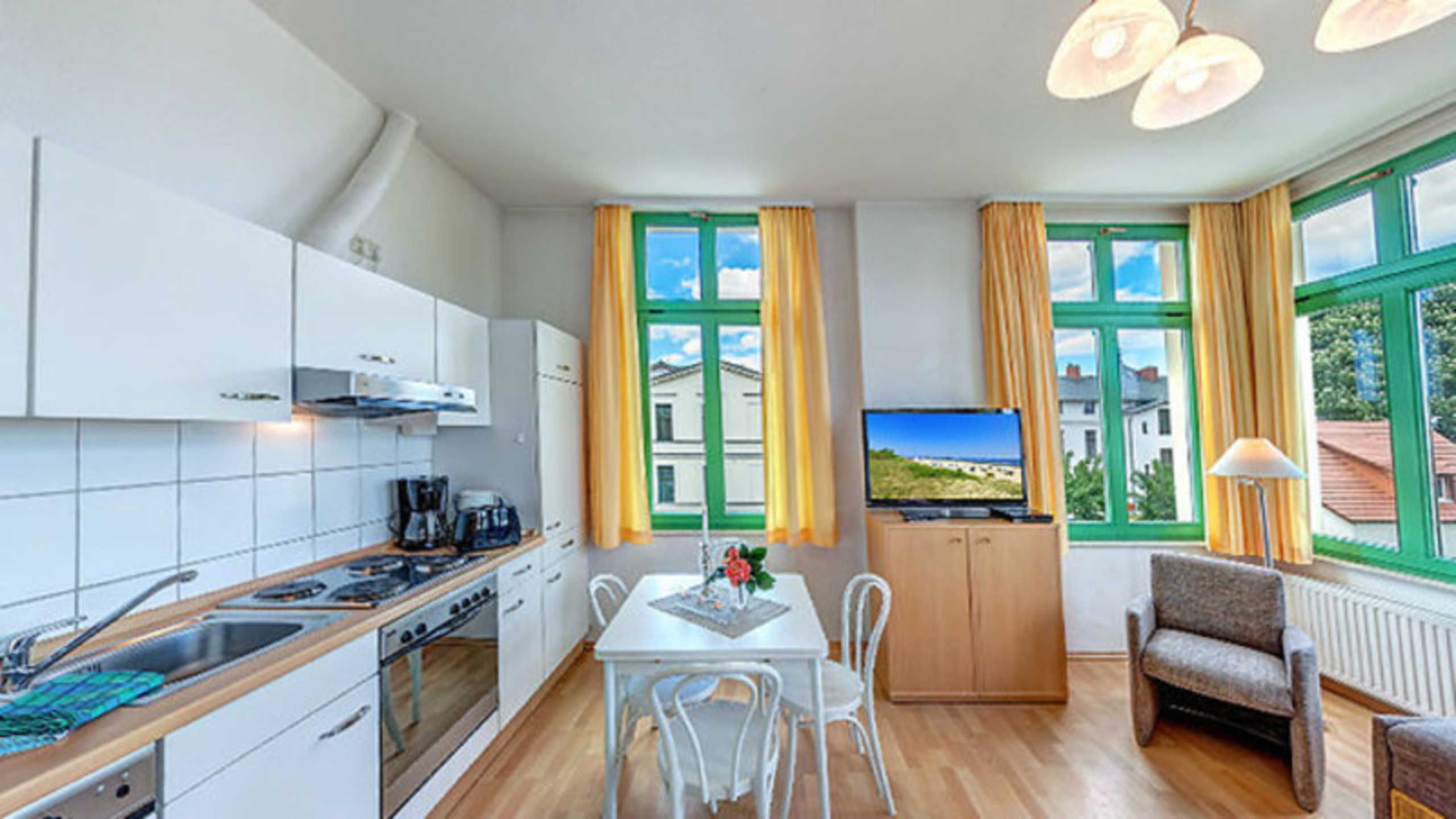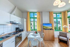 Das gemütliche 2-Zimmer-Appartement Nr. 8 befindet sich im ersten Obergeschoss der Villa Ostseewart. Es verfügt über ein separates Schlafzimmer mit einem Doppelbett und einen Wohnbereich mit einer Doppelschlafcouch, auf welcher Aufbettungen für die dritte und vierte Person vorgenommen werden können. Die voll ausgestattete Küchenzeile mit Kaffeemaschine, Wasserkocher, Toaster, Backofen und Geschirrspüler sowie einem Essplatz ist in den geräumigen Wohnbereich integriert. Das Bad ist mit Dusche und WC ausgestattet, darüber hinaus gibt es ein separates Gäste-WC und einen möblierten Balkon. Ein Pkw-Stellplatz steht Ihnen auf dem Grundstück kostenfrei zur Verfügung und Ihre Fahrräder können Sie ebenfalls auf dem Grundstück in einem separaten Abstellraum unterbringen. Alle Wohnungen in der Villa Ostseewarte haben passwortgeschütztem DSL-WLAN Internetzugang (gerätegebunden, Euro 1,50 pro Tag und Gerät). Ein FAHRSTUHL wurde nachträglich eingebaut. Eine Waschmaschine können Sie gegen Gebühr gern nutzen (Münzgerät).