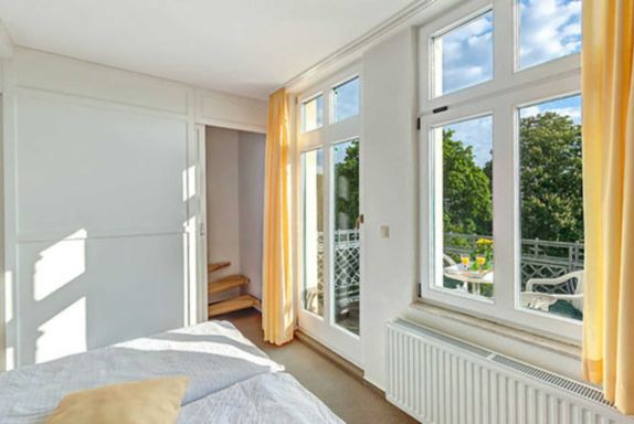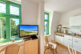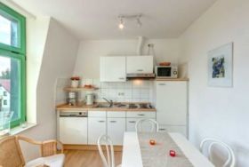 Das große 2 Zimmer-Masionette-Appartement Nr. 18 mit zusätzlichen Schlafraum auf der Empore befindet sich im zweiten und dritten Obergeschoss der Villa Ostseewarte. Auf der unteren Ebene befindet sich ein großer geräumiger Wohnraum mit gemütlicher Sitzgruppe, eine offene, voll ausgestattete Küche mit Kaffeemaschine, Wasserkocher, Toaster, Mikrowelle, Backofen und Geschirrspüler sowie einem gemütlichen Essplatz. Das Bad auf der unteren Ebene ist mit Dusche und WC ausgestattet , das separate Schlafzimmer verfügt über ein großes Doppelbett. Ebenfalls auf der unteren Ebene befindet sich der im Sommer möblierte Südbalkon, auf dem Sie bis Abends die Sonne genießen können.