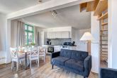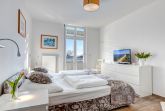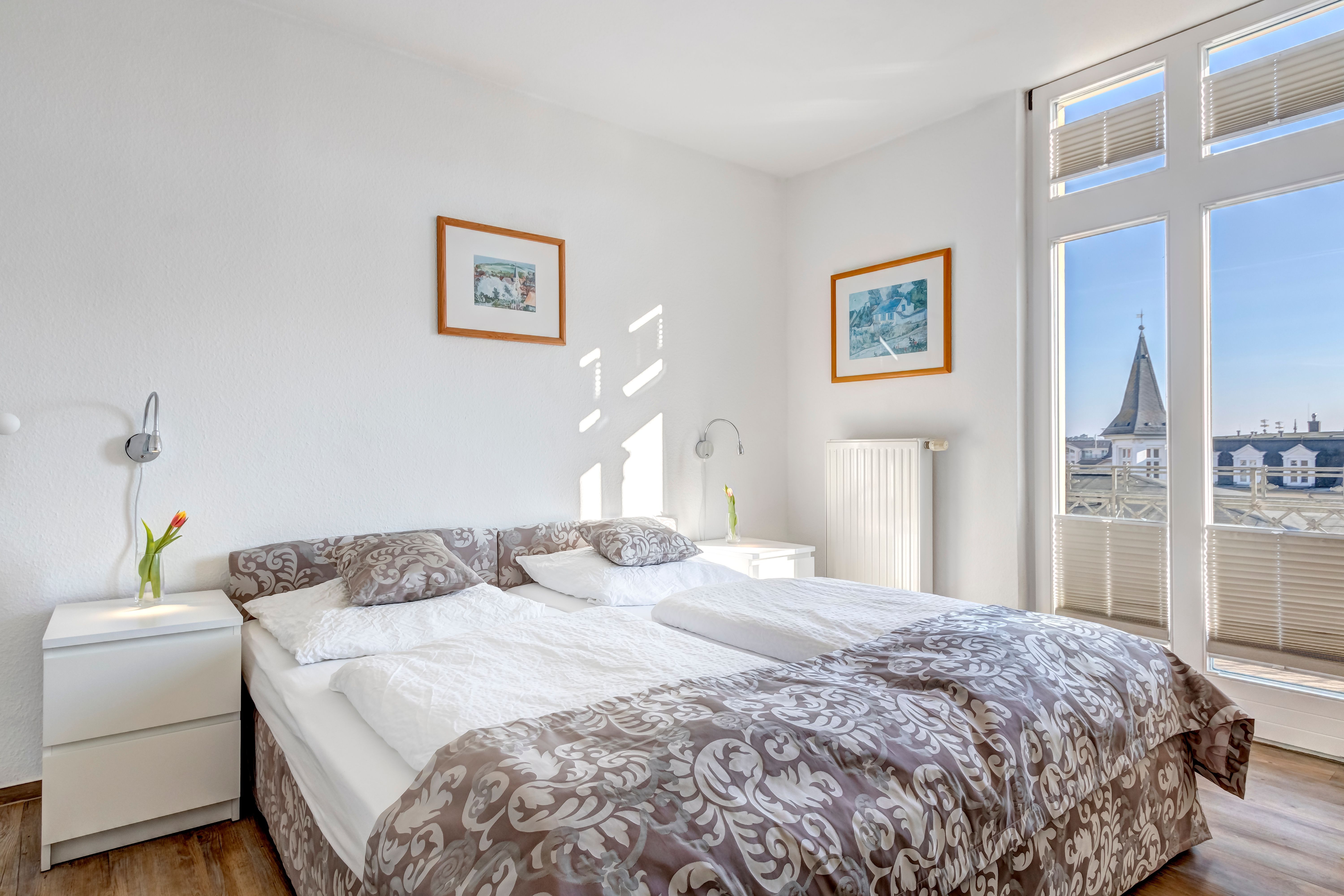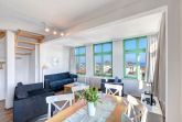 Das große 4-Zimmer-Masionette-Appartement Nr. 17 mit Seeblick und zusätzlichen Schlafraum auf der Empore befindet sich im zweiten und dritten Obergeschoss der Villa Ostseewarte. Auf der unteren Ebene befindet sich ein großer geräumiger Wohnraum mit gemütlicher Sitzgruppe, eine offene, voll ausgestattete Küche mit Kaffeemschine, Wasserkocher, Toaster, Mikrowelle, Backofen und Geschirrspüler sowie einem gemütlichen Essplatz. Das Bad auf der unteren Ebene ist mit Dusche und WC ausgestattet , das separate Schlafzimmer verfügt über ein großes Doppelbett. Ebenfalls auf der unteren Ebene befindet sich der im Sommer möblierte Balkon.