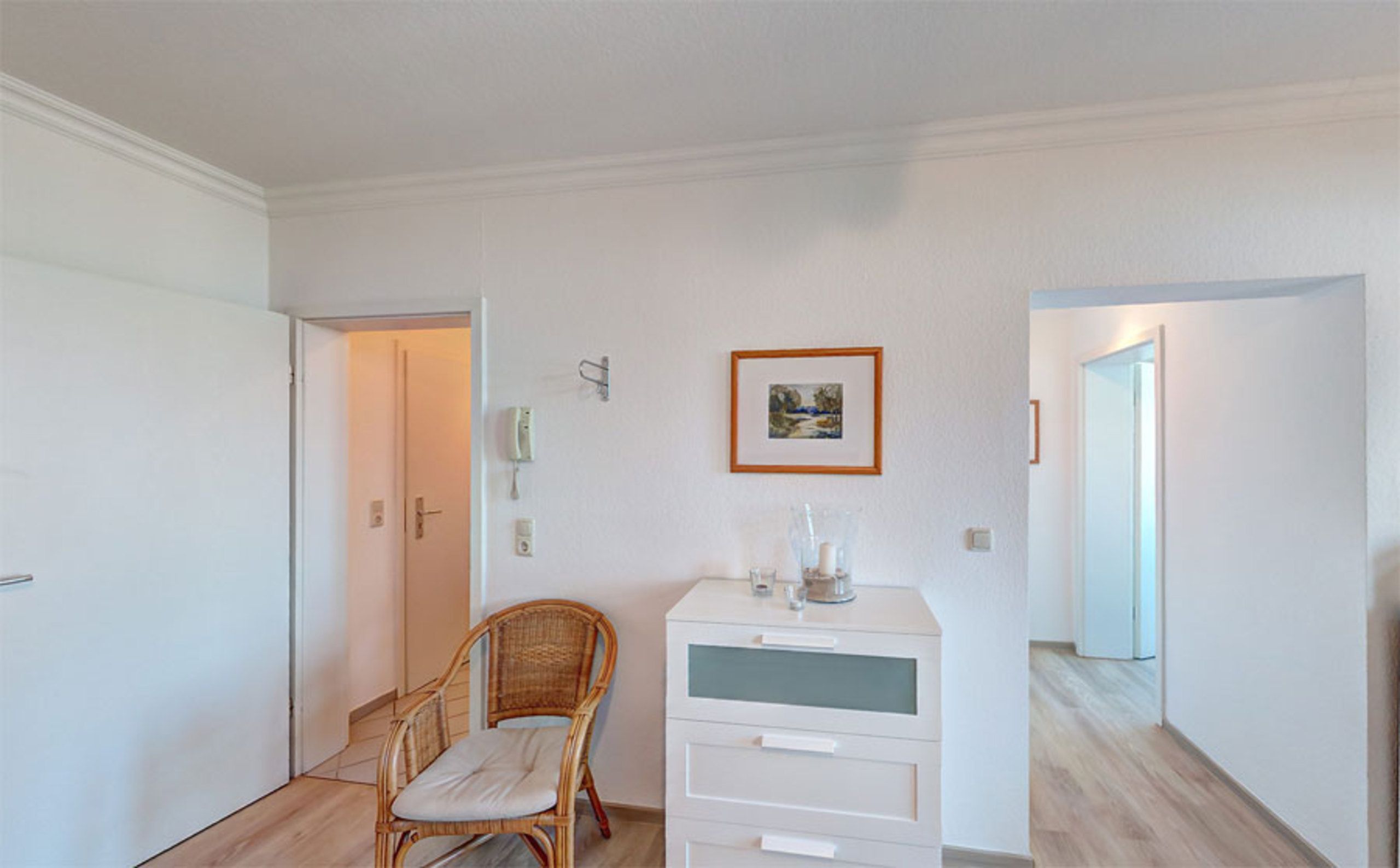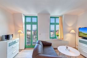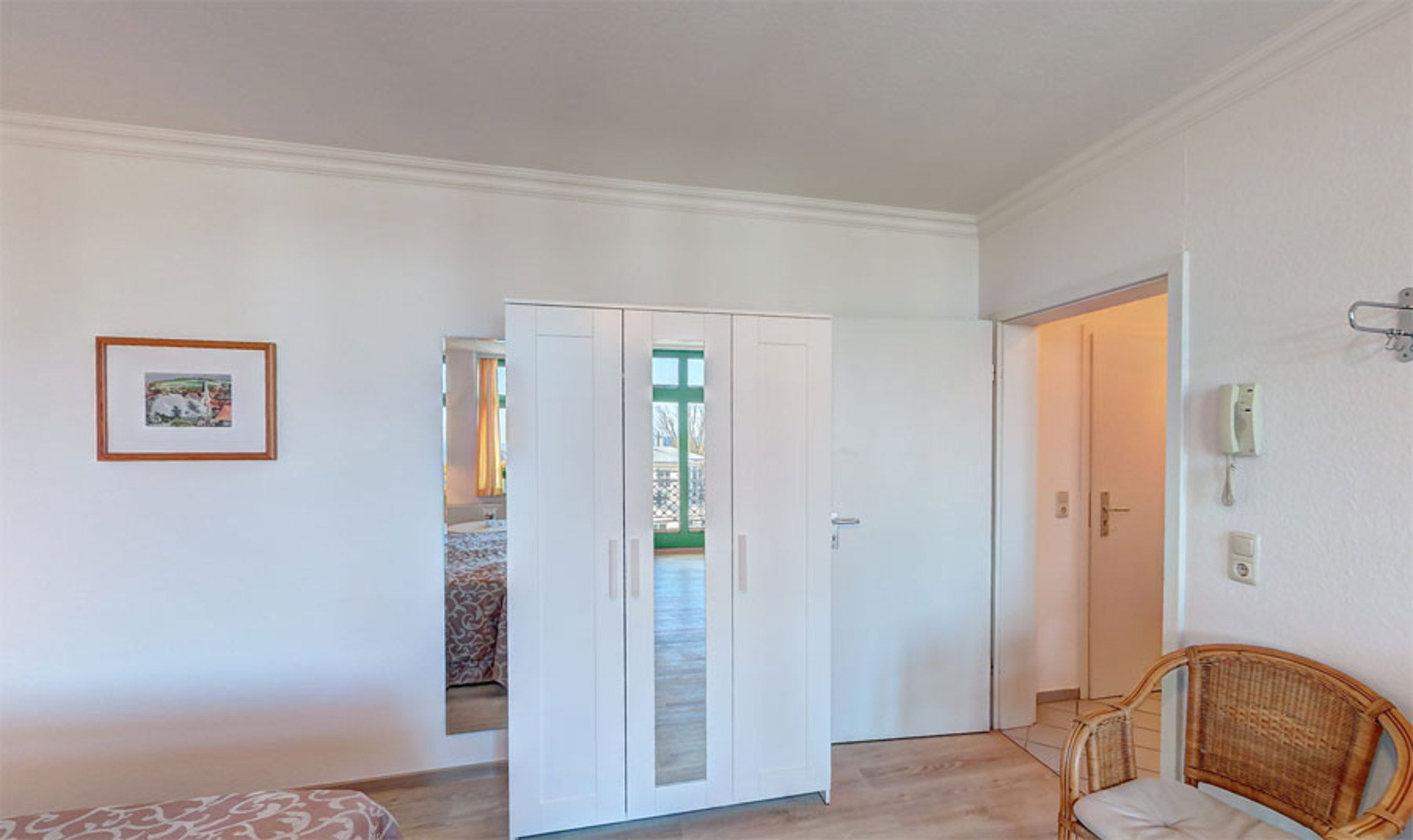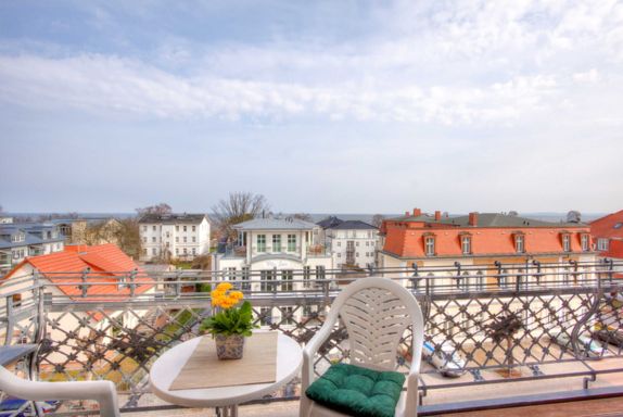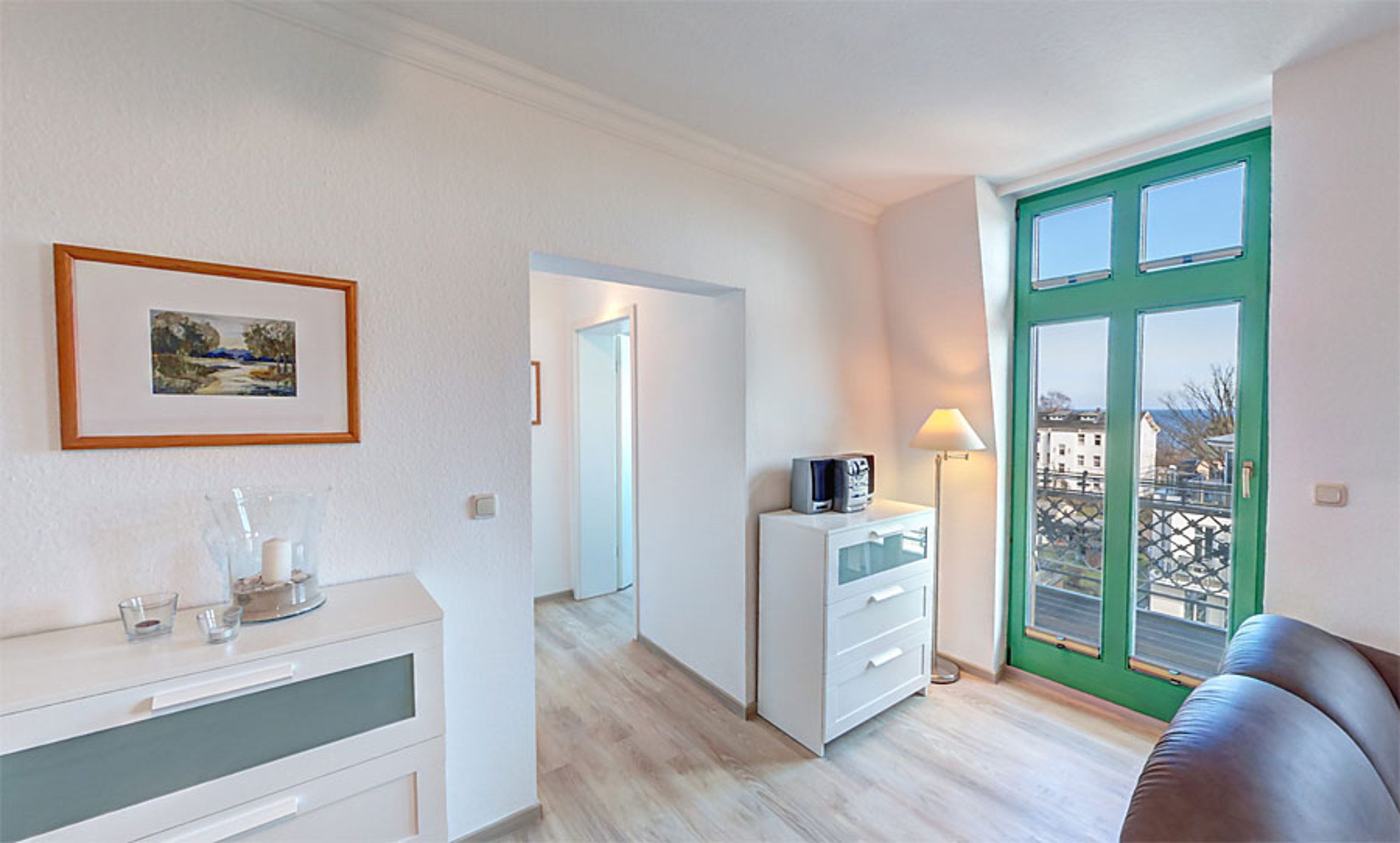 Das gemütliche 1-Zimmer-Appartement Nr. 16 befindet sich im zweiten Obergeschoss der Villa Ostseewarte. Es verfügt über einen kleinen Vorflur, einen geräumigen Wohn- und Schlafraum mit einem Doppelbett, einer gemütlichen Sitzgruppe sowie einem Essplatz. Die separate Küche ist voll ausgestattetet mit Kaffeemaschine, Wasserkocher, Toaster und Mikrowelle. Das Bad verfügt über Dusche und WC. Zum Appartement gehört darüber hinaus ein Balkon zur Seeseite mit Seeblick über die davor stehenden Häuser hinweg. Ein Pkw-Stellplatz steht Ihnen auf dem Grundstück kostenfrei zur Verfügung und Ihre Fahrräder können Sie ebenfalls auf dem Grundstück in einem separaten Abstellraum unterbringen. Alle Wohnungen in der Villa Ostseewarte haben passwortgeschütztem DSL-WLAN Internetzugang (gerätegebunden, Euro 1,50 pro Tag und Gerät). Ein FAHRSTUHL wurde nachträglich eingebaut. Eine Waschmaschine kann gegen Gebühr gern genutzt werdem (Münzgerät).