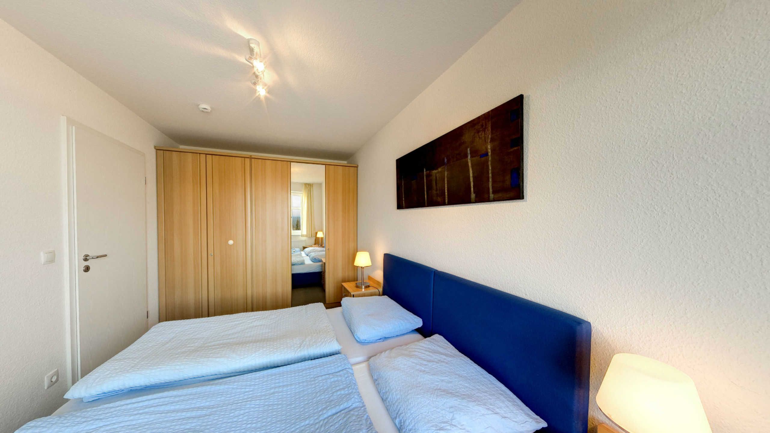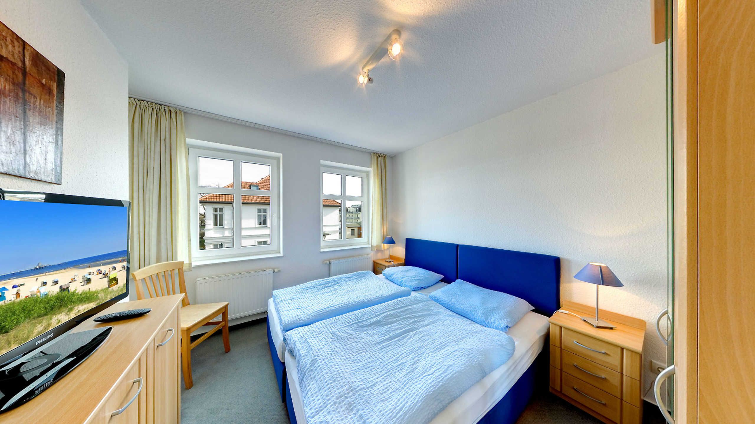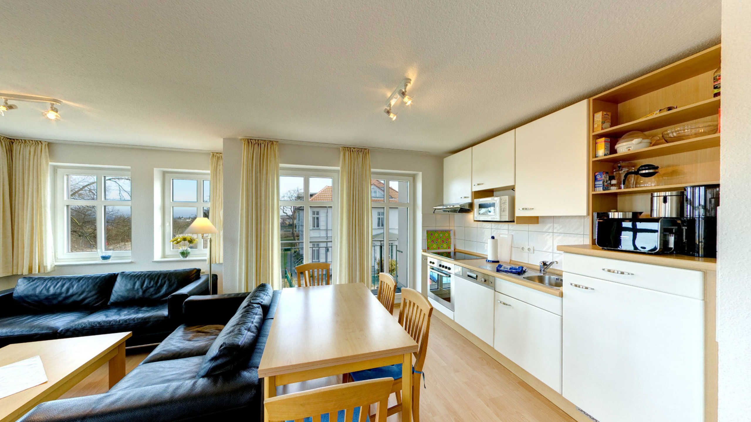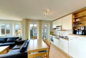 Das Appartement verfügt über zwei separate Schlafzimmer mit je einem Doppelbett. In den Wohnbereich mit gemütlicher Sitzgruppe und einem Essbereich ist eine offene und mit Kaffemaschine, Wasserkocher, Toaster, Mikrowelle, Backofen und Geschirrspüler voll ausgestattete Küchenzeile integriert. Vom Wohnbereich aus gelangen Sie auch auf den Balkon, von dem Sie ebenfalls eine herrliche Sicht auf die Ostsee und die Ahlbecker Seebrücke haben. Das Bad ist mit Wanne und Dusche ausgestattet, zusätzlich gibt es noch ein Gäste-WC. Zum Appartement gehört ein Stellplatz in der Tiefgarage.