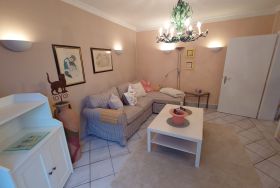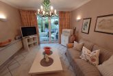 Terrassenwohnung mit Garten: 2 Zimmer, ca. 48 m², inkl. Essdiele mit Küchenzeile. Separate Dusche und WC mit stationärem Schminkspiegel und Fön. Überdachte Freiterrasse vom stilvoll eingerichtetem Wohnzimmer begehbar. Schlafzimmer mit 2 Einzelbetten (Boxspringbetten, Einstiegshöhe: 60 cm) Leselampen und 2 Kleiderschränke. Ganzkörperspiegel und Sitzgruppe. Holzofen-Gartengrill, Mikrowelle.