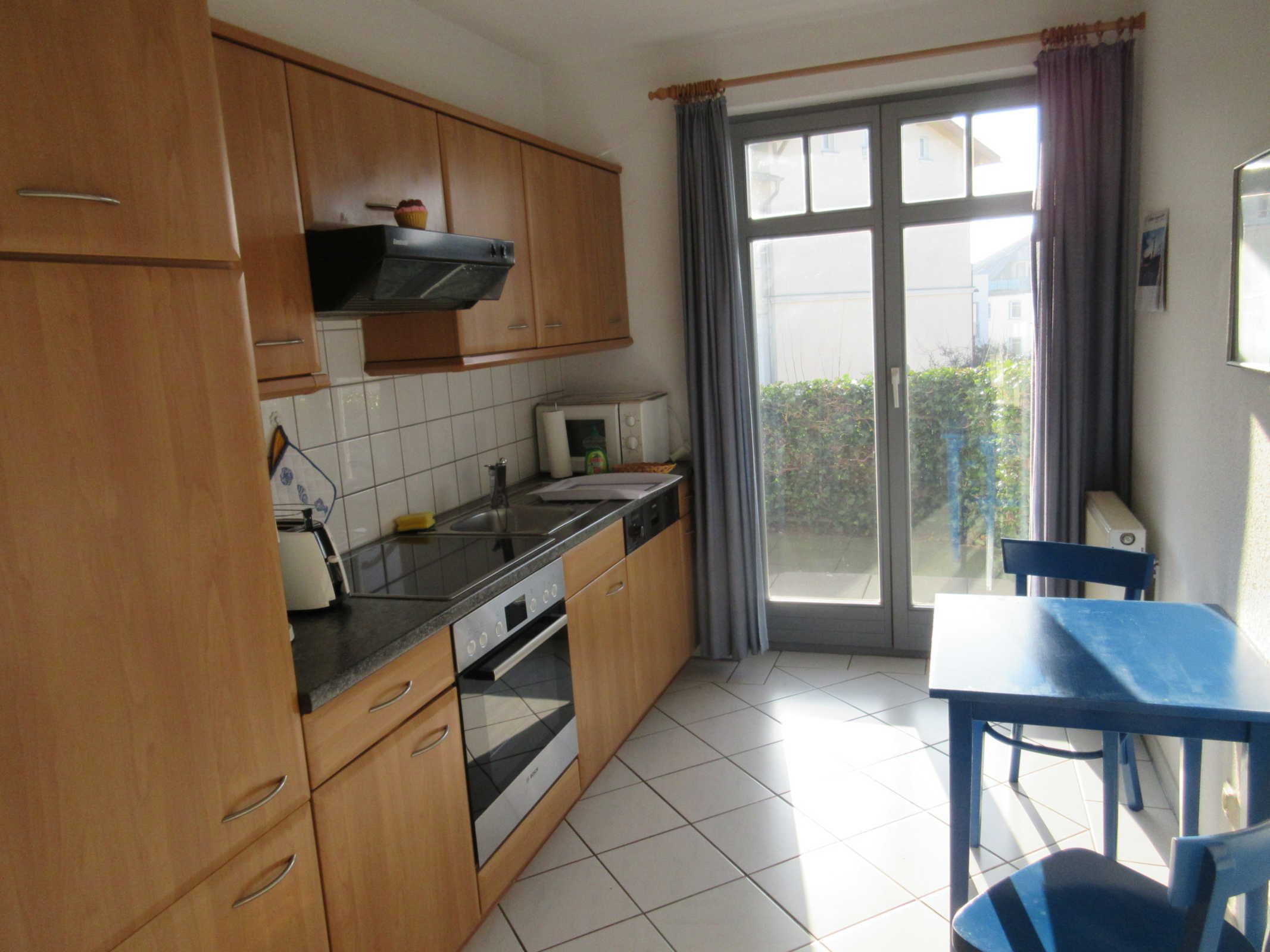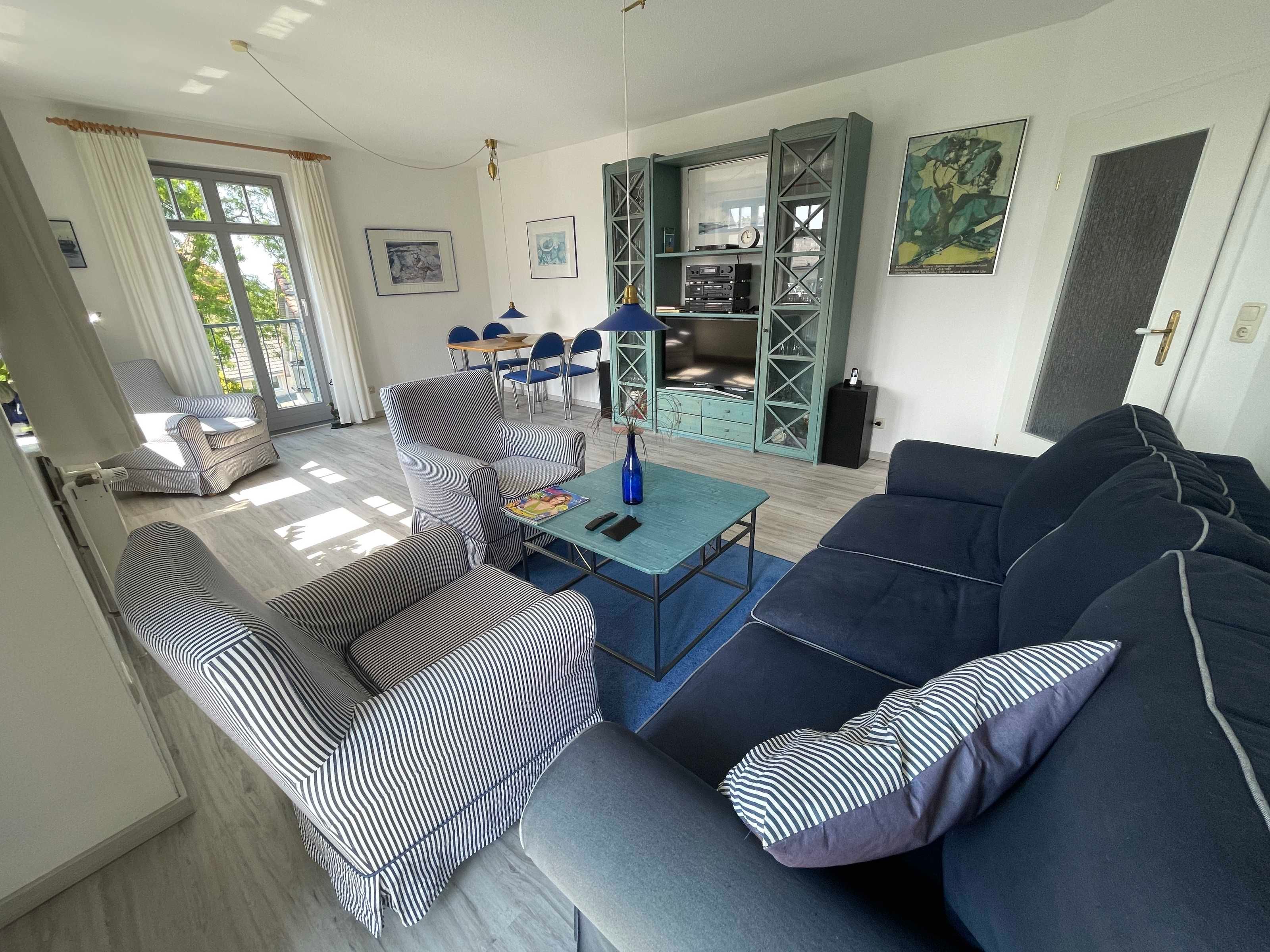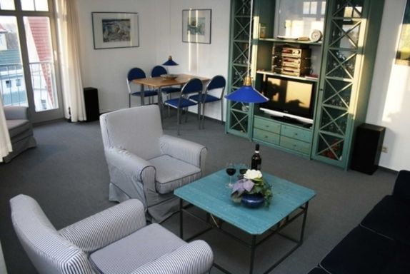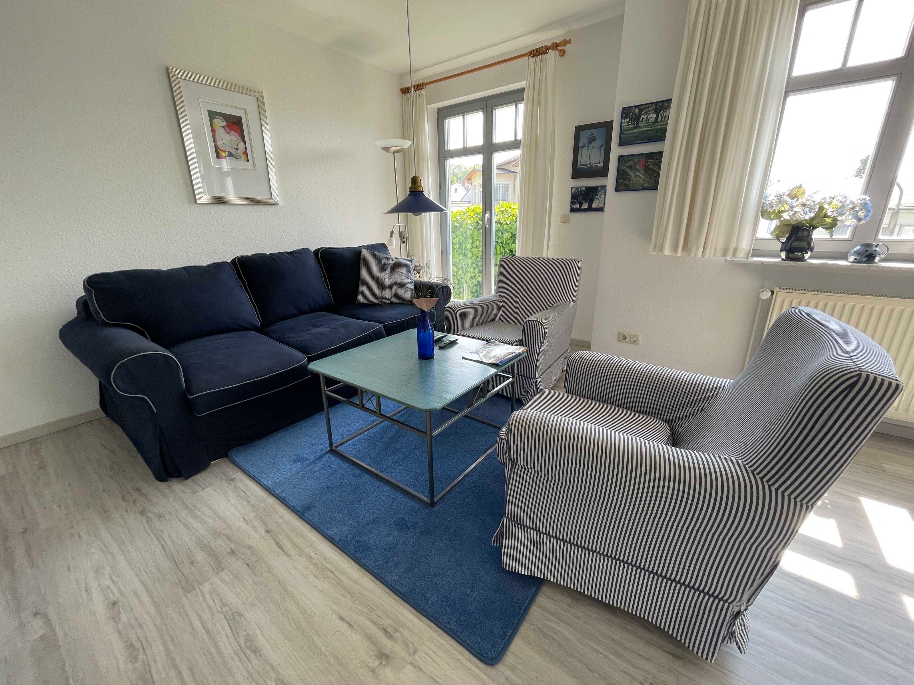 Das großzügig, modern und komfortabel eingerichtete 3-Raum-Appartement im Erdgeschoß mit kompletter, separater Küche (Ceran-Kochfeld , Backofen, Geschirrspüler, hochwertiges Geschirr, Mikrowelle, etc.) ist für 4 Personen (Doppelbett im 1. Schlafraum & großes Etagenbett im 2. Schlafraum) sowie für zwei weitere Personen (Doppelschlafcouch) vorgesehen. Im Bad befinden sich Dusche und Badewanne/WC. Zur Ausstattung gehören eine große Terrasse zur Südseite mit Sitz-/Liegemöbeln sowie Grill (von dort ist teilweise seitlicher Meerblick möglich), Smart-TV, Telefon, W-LAN.