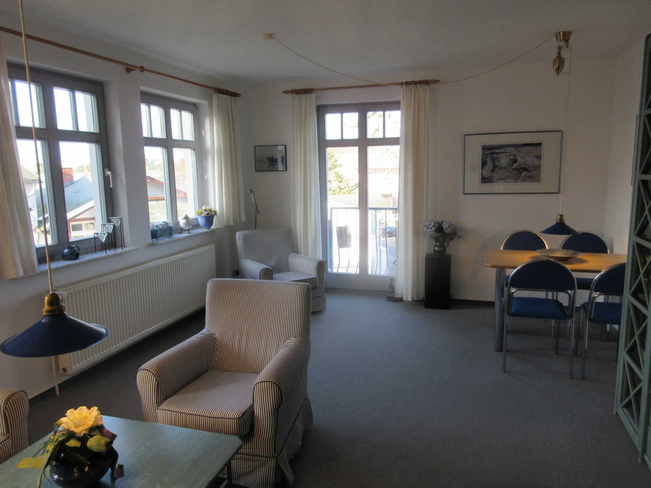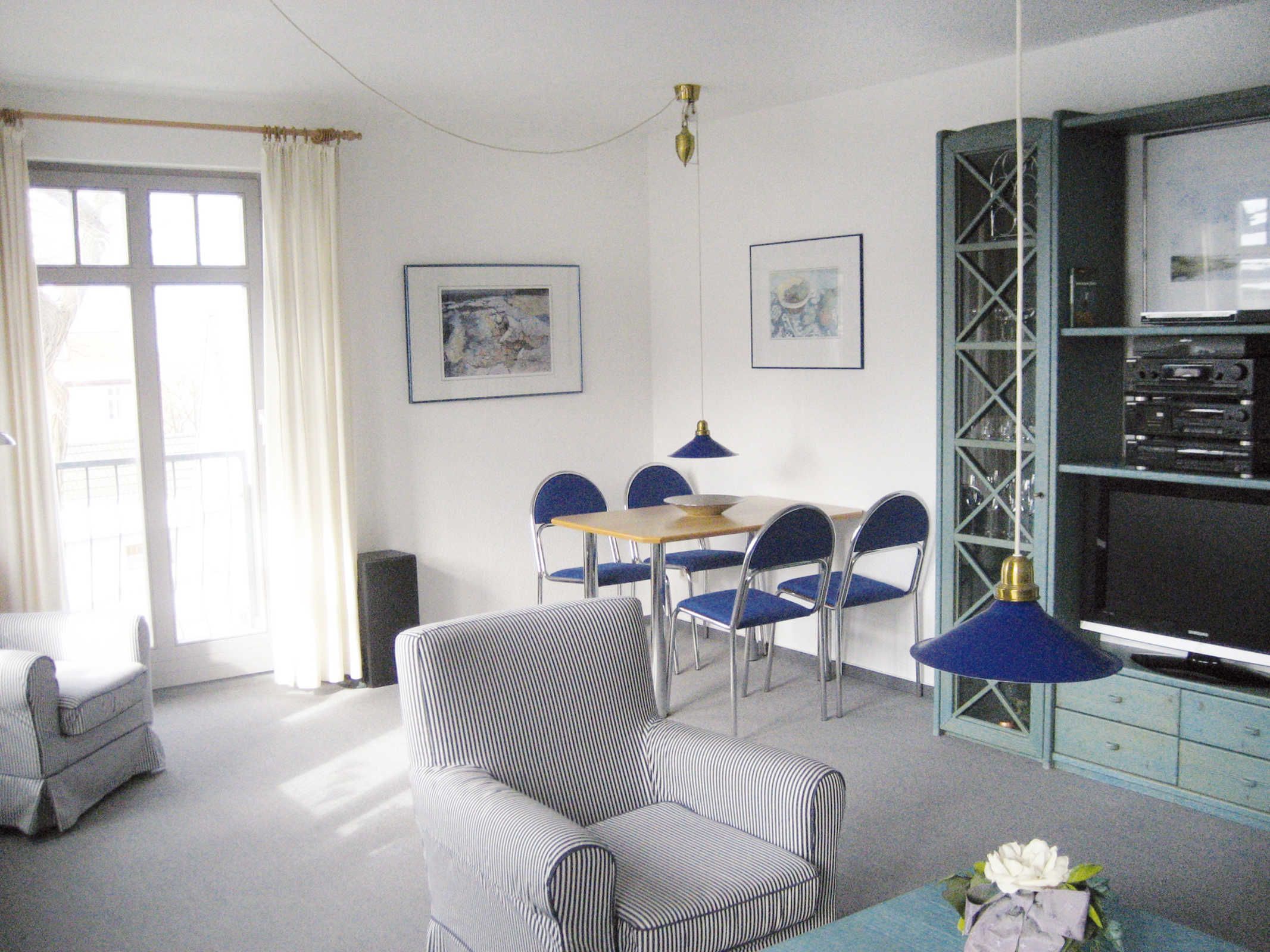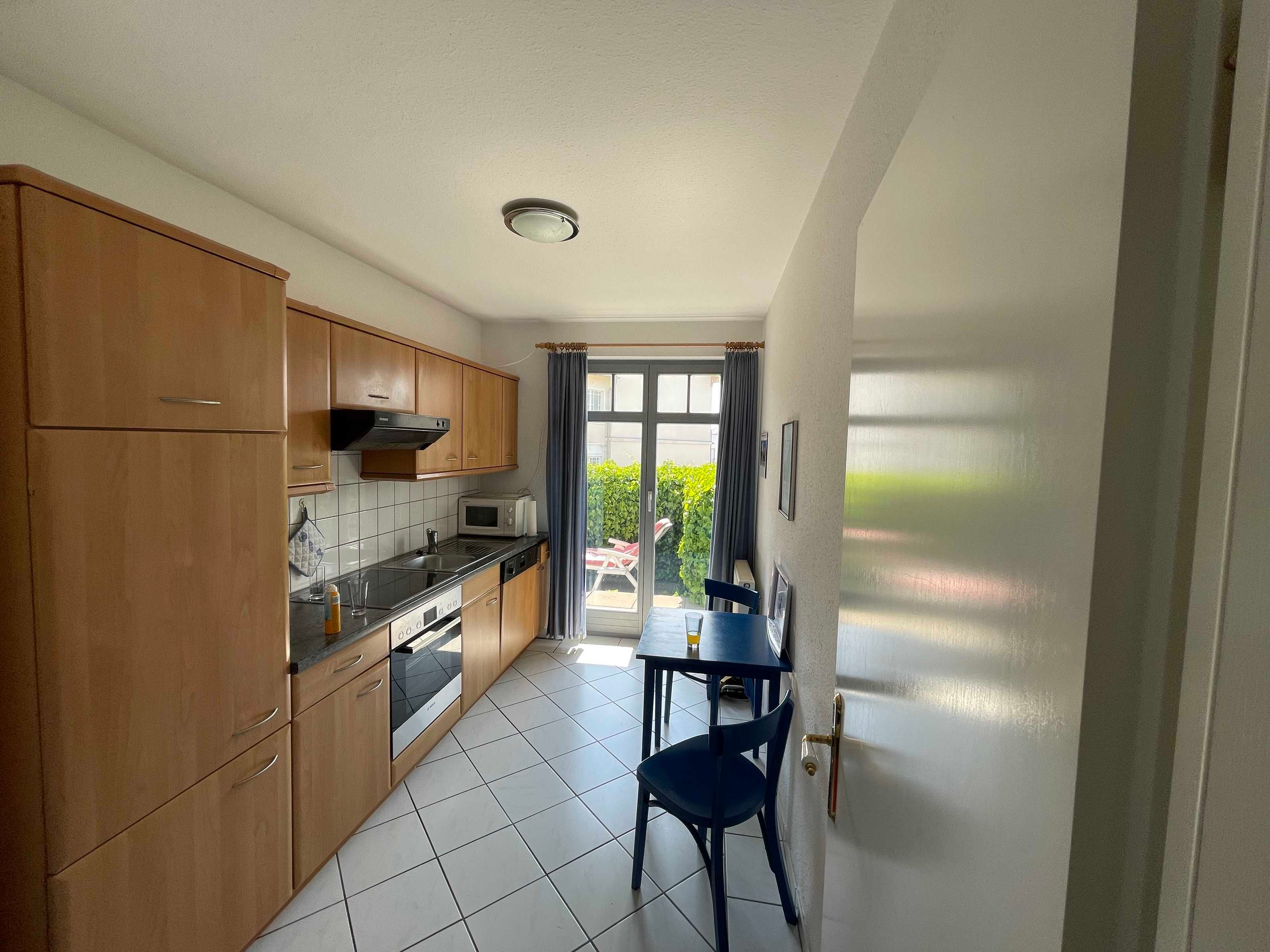 Das großzügig, modern und komfortabel eingerichtete 3-Raum-Appartement im Erdgeschoß mit kompletter, separater Küche (Ceran-Kochfeld , Backofen, Geschirrspüler, hochwertiges Geschirr, Mikrowelle, etc.) ist für 4 Personen (Doppelbett im 1. Schlafraum & großes Etagenbett im 2. Schlafraum) sowie für zwei weitere Personen (Doppelschlafcouch) vorgesehen. Im Bad befinden sich Dusche und Badewanne/WC. Zur Ausstattung gehören eine große Terrasse zur Südseite mit Sitz-/Liegemöbeln sowie Grill (von dort ist teilweise seitlicher Meerblick möglich), Smart-TV, Telefon, W-LAN.