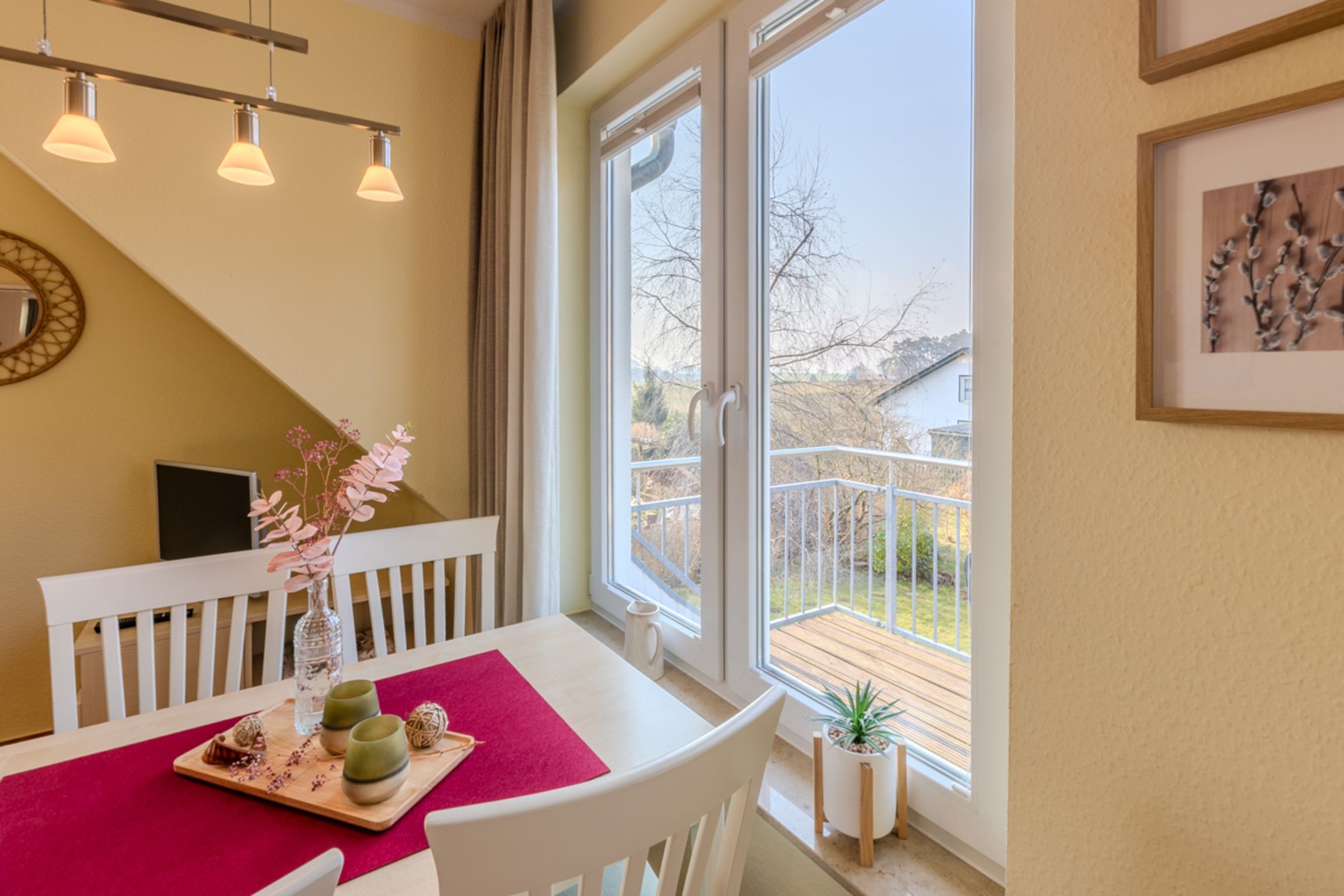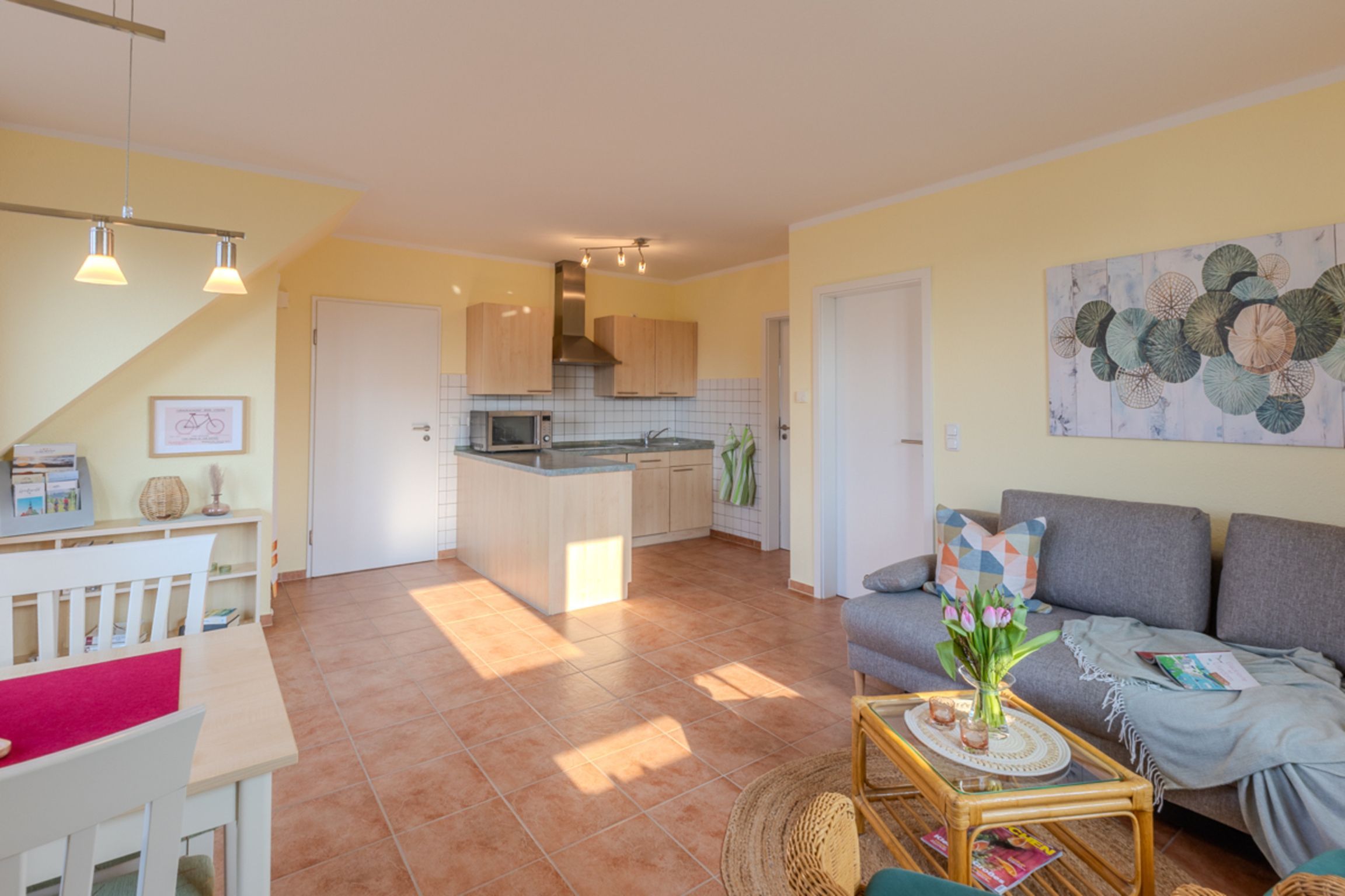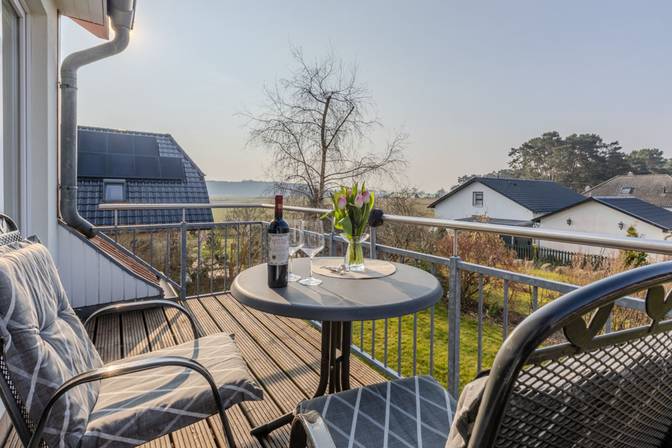 Die Dachgeschoss-Wohnung „Margarete“ ist großzügig geschnitten, ausgesprochen hell und freundlich gestaltet. Vor dem nach Süd-Westen ausgerichteten Wohnzimmer befindet sich ein geräumiger Balkon. Von diesem können Sie nicht nur zum Sonnenuntergang tief durchatmen und einen traumhaften Blick über die angrenzenden Wiesen auf das Achterwasser genießen.