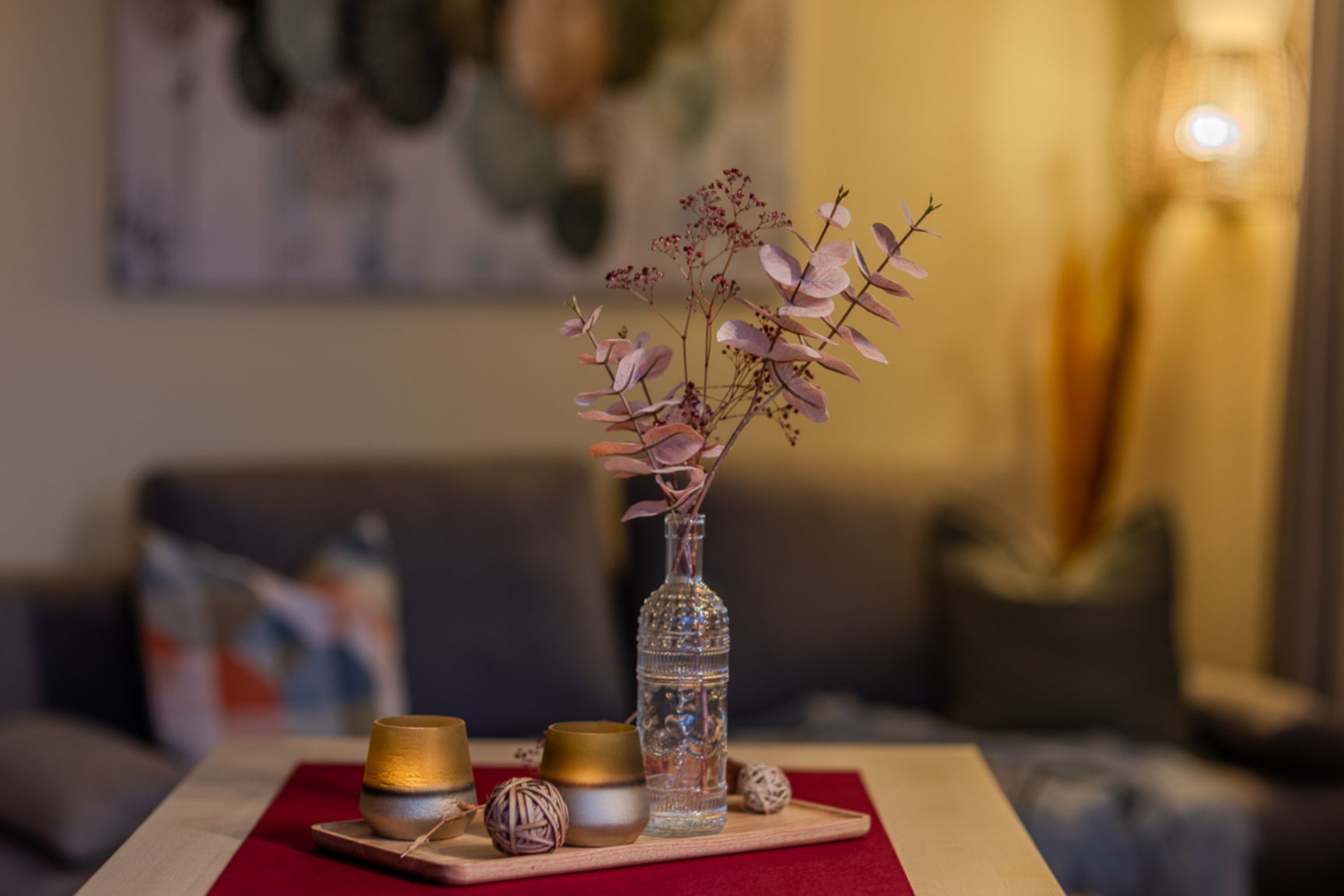 Ein gemütliches Wohnzimmer mit dazugehöriger Leseecke, kuschelige Betten mit bequemen und allergiker-freundlichen Kaltschaummatratzen, ausreichend Stauraum für ihre Kleidung, ein geräumiges Badezimmer sowie eine voll ausgestattete Markeneinbauküche dies sind nur einige Aspekte unser Dachgeschoss-Ferienwohnung, die für ein behagliches Ambiente sorgen.
