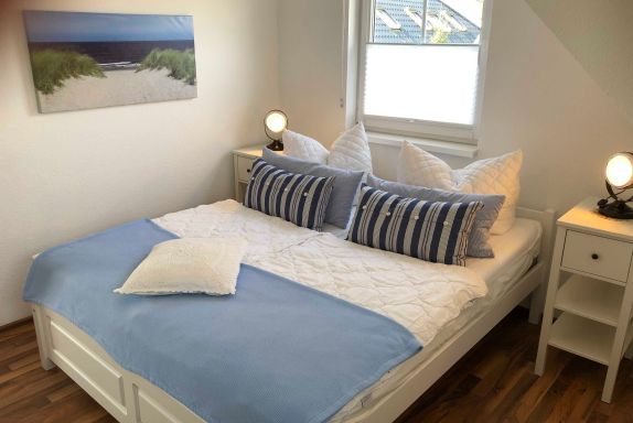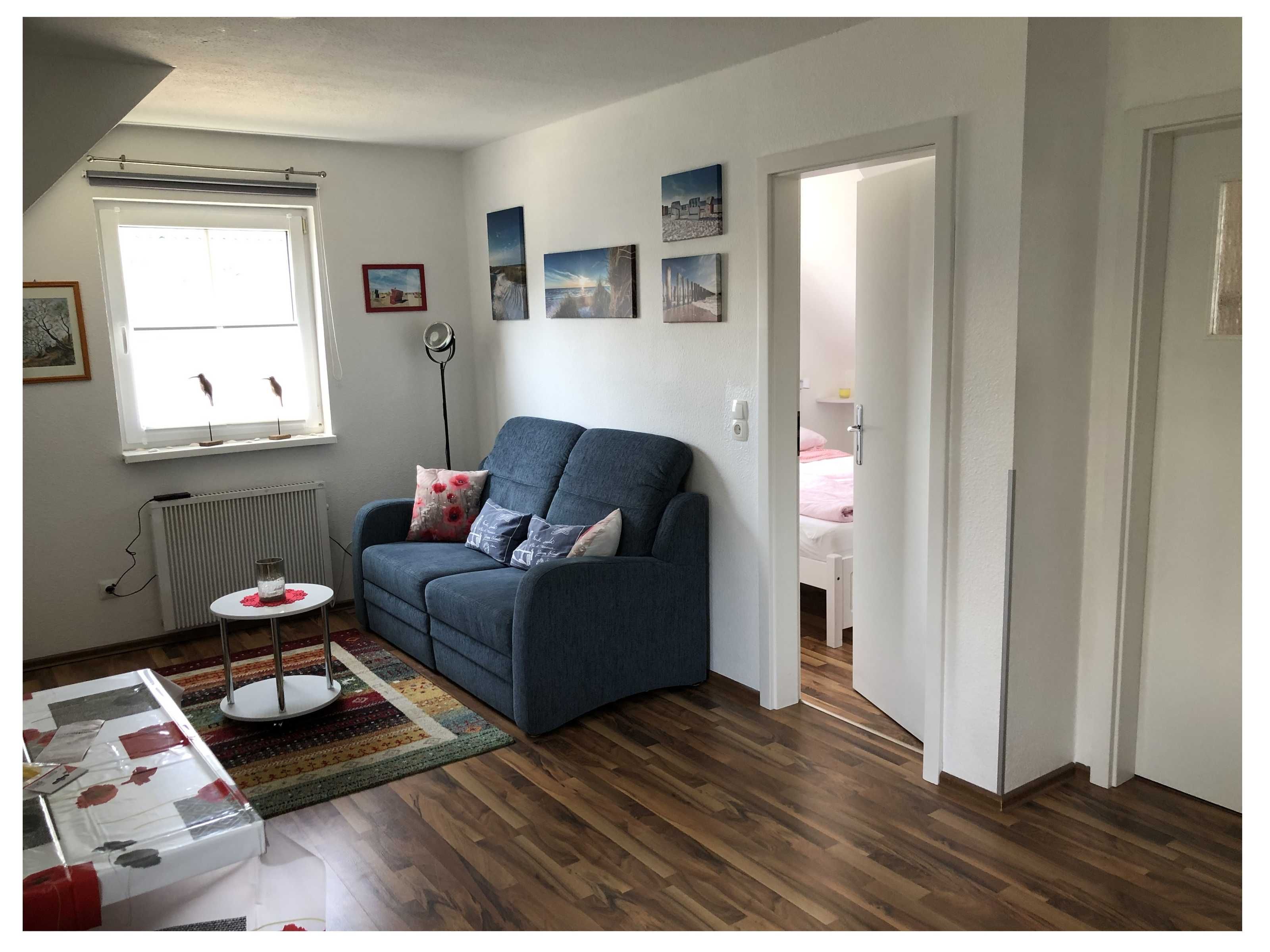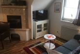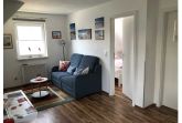 Ferienwohnung,40 qm groß, ganzjährig nutzbar im OG einer Anlage mit 6 Ferienwohnungen, verteilt auf 2 Häuser auf einem 900 m2 großen Grundstück. Wohnraum mit gemütlicher Couch, großem Esstisch, Elektrokamin, Sat-TV.