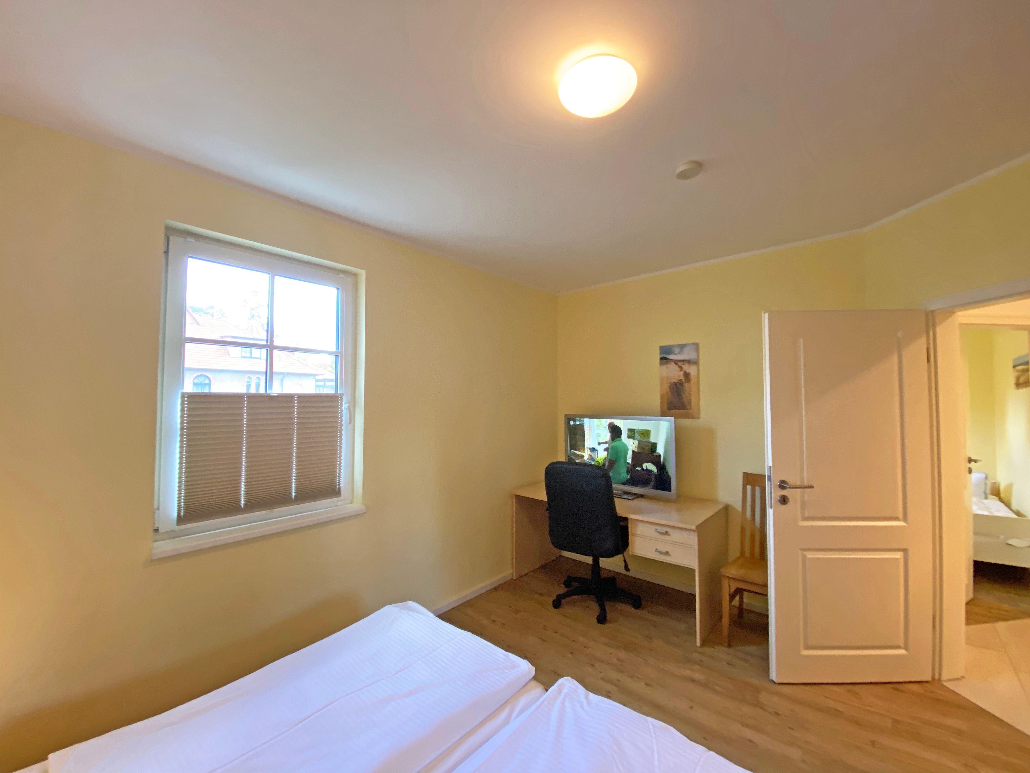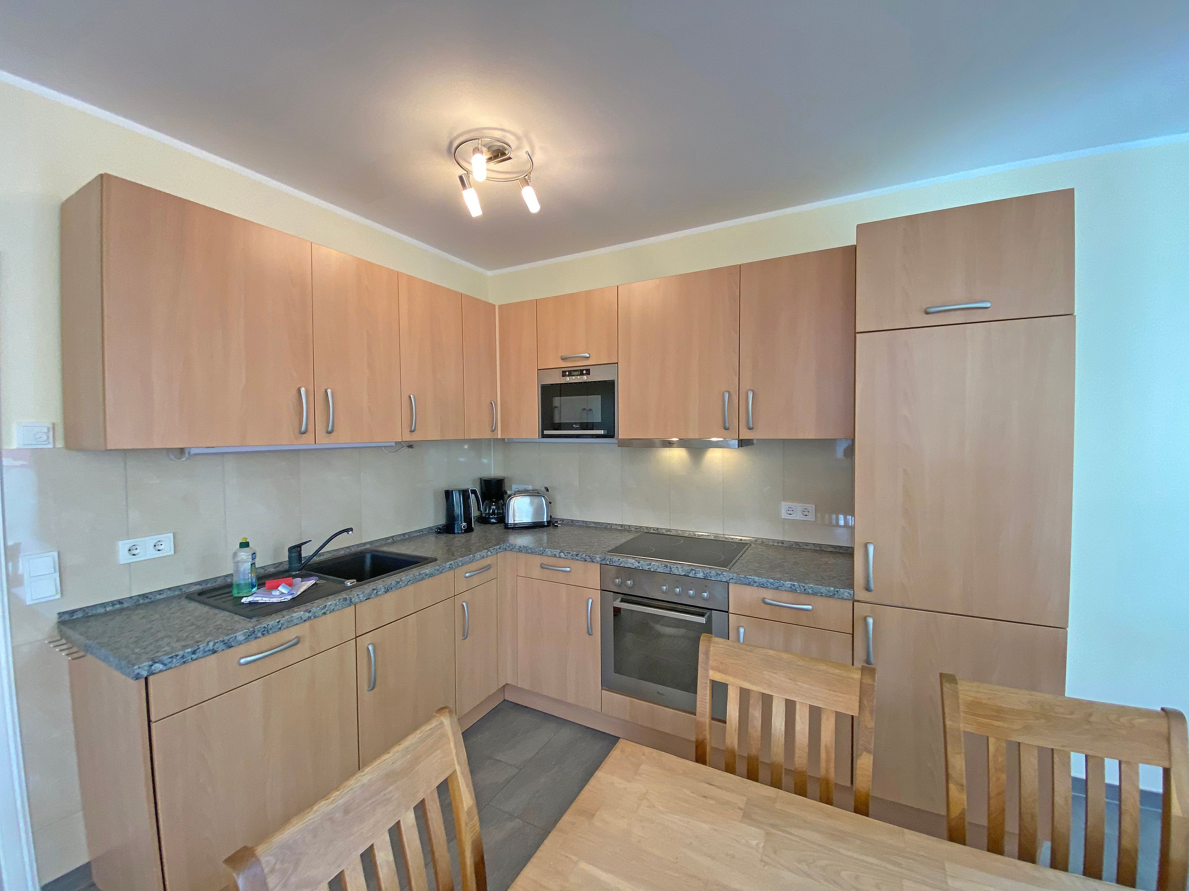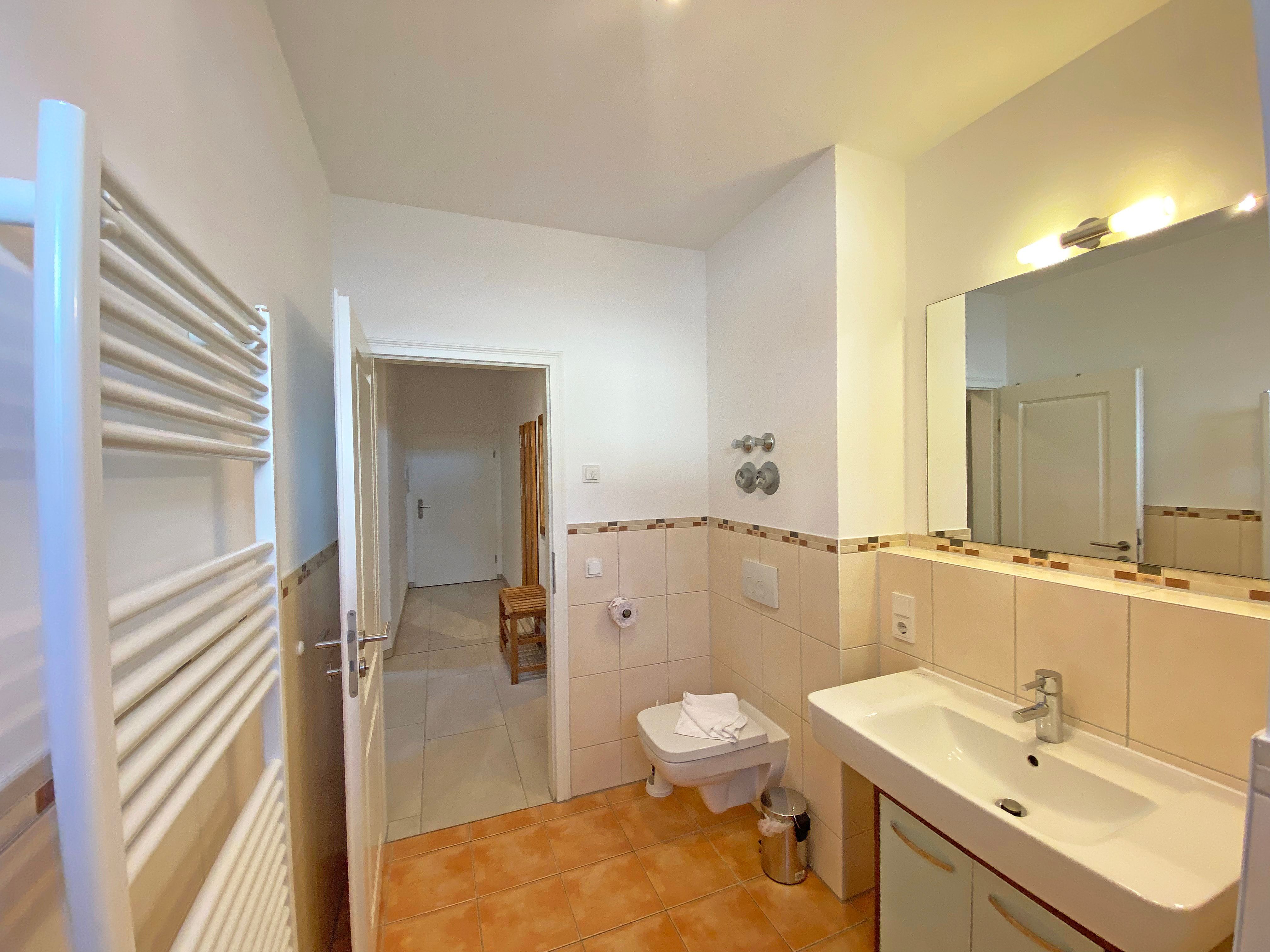 Die gemütliche und sehr großzügig eingerichtete Nichtraucherwohnung Nr. 10 befindet sich im 1. Obergeschoss der Villa Annika und umfasst ca. 93 qm. Die 4-Raumferienwohnung mit Ihren 3 Schlafzimmern bietet ausreichend Platz für max. 6 Erwachsene sowie 1 Kleinkind bis 3 Jahre im Kinderreisebett. Der Wohn-/Essbereich ist liebevoll und geschmackvoll eingerichtet und ist Dreh- und Angelpunkt der Ferienwohnung. Der Wohnbereich verfügt über eine gemütliche Eck-Couch mit einem Hocker, einen Couchtisch sowie einer Stehlampe. Zwei Vitrinen, ein TV-Board mit Flachbild-TV, einem WLAN-Zugang, ein DVD-Player und CD-Player runden den Wohnbereich ab. Die angrenzende moderne Küchenzeile ist mit jeglichem Komfort ausgestattet. Ein 4 Zonen-Ceranfeld, ein Backofen, ein Geschirrspüler, ein Kühlschrank mit Gefrierfach, eine Mikrowelle, ein Wasserkocher, ein Toaster, einer Kaffeemaschine sowie diverse Küchenutensilien und ein Esstisch bieten genügend Platz zum Kochen und Essen. Alle 3 separaten Schlafzimmer können vom Flur aus erreicht werden. Das 1. Schlafzimmer besteht aus einem Doppelbett (2 x 0,90m x 2,00m), 2 Nachtischkonsolen mit Beleuchtung, einem Sideboard mit Flachbild-TV und einem Kleiderschrank. Das 2. Schlafzimmer bietet Ihnen 2 Einzelbetten (0,90m x 2,00m), 2 Nachtischkonsolen mit Beleuchtung und einem Kleiderschrank. Das 3. Schlafzimmer ist mit einem Etagenbett (0,90m x 2,00m) für Kinder, einem Schreibtisch und einem Highboard ausgestattet. Alle Schlafzimmer verfügen über eine Verdunkelungsmöglichkeit sowie Insektenschutzgitter. Als Highlight bietet Ihnen die Wohnung zwei komfortable Bäder. Das 1. innenliegende Badezimmer verfügt über einen Waschtisch, ein WC, einen Fön, einen Handtuchtrockner sowie eine Dusche mit flachem Einstieg. Das 2. Tageslichtbad verfügt über einen Waschtisch, einen Handtuchtrockner, ein WC und eine Dusche mit flachem Einstieg. In allen Räumen sorgt eine Fußbodenheizung für eine angenehme Wärme. Eine Waschmaschine welche sich im Abstellraum der Wohnung befindet steht Ihnen inklusive zur Verfügung. Hier finden Sie auch diverse Reinigungsutensilien. Der an den Wohn- Essbereich angrenzende und bestuhlte Balkon (West), ist für Sie bequem durch die großen Balkontüren erreichbar. Für unsere kleinen Gäste stehen 1x Kinderreisebett (ohne zusätzliche Matratze und Bett Inletts) und 1x Hochstuhl inklusive zur Verfügung. Ihr PKW-Stellplatz Nr.10 befindet sich in der hauseigenen Tiefgarage (Einfahrtshöhe 1,90m). Eine begrenzte Fahrradabstellmöglichkeit befindet sich in der Tiefgarage sowie direkt vor der Hauseingangstür. Haustiere sind leider in unserer Wohnung nicht erlaubt. Die Erstausstattung eines Wäschepaketes (komplette Bettwäsche, 1 Duschhandtuch, 1 kleines Handtuch) können Sie bis 14 Tage vor Anreise gegen einen Aufpreis dazu buchen oder durch eigene ergänzen. Ab 2 gebuchten Paketen erhalten Sie einmalig 1 Geschirrhandtuch und 1 Duschvorleger hinzu.
