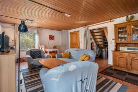 Großzügige Ferienwohnung (ca. 82 m²) für bis zu 6 Personen (4 Erwachsene und 2 Kinder). Im Erdgeschoss befindet sich das Wohn-/Esszimmer, die voll ausgestattete Küche, 1 Schlafzimmer mit Doppelbett und das Kinderzimmer mit einem Stockbett. Ein barrierearmes Badezimmer mit Dusche, WC und Waschmaschine ist ebenfalls im Erdgeschoss. Das Obergeschoss bietet ein weiteres Schlafzimmer mit Doppelbett und eine gemütliche Lounge mit Bibliothek, Sesseln und Schlafcouch. Ein Mini-Kicker/Tischtennis/Shuffelboard ist ebenso vorhanden. Große Terrasse mit kleinem Garten, Terrassenmöbeln und Grill. Ein PKW-Stellplatz ist direkt vor der Wohnung, weitere Stellplätze auf dem Grundstück. Freier Zugang zum großen Garten.