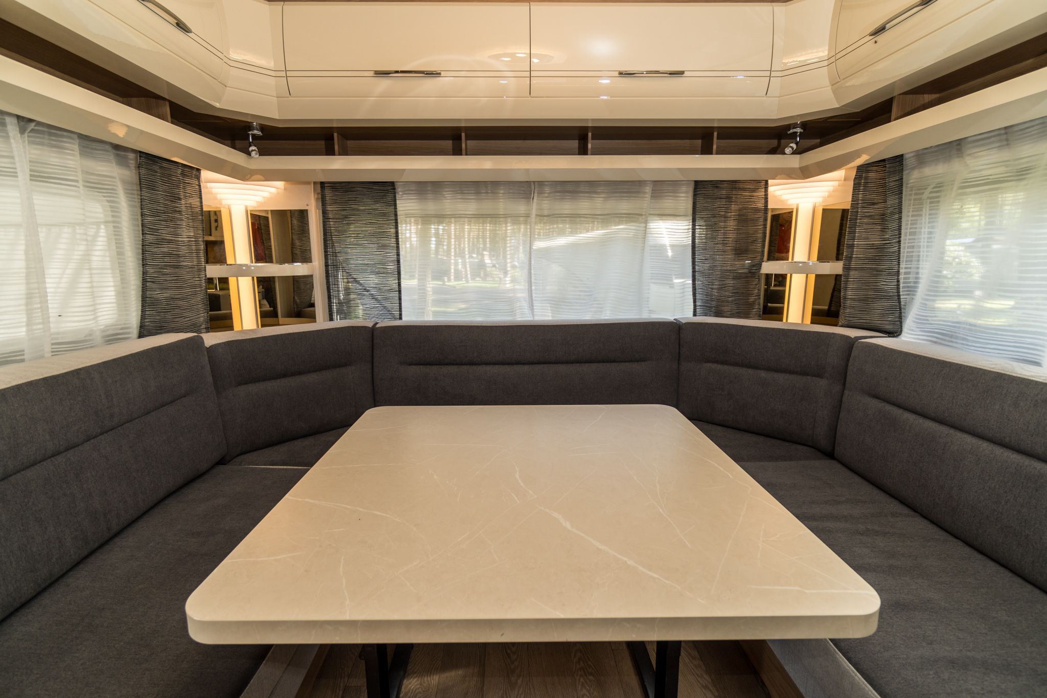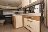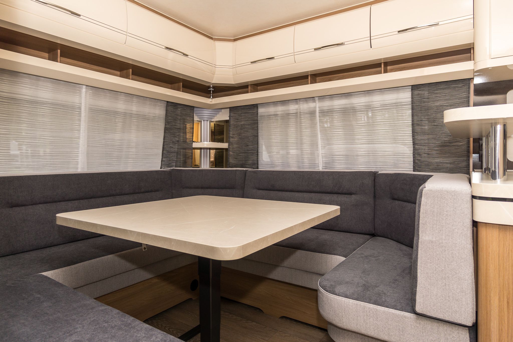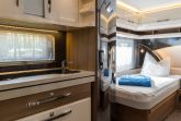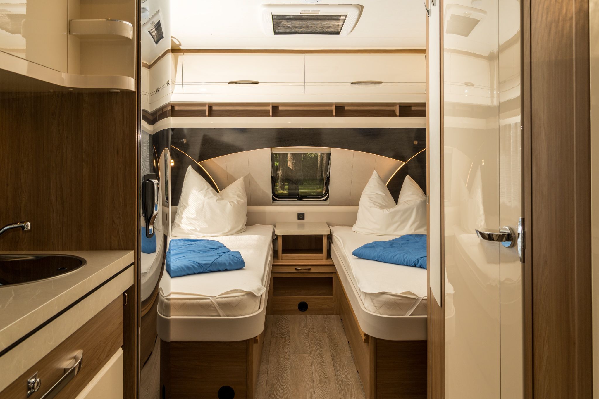 Moderner Wohnwagen mit Schlafmöglichkeiten für vier Erwachsene.
