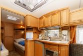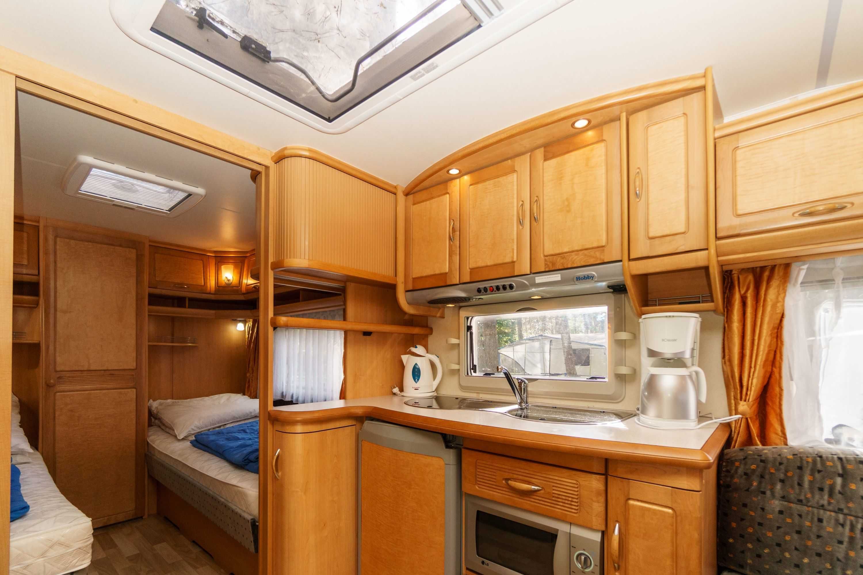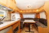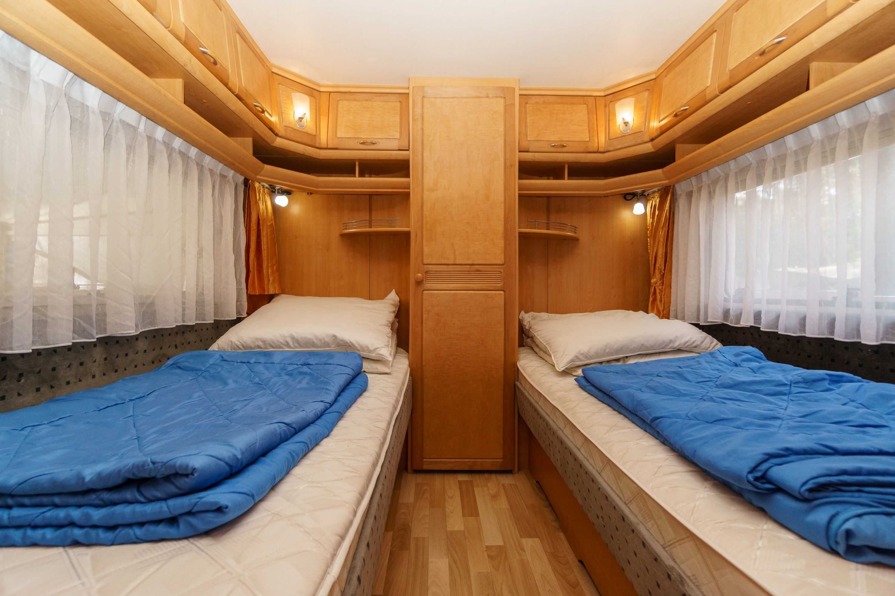 Moderner Wohnwagen mit Schlafmöglichkeiten für vier Personen. Es gibt zwei einzelne Betten und eine Sitzgruppe, die einfach zum Bett umgebaut wird. In den Wohnwagen sind Toiletten vorhanden. Weitere Toiletten und die Duschen befinden sich separat im Sani-Haus.