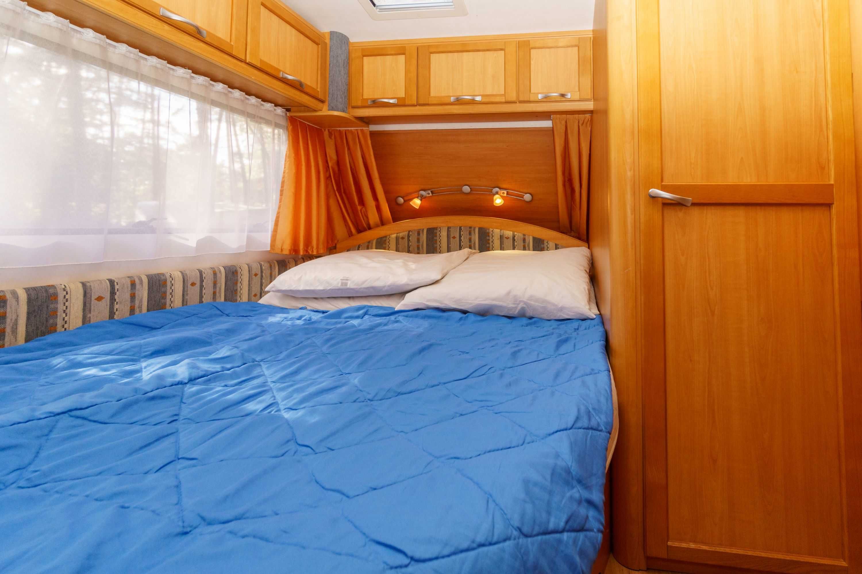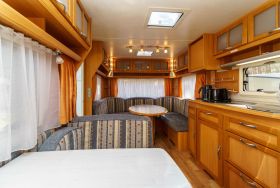 Moderner Wohnwagen mit Schlafmöglichkeiten für vier Personen. Es gibt ein französisches Bett und eine Sitzgruppe,  zum Bett umgebaut wird. In den Wohnwagen sind Toiletten vorhanden. Weitere Toiletten und die Duschen befinden sich separat im Sani-Haus.