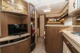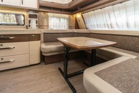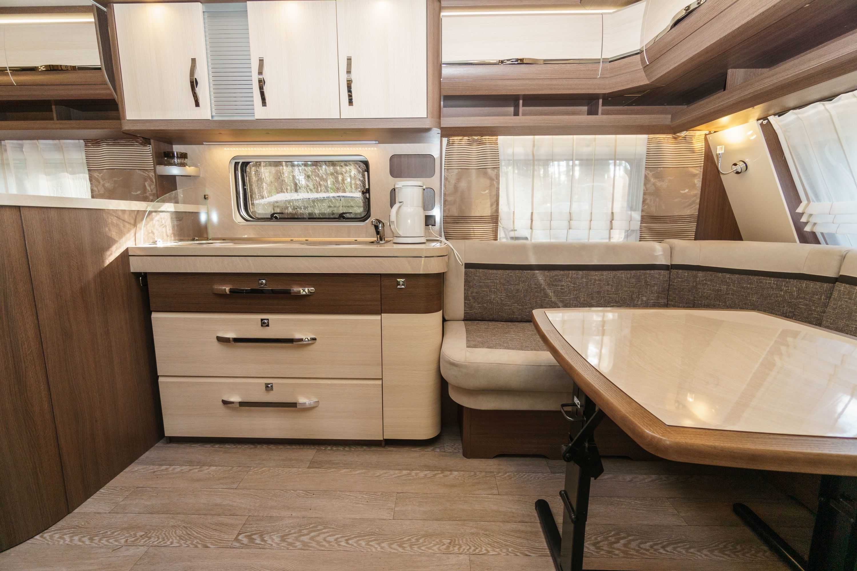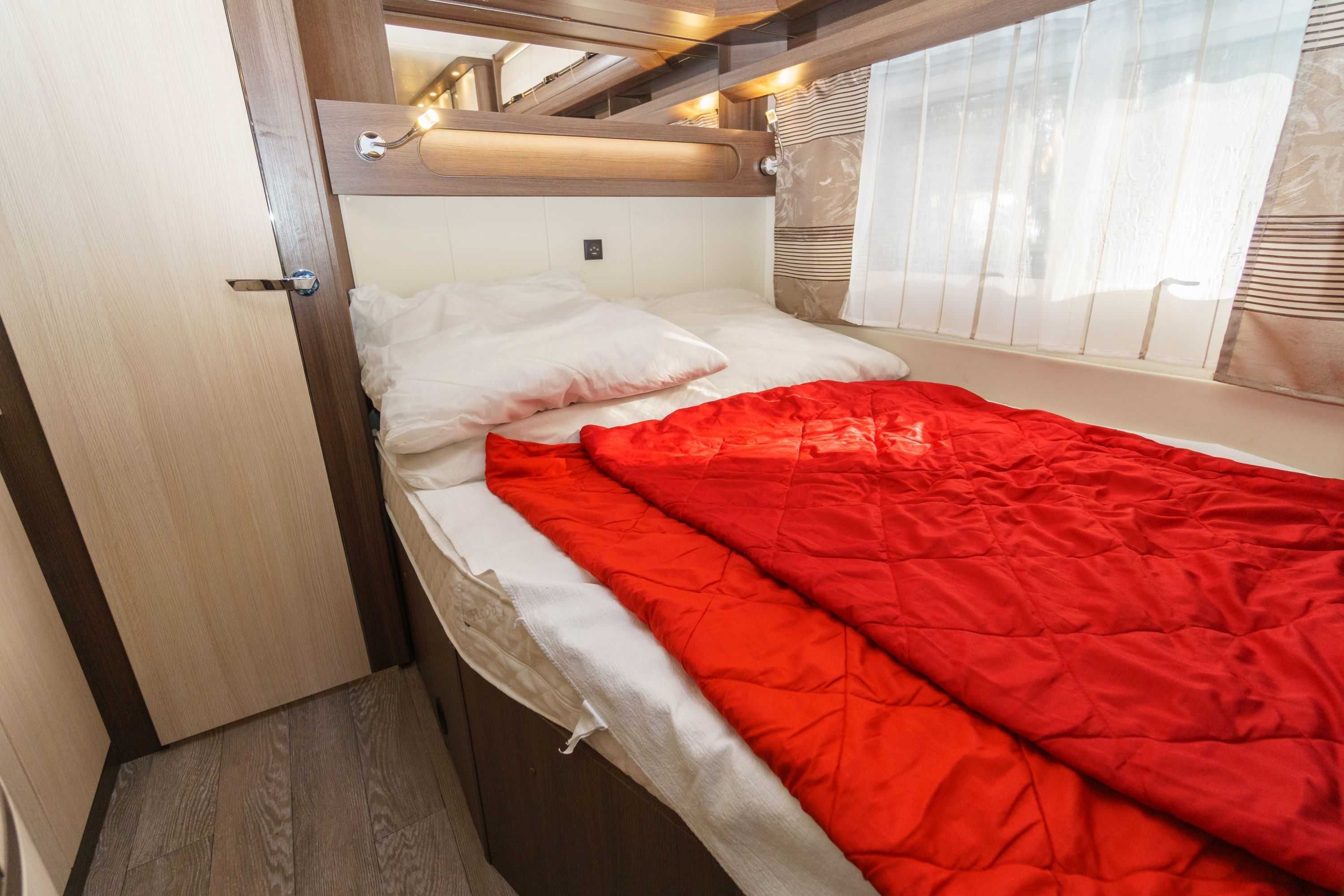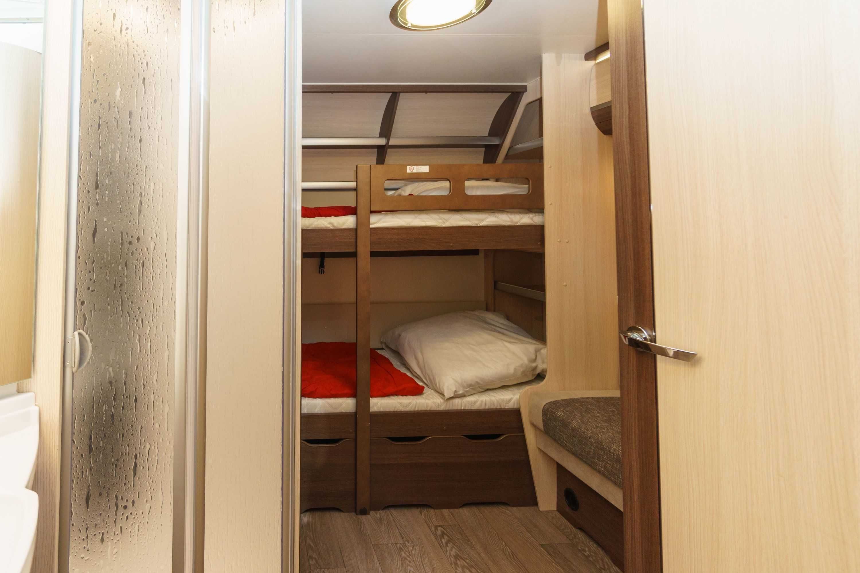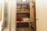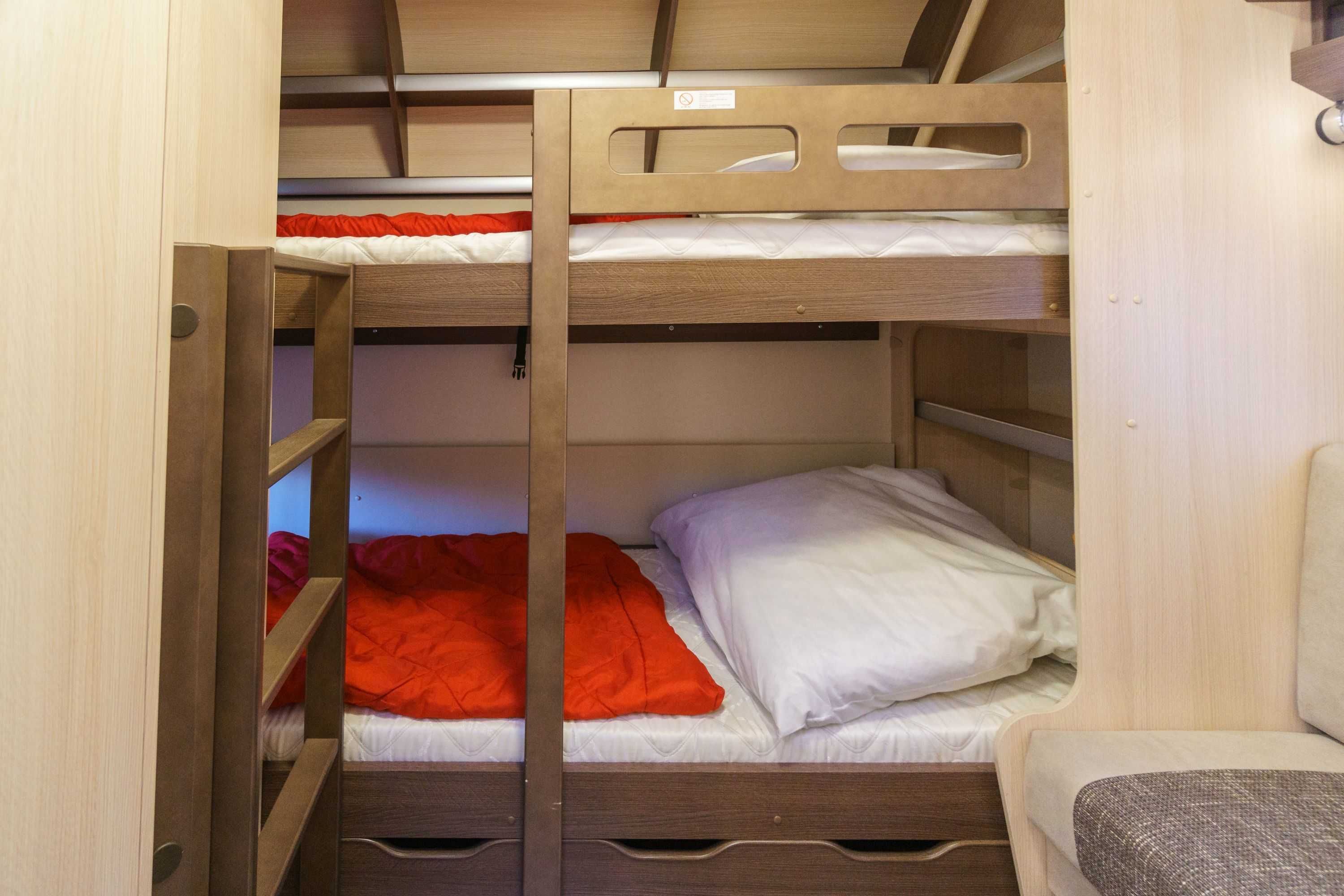 Moderne Wohnwagen mit Schlafmöglichkeiten für zwei Erwachsene und zwei Kinder bzw. Jugendliche.