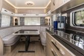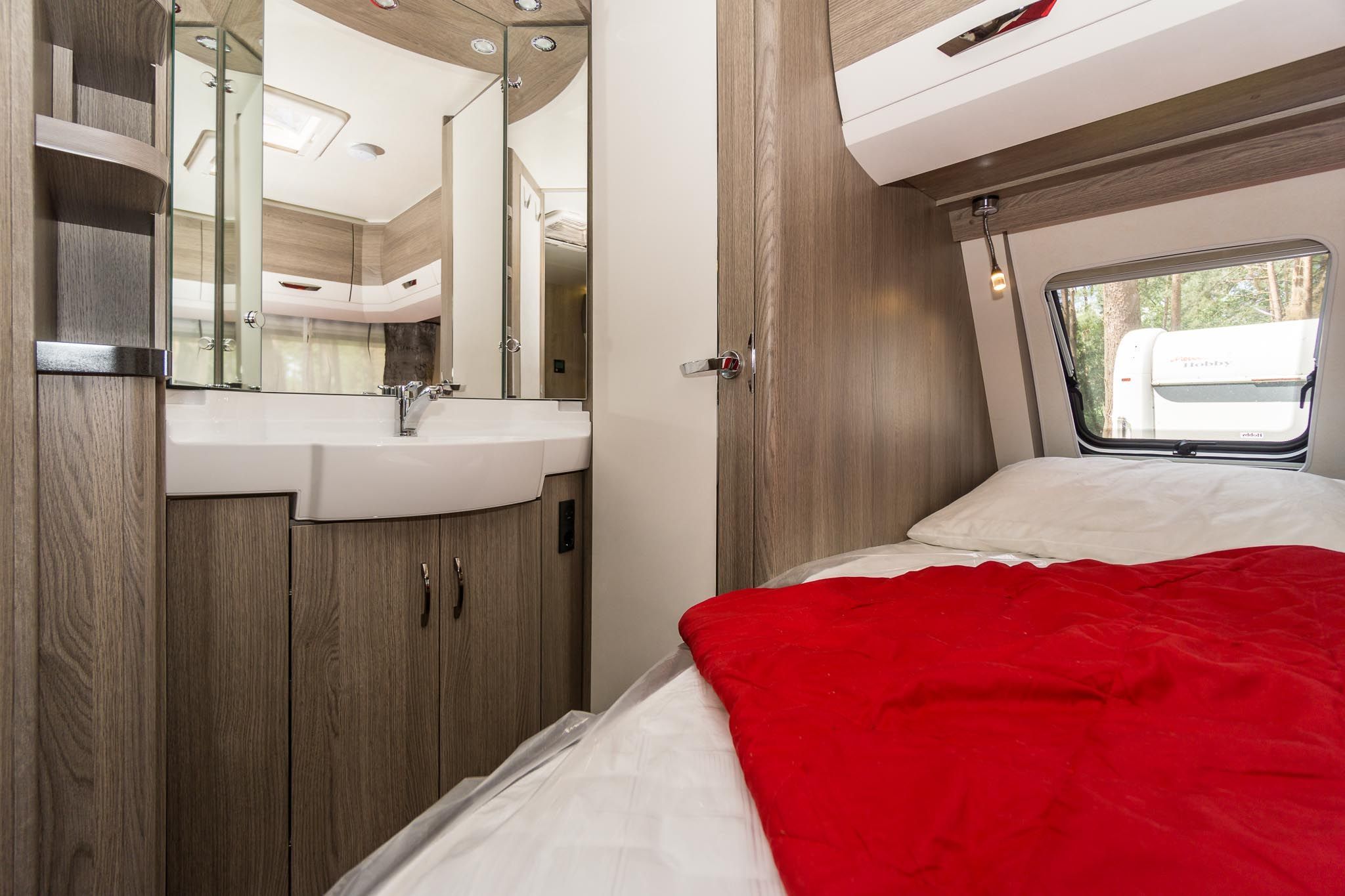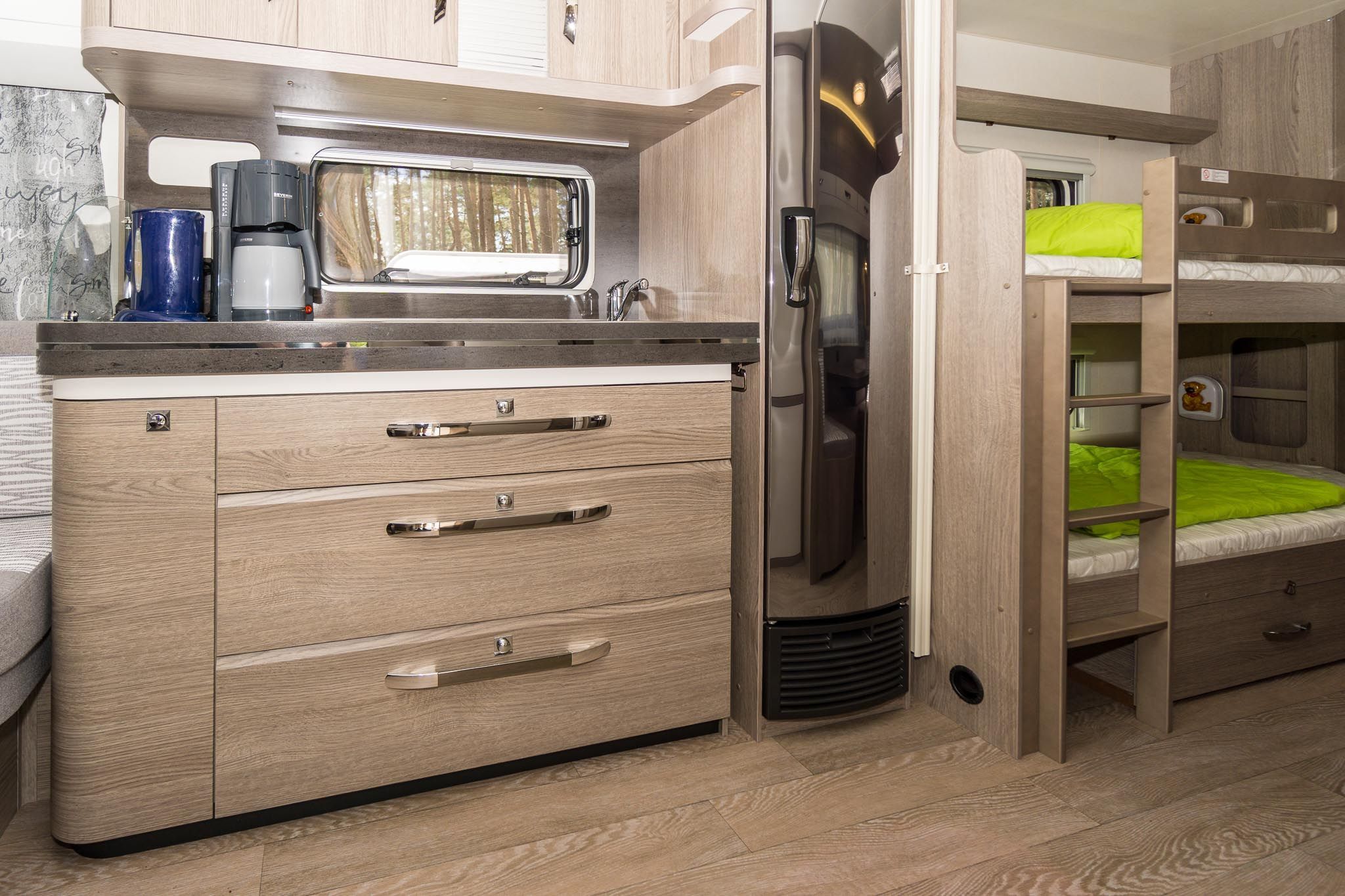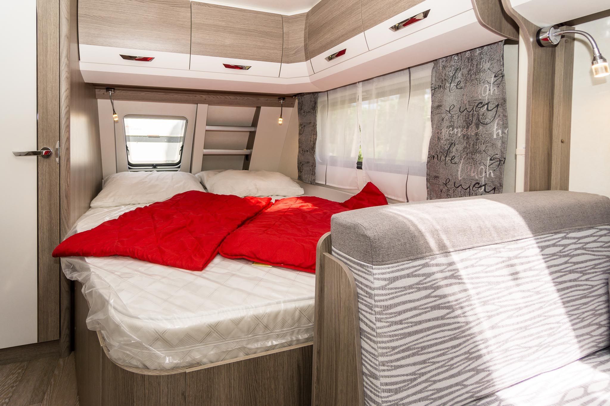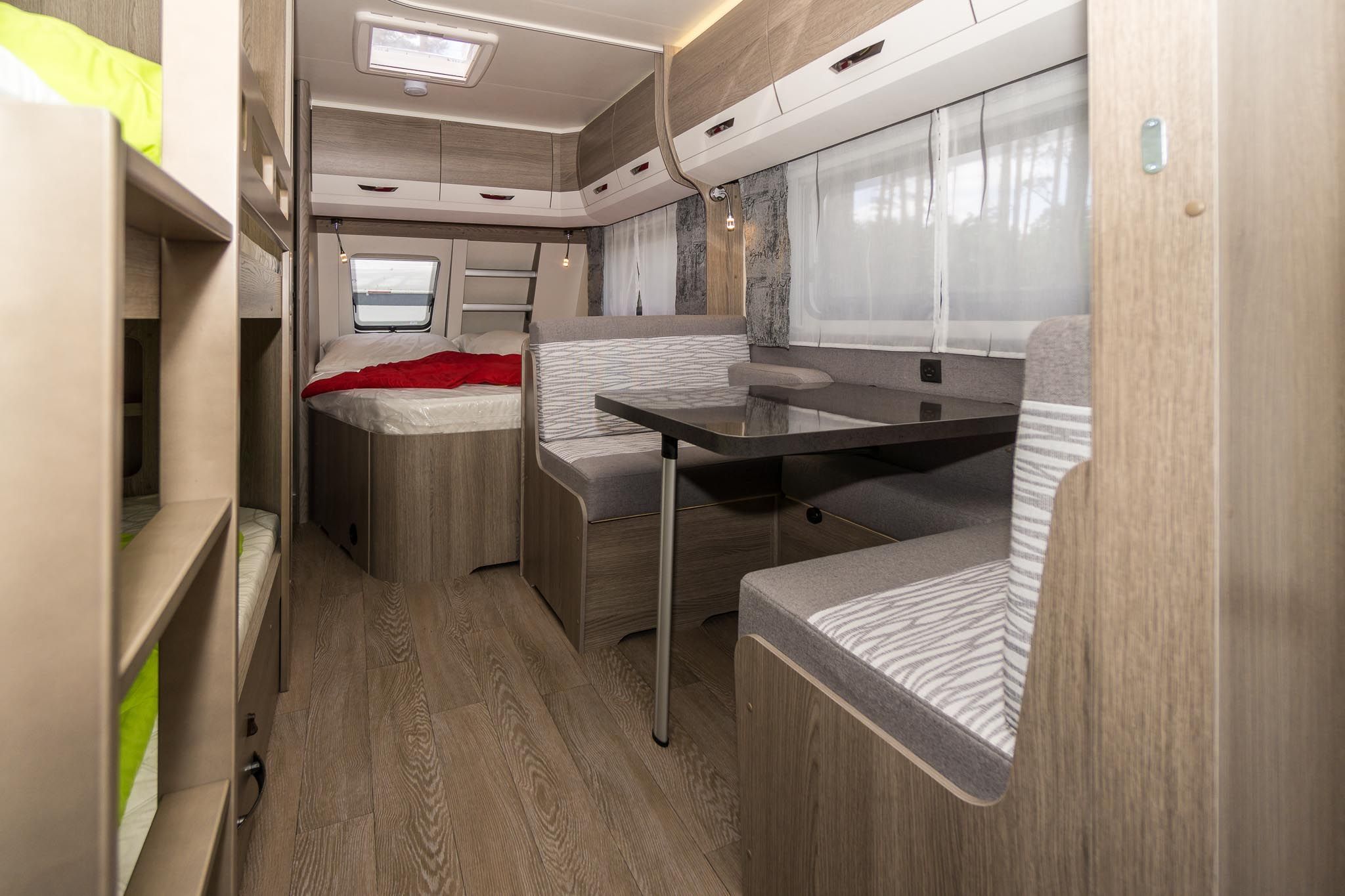 Moderner Wohnwagen mit Schlafmöglichkeiten für zwei Erwachsene und zwei Kinder bzw. Jugendliche.