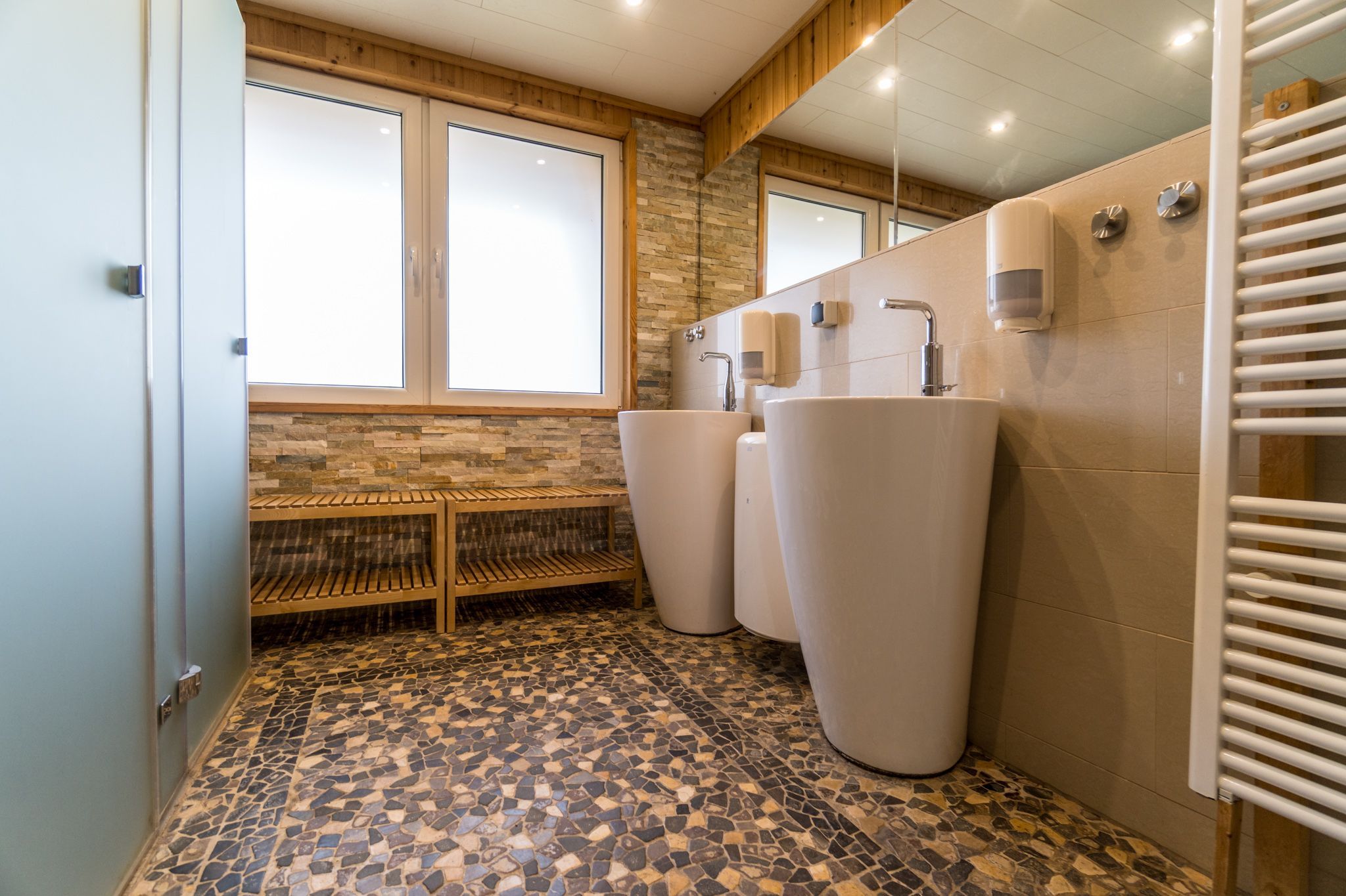 In allen Wohnwagen gibt es eine Toilette. Weitere Toiletten und die Duschen befinden sich separat im 2015 modernisierten Sani-Haus. Hier finden Sie auch einen Wickelbereich für Babys.