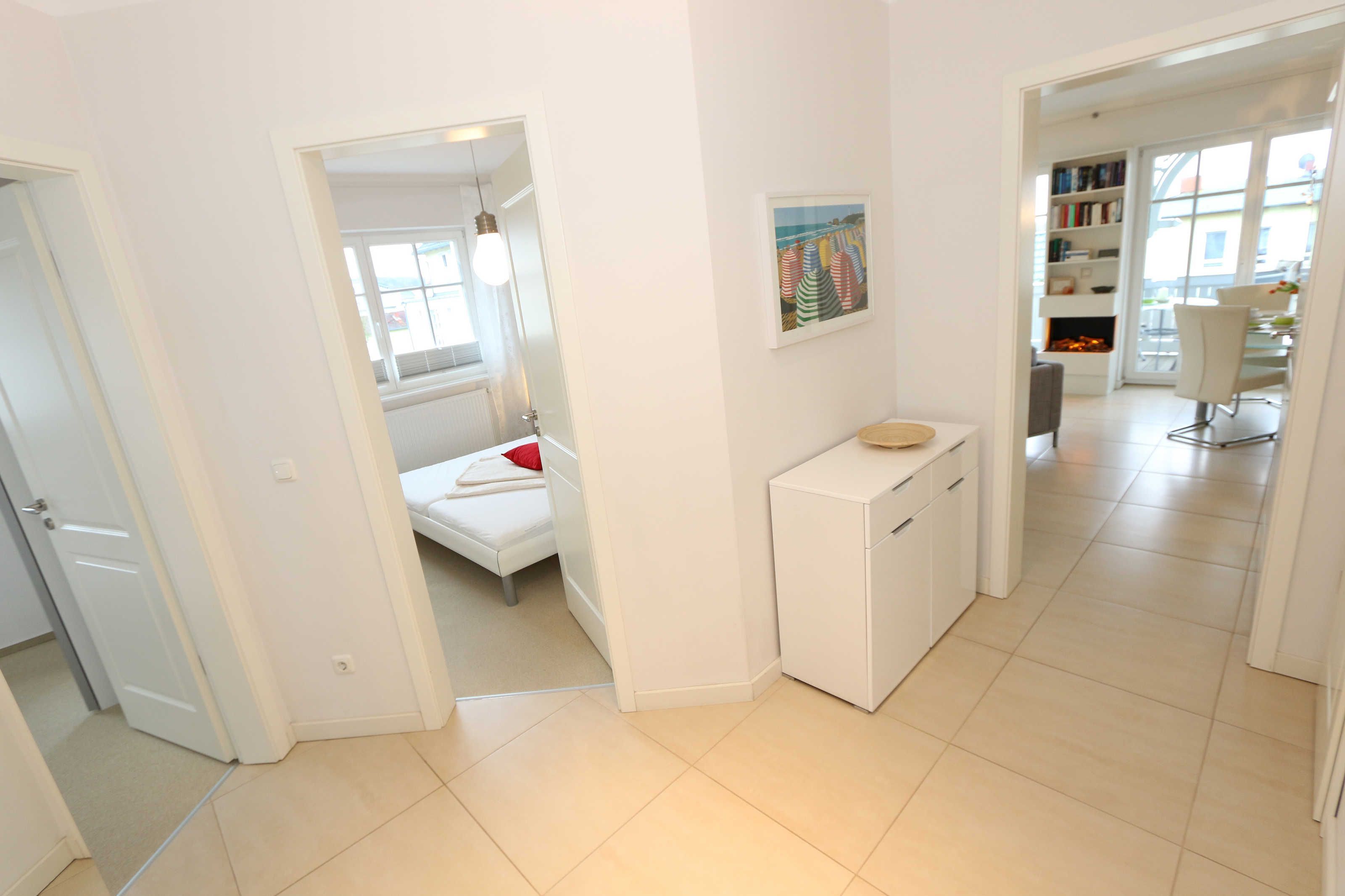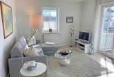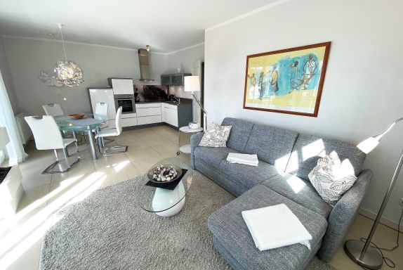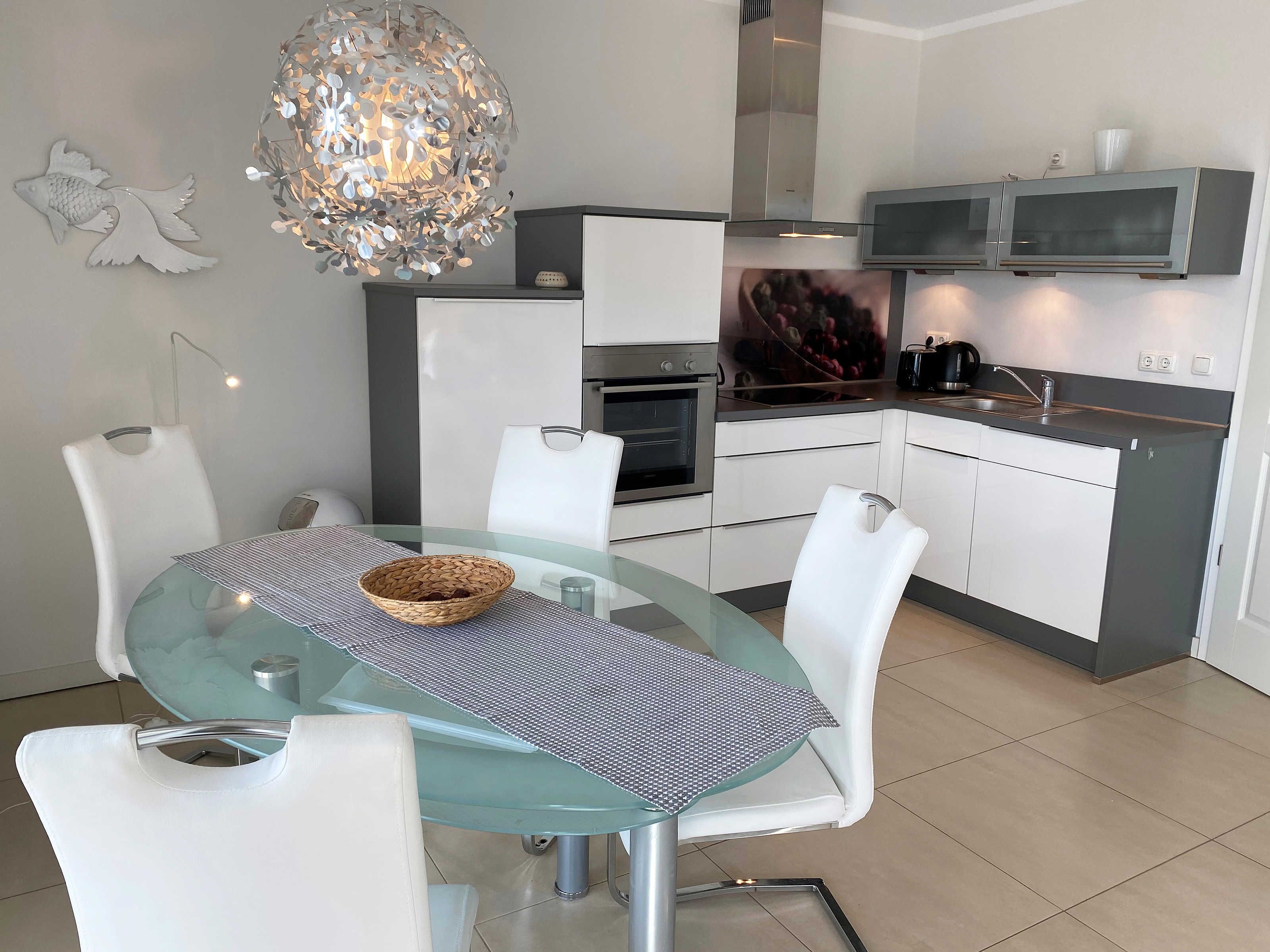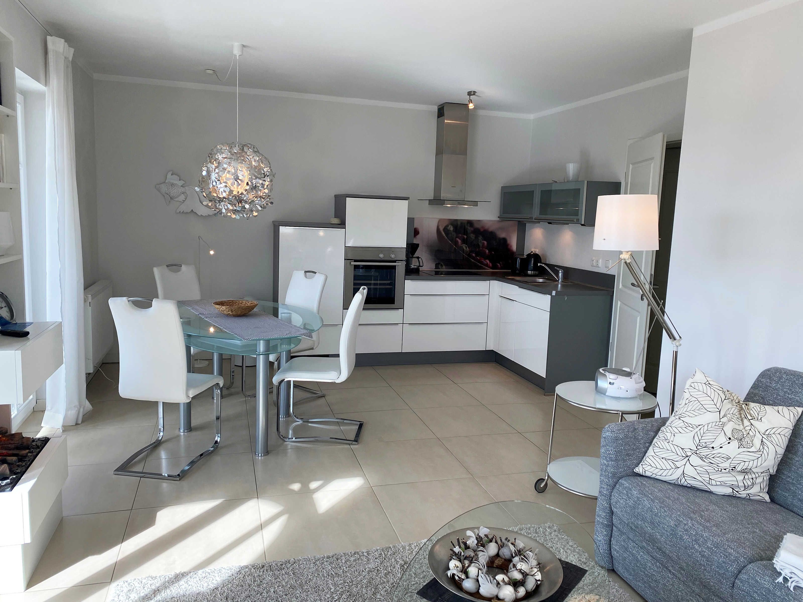 Die helle Nichtraucherwohnung mit Fliesenboden und Teppich in den Schlafzimmern ist geschmackvoll eingerichtet. Mit Ihren ca. 66qm bietet Sie ausreichend Platz für max. 2 bis 4 Personen. Die harmonisch integrierte Küchenzeile erlaubt mit einer Heißluft-Mikrowelle und Grill in Kombination, Ceran-Kochfeld, Backofen, Spülmaschine, Kühlschrank mit Gefrierfach, Wasserkocher, Toaster, Kaffeemaschine, Senseo Pad-Maschine, Kaffeeautomat und anderen praktischen Helfern die weitreichende Umsetzung Ihrer kulinarischen Wünsche. Angrenzend befindet sich ein bequemer Esstisch. Die beiden Schlafzimmer sind mit bequemen Betten (je 1,80 m x 2,00 m), verstellbare Lattenroste und reichlich Schrankfläche ausgestattet. Der Wohnbereich wird mit einer Couch, ein Sessel, ein Couchtisch, Leselampe sowie einem Regal und TV-Board abgerundet. Ein Smart-TV im Wohnzimmer und in einem der Schlafzimmer sowie DVD-Player, Musikanlage mit DAB-Radio, Gesellschaftsspiele und eine kleine Bücherauswahl sorgen neben einem kostenlosen WLAN-Anschluss für Ihre Unterhaltung. Ein Elektrokamin im Wohnbereich lädt bei etwas schlechterem Wetter zum Verweilen ein und sorgt für die perfekte Illusion eines realen Feuers. Das großzügige Bad mit Fußbodenheizung, WC, Fön, Kosmetikspiegel, Badhocker, Waschplatz und ebenerdiger Regendusche verspricht den erholsamen Wellness-Effekt. In dem vorhandenen Abstellraum befindet sich eine Waschmaschine zur freien Nutzung. Zusätzlich befinden sich hier Reinigungsutensilien, ein Bügelbrett sowie ein Bügeleisen. Für unsere kleinen Gäste steht ein Hochstuhl inklusive zur Verfügung. Ihre Fahrräder und Strandutensilien lassen sich in einem abschließbaren Schuppen neben Ihrem PKW-Stellplatz (Nr.03) unterbringen. Haustiere sind nicht erlaubt. Die Erstausstattung eines Wäschepaketes (komplette Bettwäsche, 1 Duschhandtuch, 1 kleines Handtuch) können Sie bis 14 Tage vor Anreise gegen einen Aufpreis dazu buchen oder durch eigene ergänzen. Ab 2 gebuchten Paketen erhalten Sie einmalig 1 Geschirrhandtuch und 1 Duschvorleger dazu.