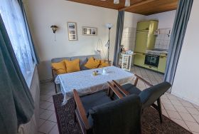 Die ca. 40 m² große Ferienwohnung mit Flur, Wohnzimmer, Duschbad/WC und zwei Schlafräumen ist für 3 Personen geeignet. Sie ist zentralbeheizt, die Böden sind gefliest, im Wohnzimmer liegt ein Teppich. Bad und Doppelzimmer grenzen an das Wohnzimmer. Durch das Doppelzimmer (Durchgangszimmer) erreicht man das zweite Schlafzimmer (Kinderzimmer). Im Kinderzimmer sind Teppichböden und ein Einzelbett (80x200 cm ausziehbar) .  Handtücher, Küchentücher und Bettwäsche werden gestellt und wöchentlich gewechselt.