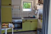 Die Wohnung hat eine zum Wohnzimmer hin offene farbige Einbauküche mit Backofen, Cerankochfeld, Spüle und Einbaukühlschrank mit Gefrierfach. Kaffeemaschine, Wasserkocher, Eierkocher und Toaster sind vorhanden. Geschirr, Besteck, Gläser, Kochtöpfe etc. sind für 8 Personen vorhanden.