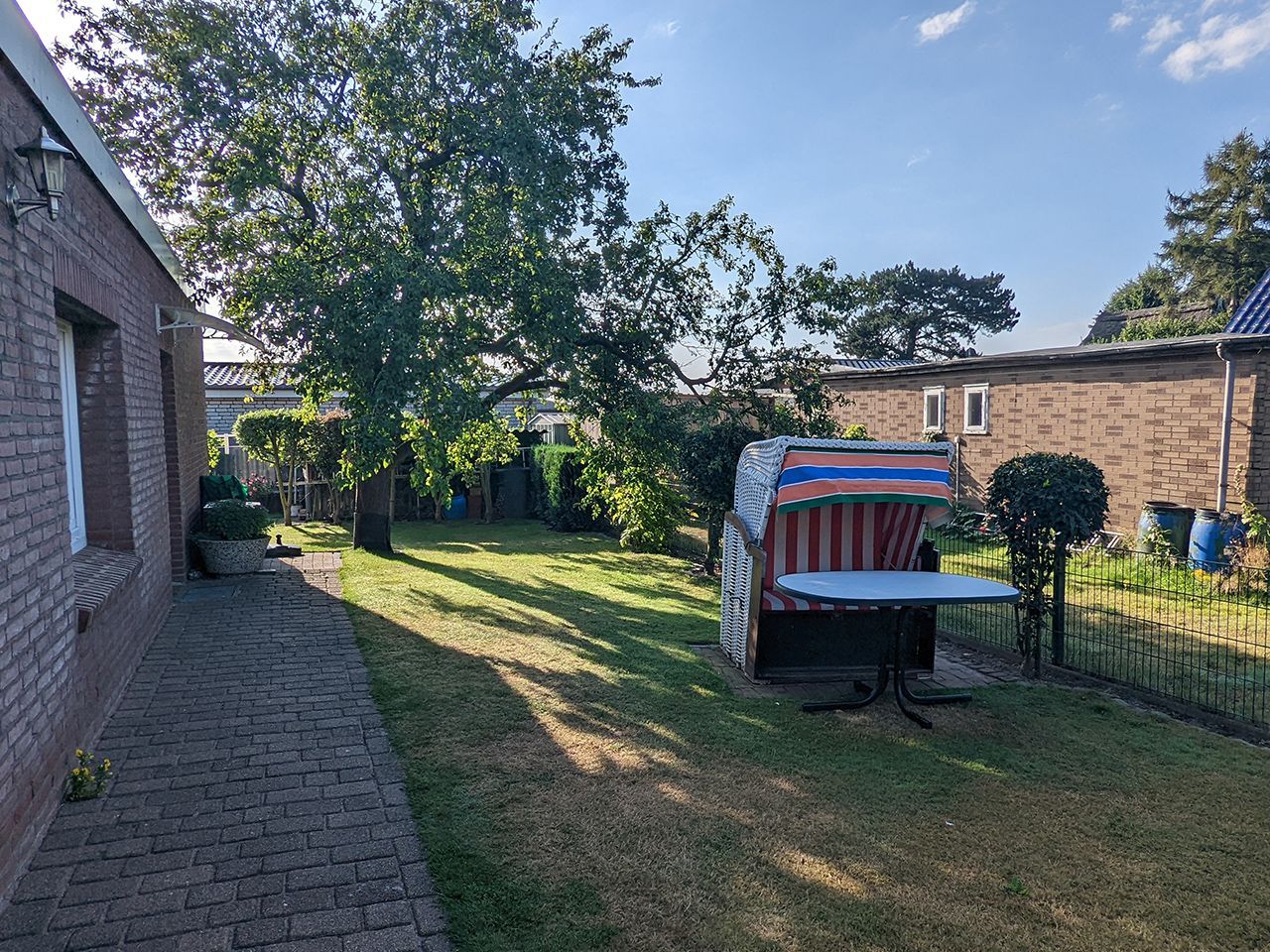 Der große Garten mit Gartenmöbeln und Strandkorb lädt zum Verweilen ein.
