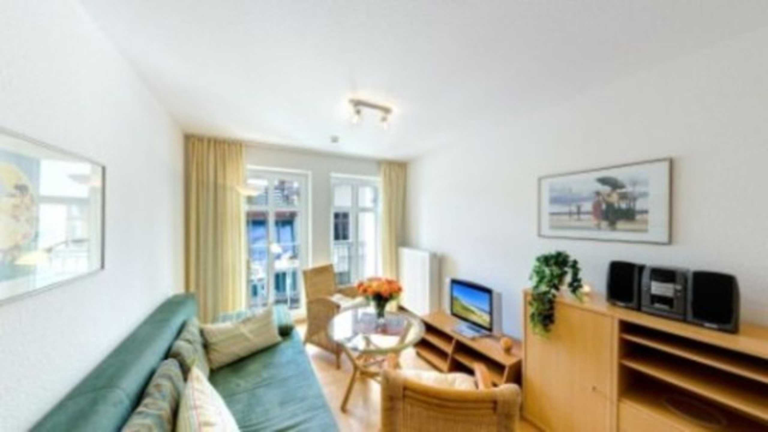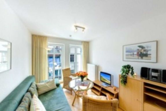 1. Reihe, direkt an der Strandpromenade mit BALKON und FAHRSTUHL im Haus! Schönes geräumiges 2-Zimmer-Apartment (ca. 42 m²) mit moderner guter Ausstattung. Separates Schlafzimmer, Wohnzimmer mit Essplatz und Schlafcouch, Küchenbereich, Duschbad, Balkon nach Westen mit Abendsonne. Die Wohnung verfügt über einen Tiefgaragen-Pkw-Stellplatz. In der Garage können auch Fahrräder und ähnliches untergestellt werden. In unserer Villa Germania nebenan gibt es eine Sauna. Von der Villa Aquamarina sind es zum Ortszentrum und der Seebrücke ca. 3 Minuten zu Fuß. Zum Strand sind es 50 m.