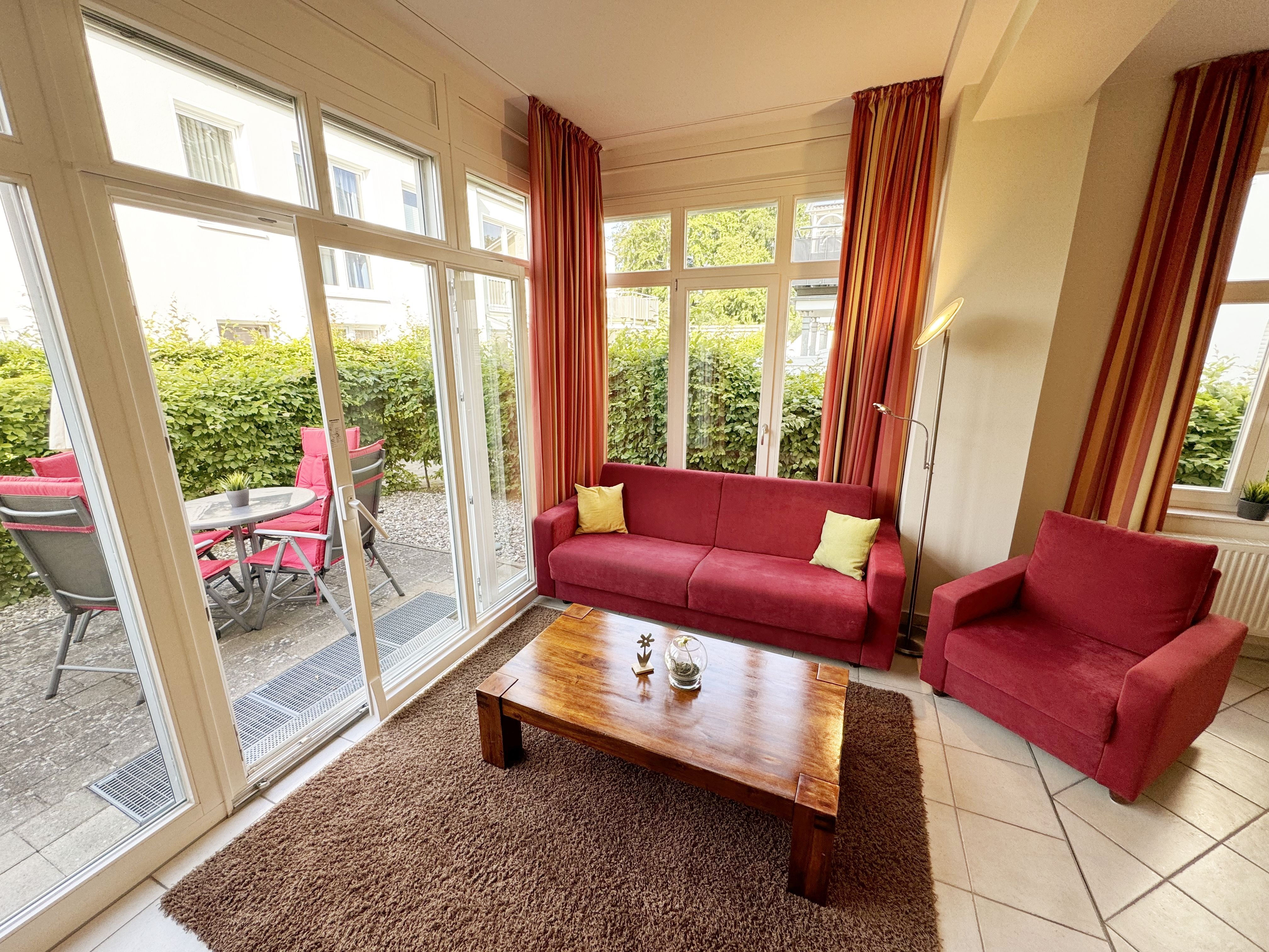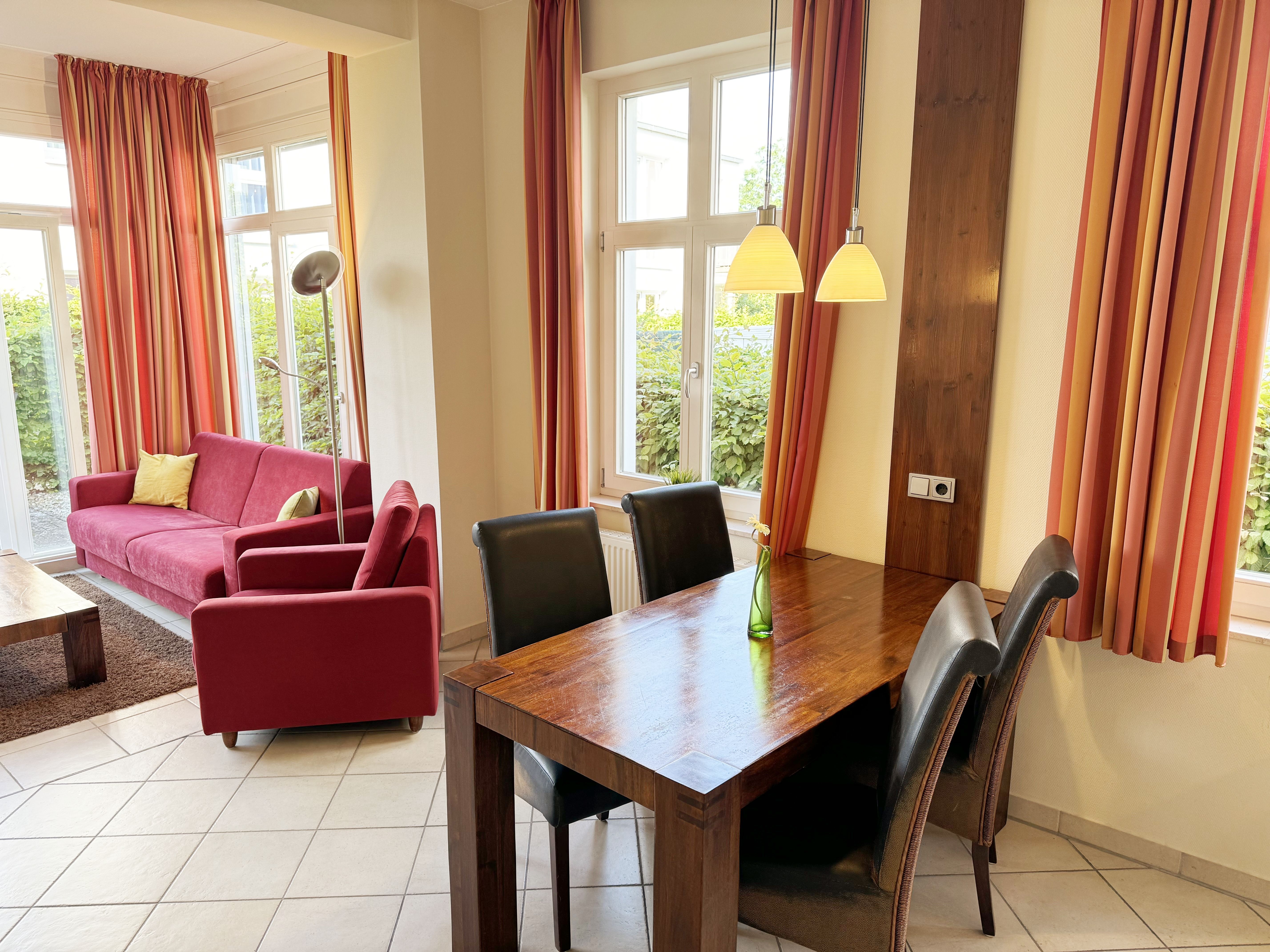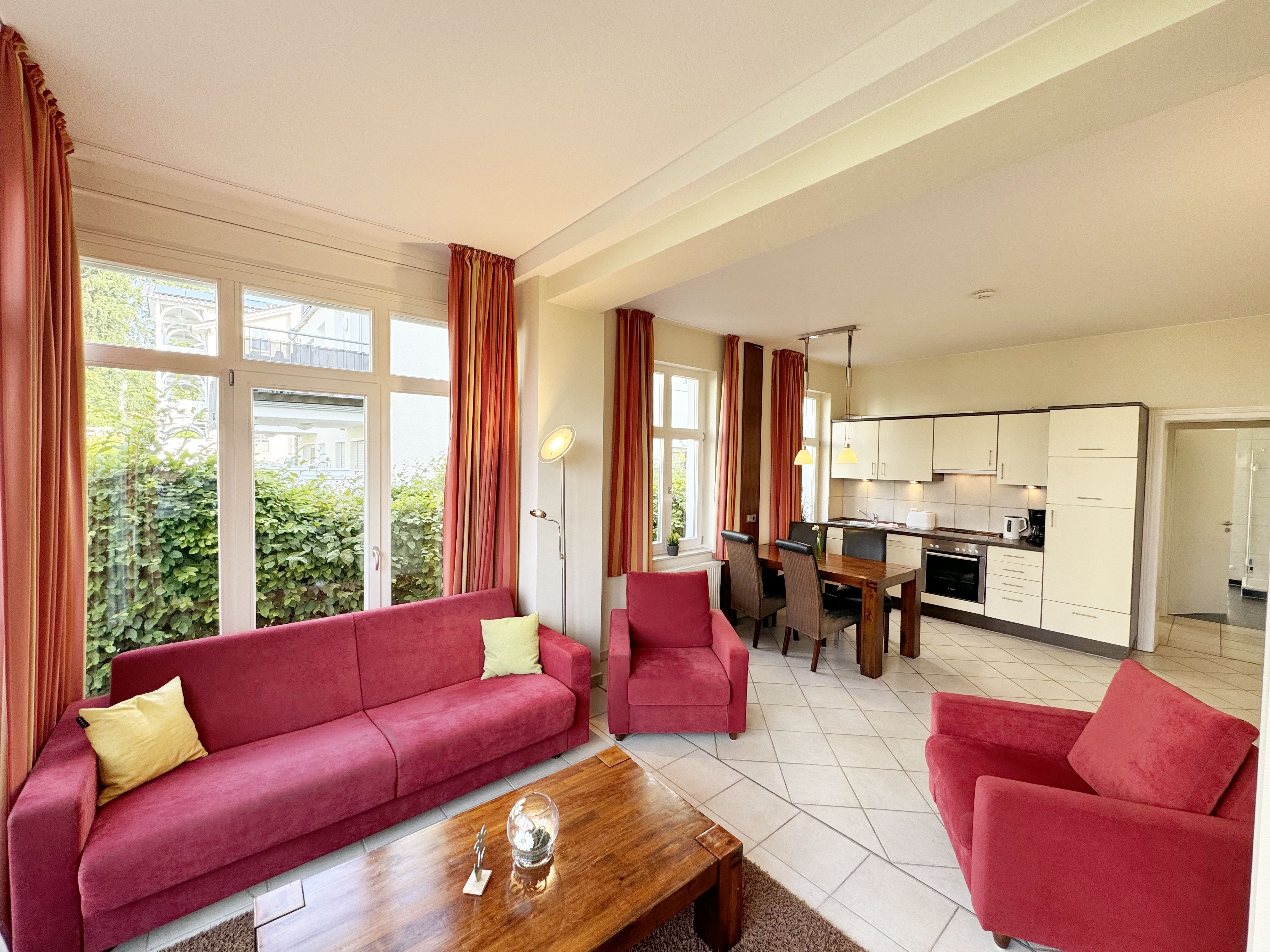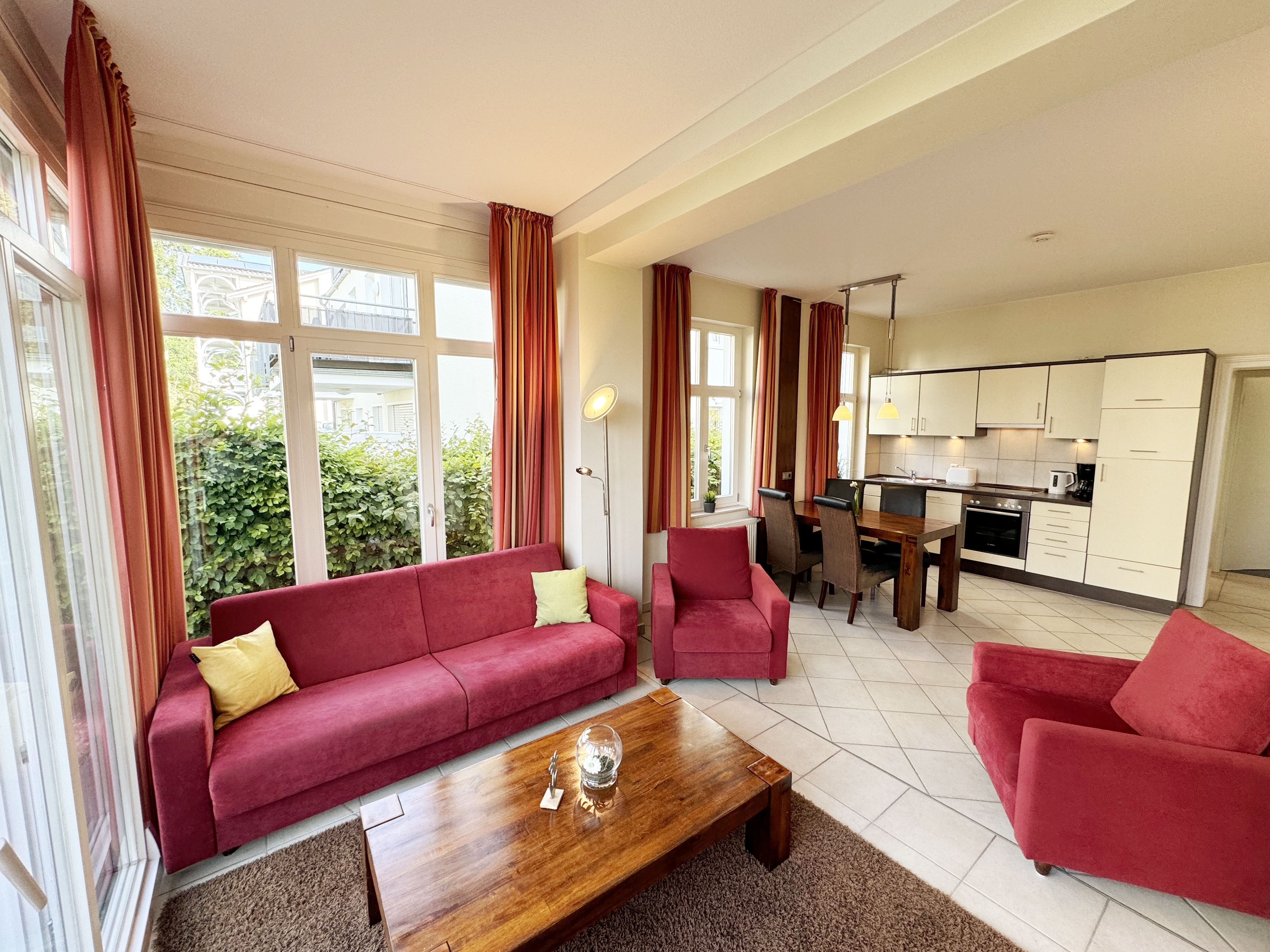 Die geschmackvolle und mit Liebe zum Detail eingerichtete 2-Raum / Nichtraucherwohnung befindet sich im Erdgeschoss der historischen Villa Möwe. Die Wohnung Nr. 2 umfasst eine Größe von ca. 52 qm und bietet genug Platz für 2 Personen und 2 Aufbettungen. Ein Kleinkind bis 3 Jahre kann im mitgebrachten bzw. dazugebuchten Kinderreisebett untergebracht werden. Der helle und großzügige Wohn-& Essbereich verfügt über einen gemütlichen Couchbereich mit einer hochwertigen Ausziehfunktion (1,60m x 2,00m), Couchtisch, 2 Sesseln, Leselampe, Anrichte mit einem Smart-TV, Blu Ray-Player, Radio mit CD-Player und Internetanschluss per WLAN (inklusive). Angrenzend finden Sie einen Holzesstisch mit 4 Stühlen, sowie eine komplett ausgestattete Küchenzeile mit Geschirrspüler, Ceranfeld, Backofen, Kühlschrank mit Eisfach, Mikrowelle, Kaffeemaschine, Nespresso Maschine, Toaster, Wasserkocher und diversen Küchenutensilien. Im separaten Schlafzimmer haben Sie ein Doppelbett (2x0,90m x 2,00m), Nachtischkonsolen, einen Kleiderschrank, Smart-TV, sowie Verdunklungsmöglichkeiten und Insektenschutzgitter, die für einen ruhigen Schlaf dienen. Der Sanitärbereich wird durch eine Dusche, WC, Fön, Kosmetikspiegel, Waschtisch, Fußbodenheizung und einen Handtuchtrockner abgerundet. Ihre bestuhlte Süd -Terrasse erreichen Sie durch den Wohnbereich. Die einem Wintergarten ähnelnden Wohnzimmerfenster sind komplett durch elektrische Rollläden abzudunkeln. Im Gemeinschafskeller können Sie gegen einen Aufpreis die gemeinschaftliche Waschmaschine und den Trockner nutzen. Die Wertmarken können Sie auf Nachfrage während Ihres Urlaubes erwerben. Die Erstausstattung eines Wäschepaketes (komplette Bettwäsche, 1 Duschhandtuch, 2 kleine Handtücher) können Sie bis 14 Tage vor Anreise gegen einen Aufpreis dazu buchen oder durch eigene ergänzen. Ab 2 gebuchten Paketen erhalten Sie einmalig 1 Geschirrhandtuch und 1 Duschvorleger hinzu. Ein eigener Pkw-Stellplatz Nr. 26 (Einfahrtshöhe Tiefgarage 2,10 m im Haus II) und ein Abstellraum im Keller (Haus I) gehören zur Wohnung. Haustiere sind in der Wohnung nicht erlaubt.