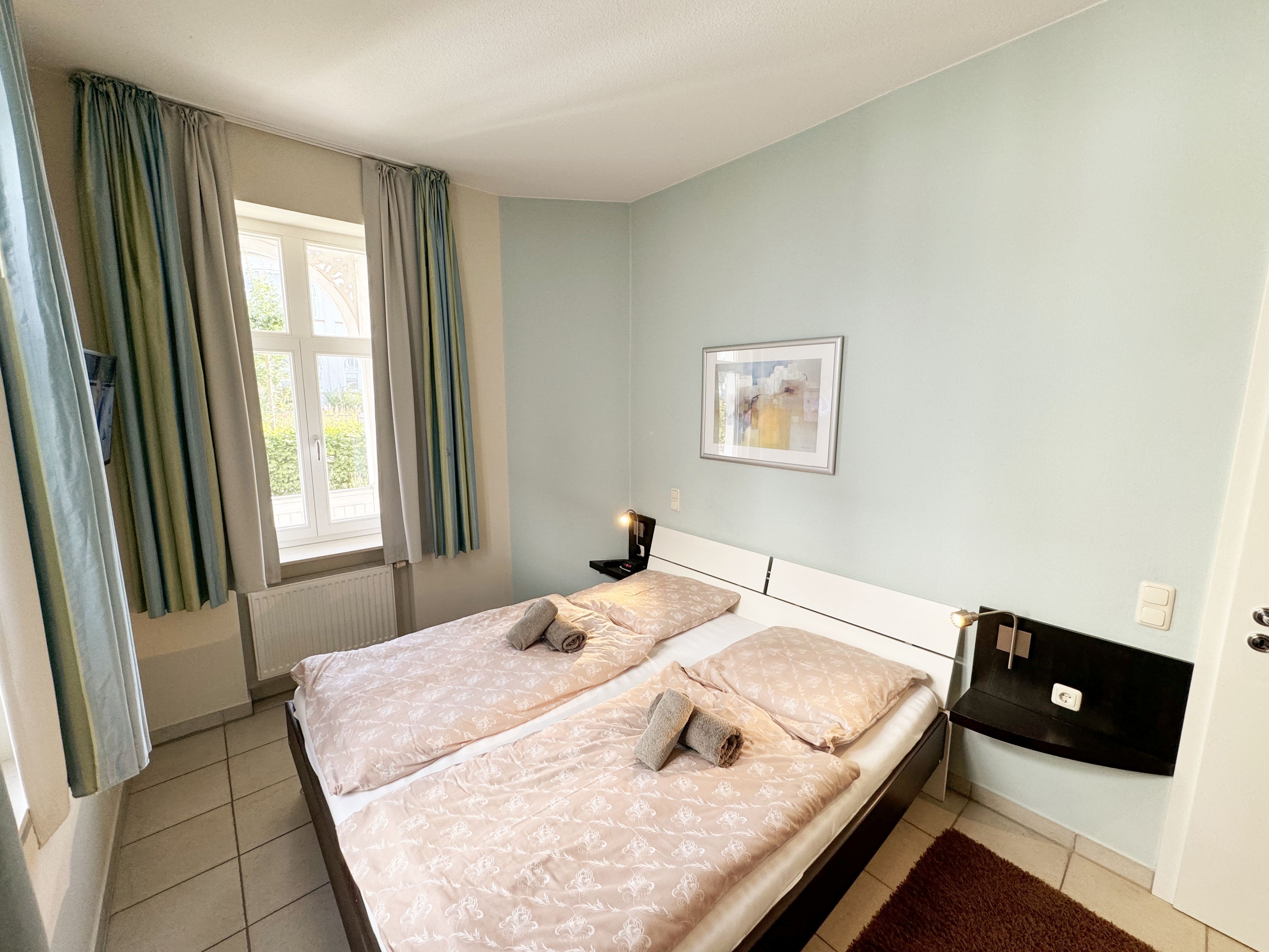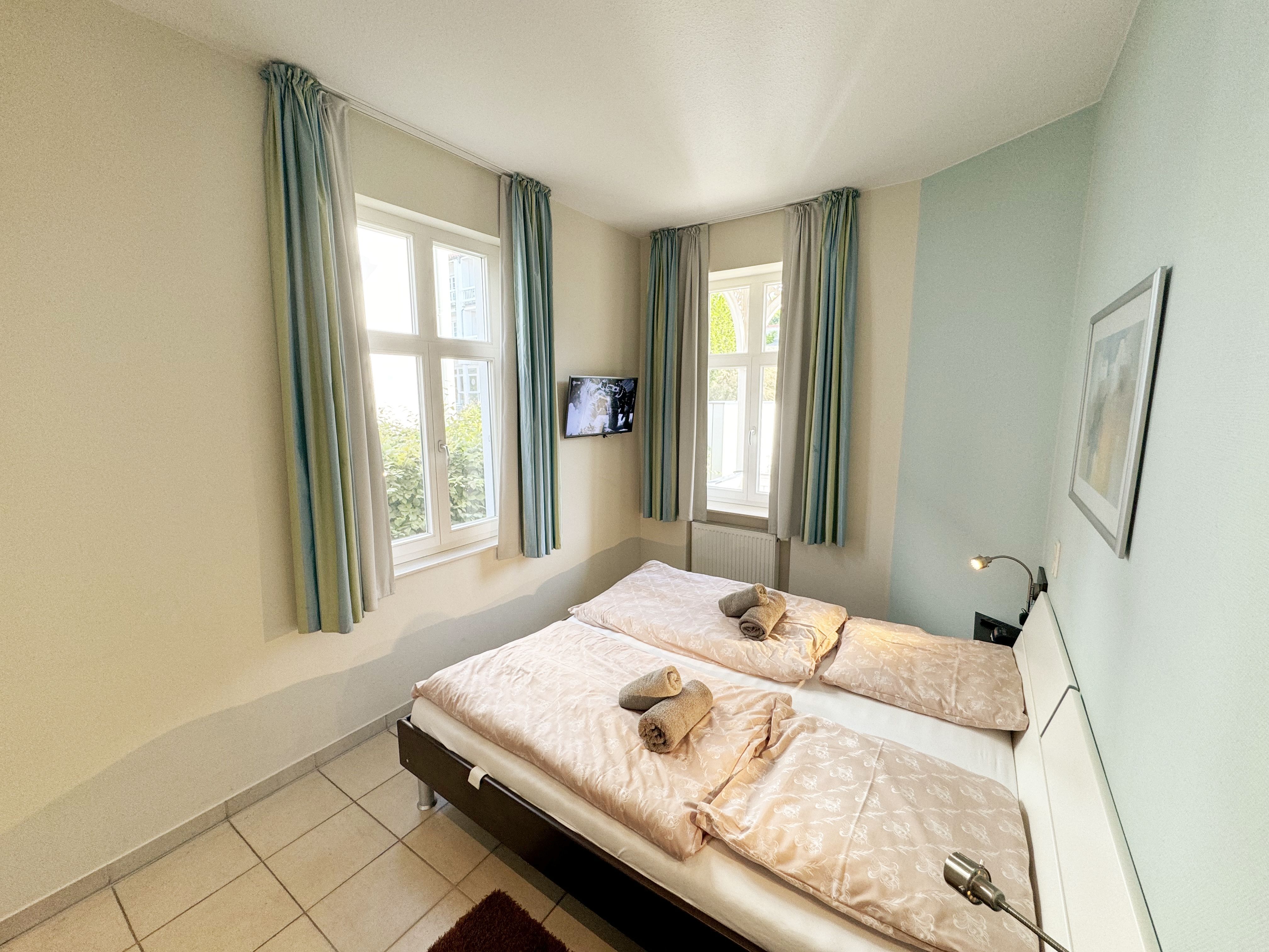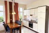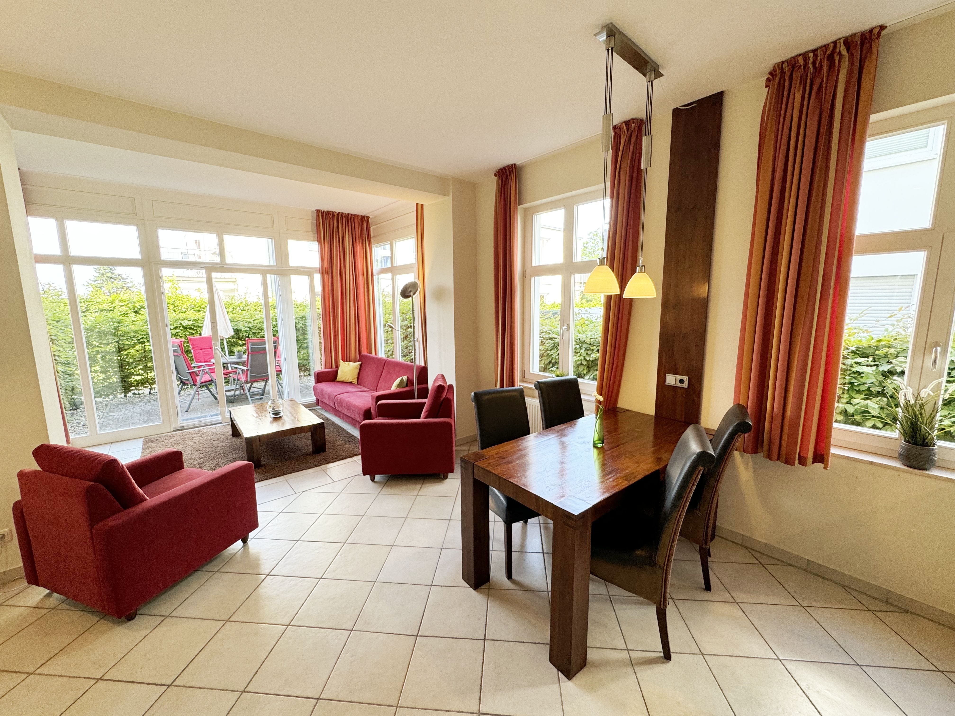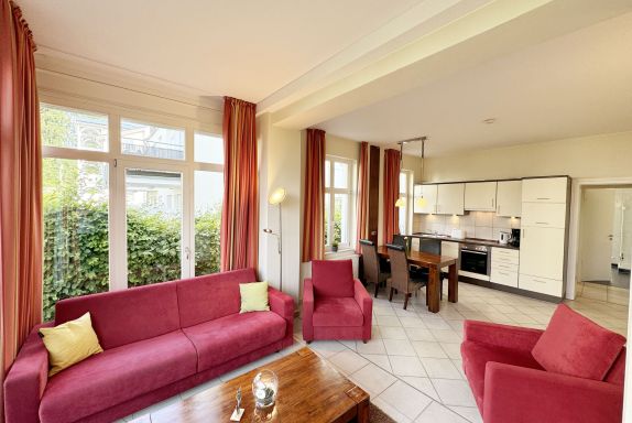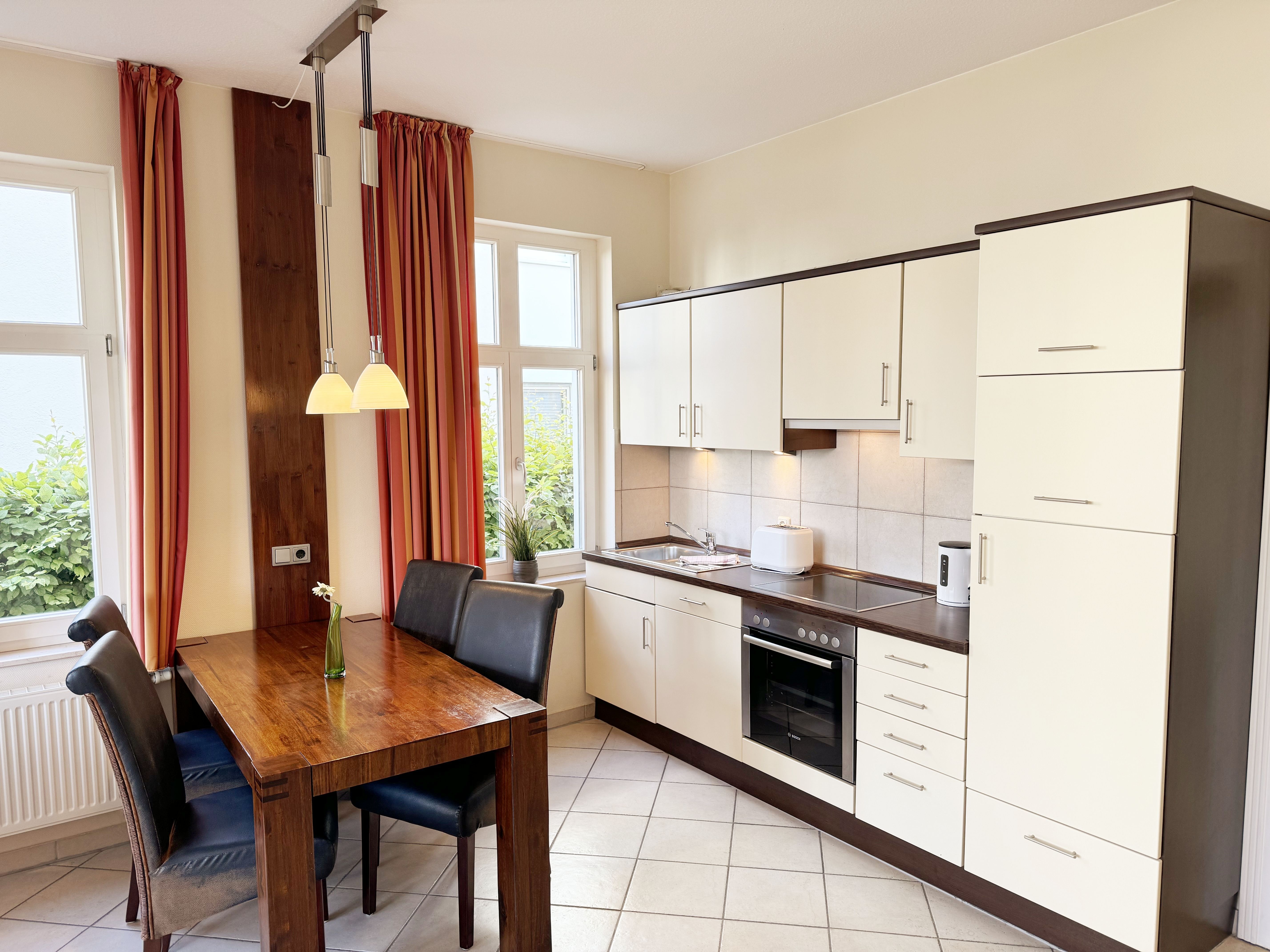 Die geschmackvolle und mit Liebe zum Detail eingerichtete 2-Raum / Nichtraucherwohnung befindet sich im Erdgeschoss der historischen Villa Möwe. Die Wohnung Nr. 2 umfasst eine Größe von ca. 52 qm und bietet genug Platz für 2 Personen und 2 Aufbettungen. Ein Kleinkind bis 3 Jahre kann im mitgebrachten bzw. dazugebuchten Kinderreisebett untergebracht werden. Der helle und großzügige Wohn-& Essbereich verfügt über einen gemütlichen Couchbereich mit einer hochwertigen Ausziehfunktion (1,60m x 2,00m), Couchtisch, 2 Sesseln, Leselampe, Anrichte mit einem Smart-TV, Blu Ray-Player, Radio mit CD-Player und Internetanschluss per WLAN (inklusive). Angrenzend finden Sie einen Holzesstisch mit 4 Stühlen, sowie eine komplett ausgestattete Küchenzeile mit Geschirrspüler, Ceranfeld, Backofen, Kühlschrank mit Eisfach, Mikrowelle, Kaffeemaschine, Nespresso Maschine, Toaster, Wasserkocher und diversen Küchenutensilien. Im separaten Schlafzimmer haben Sie ein Doppelbett (2x0,90m x 2,00m), Nachtischkonsolen, einen Kleiderschrank, Smart-TV, sowie Verdunklungsmöglichkeiten und Insektenschutzgitter, die für einen ruhigen Schlaf dienen. Der Sanitärbereich wird durch eine Dusche, WC, Fön, Kosmetikspiegel, Waschtisch, Fußbodenheizung und einen Handtuchtrockner abgerundet. Ihre bestuhlte Süd -Terrasse erreichen Sie durch den Wohnbereich. Die einem Wintergarten ähnelnden Wohnzimmerfenster sind komplett durch elektrische Rollläden abzudunkeln. Im Gemeinschafskeller können Sie gegen einen Aufpreis die gemeinschaftliche Waschmaschine und den Trockner nutzen. Die Wertmarken können Sie auf Nachfrage während Ihres Urlaubes erwerben. Die Erstausstattung eines Wäschepaketes (komplette Bettwäsche, 1 Duschhandtuch, 2 kleine Handtücher) können Sie bis 14 Tage vor Anreise gegen einen Aufpreis dazu buchen oder durch eigene ergänzen. Ab 2 gebuchten Paketen erhalten Sie einmalig 1 Geschirrhandtuch und 1 Duschvorleger hinzu. Ein eigener Pkw-Stellplatz Nr. 26 (Einfahrtshöhe Tiefgarage 2,10 m im Haus II) und ein Abstellraum im Keller (Haus I) gehören zur Wohnung. Haustiere sind in der Wohnung nicht erlaubt.