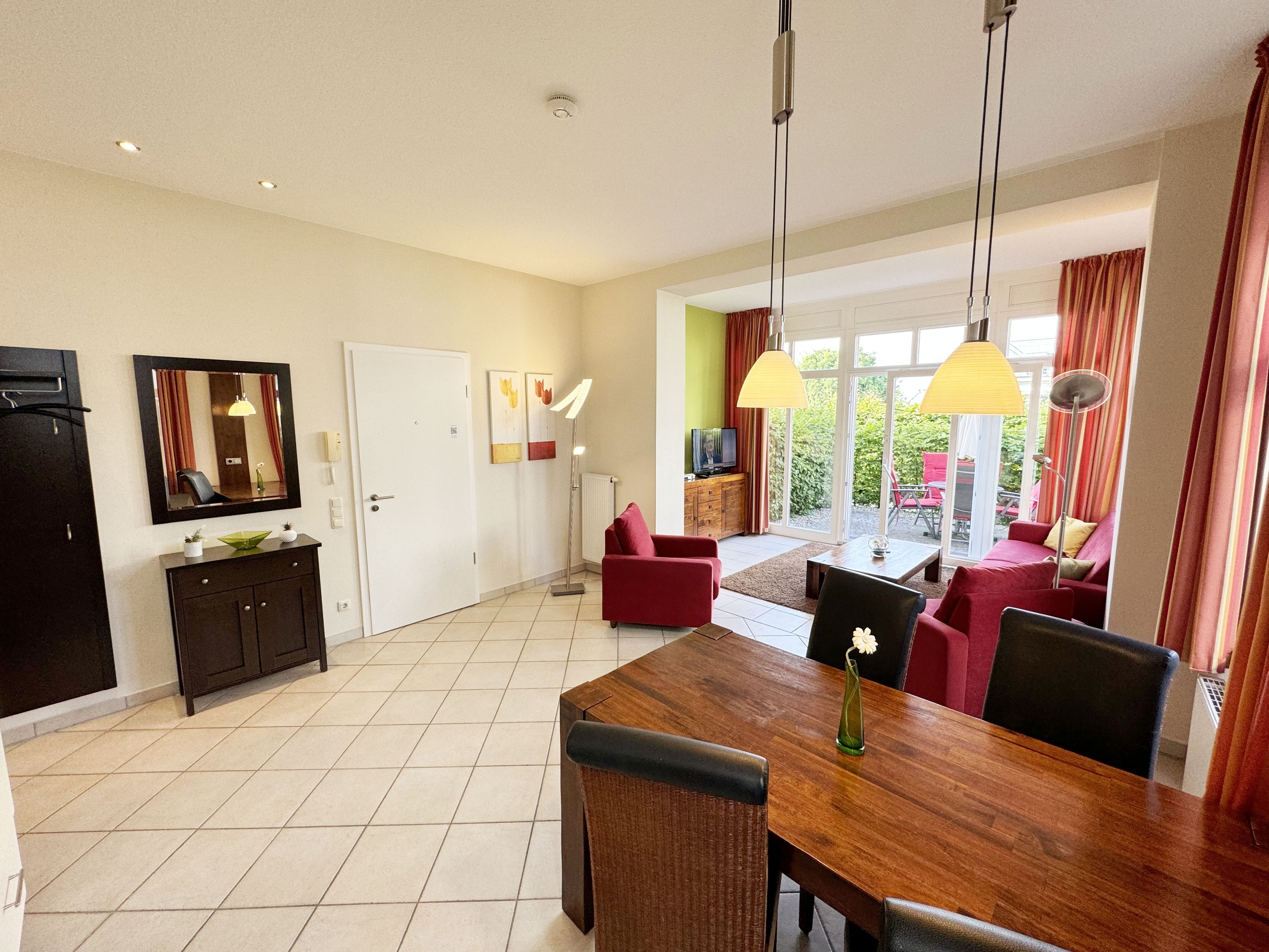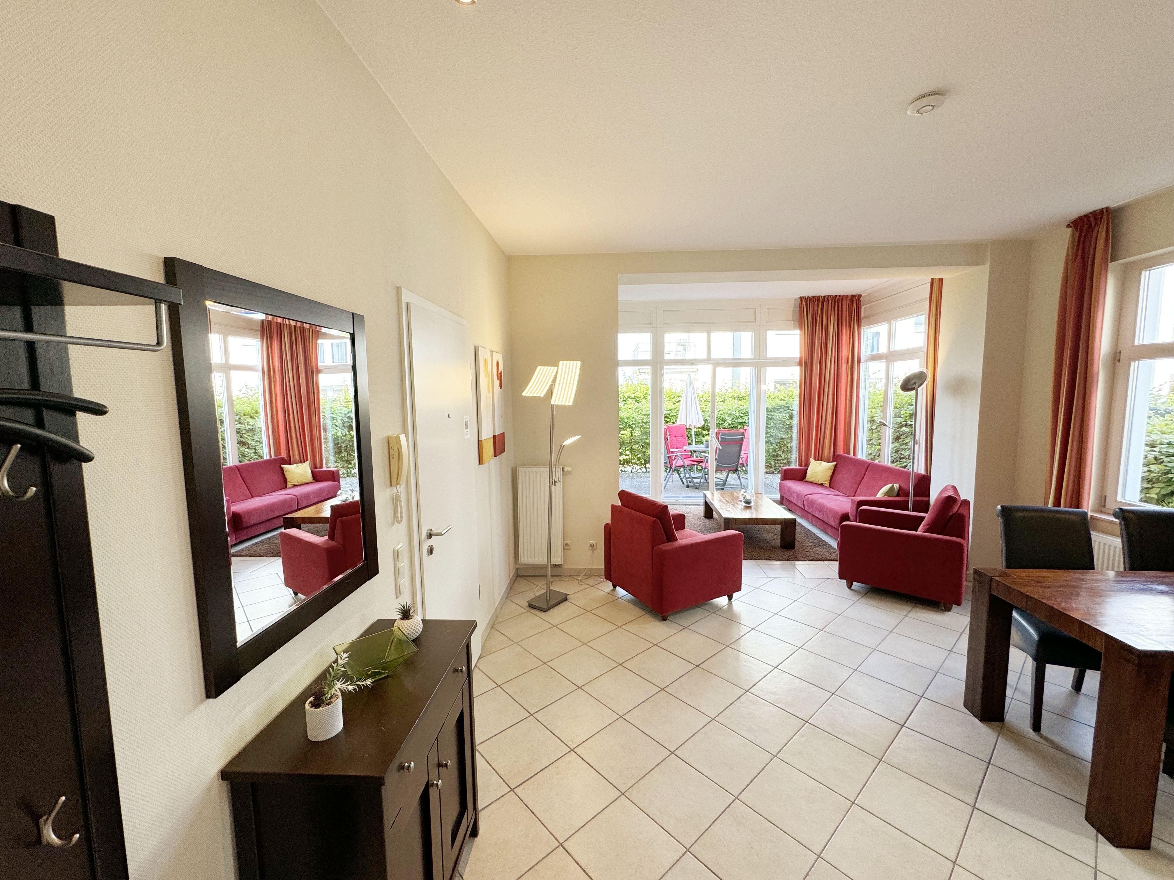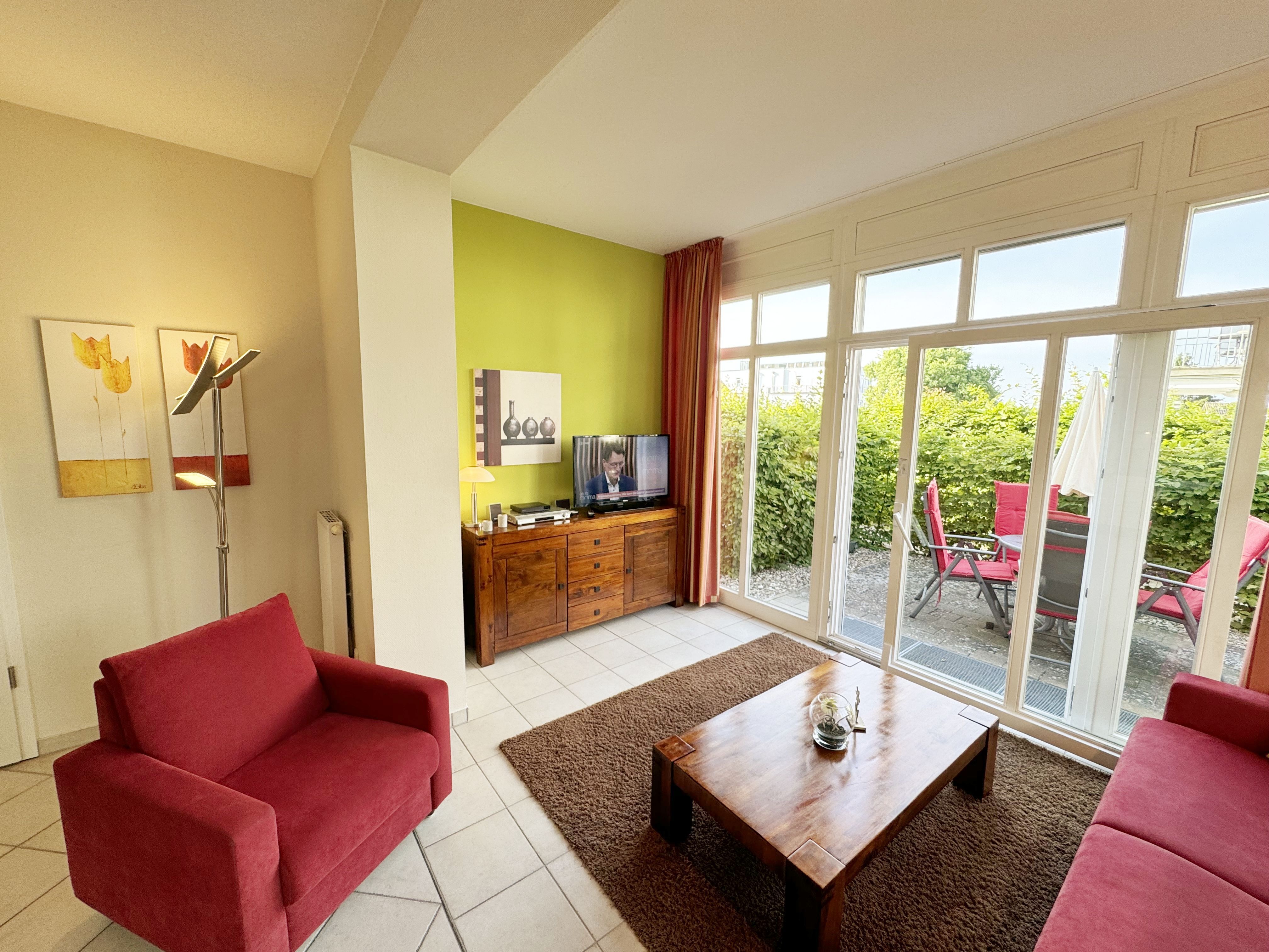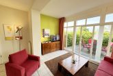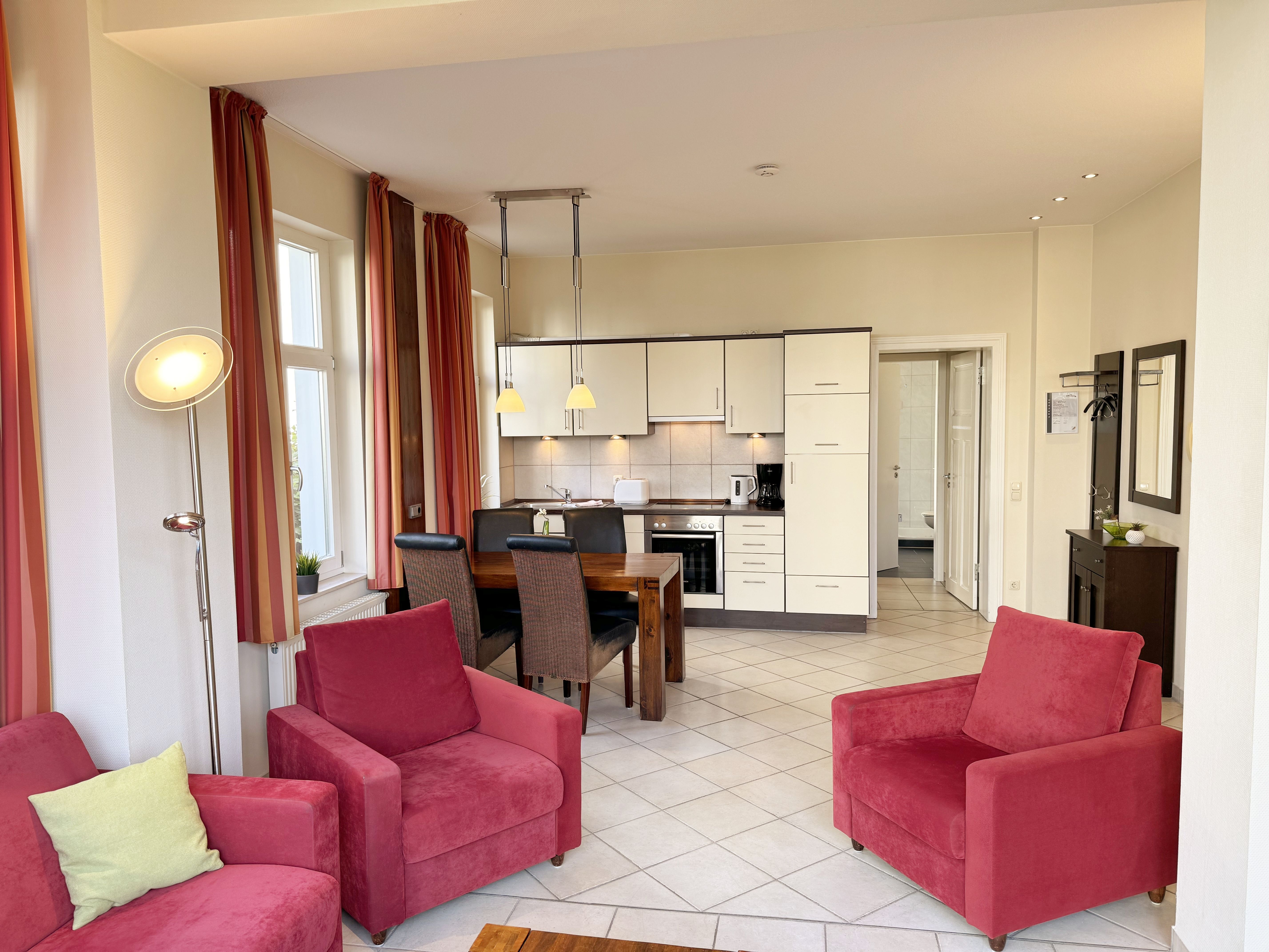 Die geschmackvolle und mit Liebe zum Detail eingerichtete 2-Raum / Nichtraucherwohnung befindet sich im Erdgeschoss der historischen Villa Möwe. Die Wohnung Nr. 2 umfasst eine Größe von ca. 52 qm und bietet genug Platz für 2 Personen und 2 Aufbettungen. Ein Kleinkind bis 3 Jahre kann im mitgebrachten bzw. dazugebuchten Kinderreisebett untergebracht werden. Der helle und großzügige Wohn-& Essbereich verfügt über einen gemütlichen Couchbereich mit einer hochwertigen Ausziehfunktion (1,60m x 2,00m), Couchtisch, 2 Sesseln, Leselampe, Anrichte mit einem Smart-TV, Blu Ray-Player, Radio mit CD-Player und Internetanschluss per WLAN (inklusive). Angrenzend finden Sie einen Holzesstisch mit 4 Stühlen, sowie eine komplett ausgestattete Küchenzeile mit Geschirrspüler, Ceranfeld, Backofen, Kühlschrank mit Eisfach, Mikrowelle, Kaffeemaschine, Nespresso Maschine, Toaster, Wasserkocher und diversen Küchenutensilien. Im separaten Schlafzimmer haben Sie ein Doppelbett (2x0,90m x 2,00m), Nachtischkonsolen, einen Kleiderschrank, Smart-TV, sowie Verdunklungsmöglichkeiten und Insektenschutzgitter, die für einen ruhigen Schlaf dienen. Der Sanitärbereich wird durch eine Dusche, WC, Fön, Kosmetikspiegel, Waschtisch, Fußbodenheizung und einen Handtuchtrockner abgerundet. Ihre bestuhlte Süd -Terrasse erreichen Sie durch den Wohnbereich. Die einem Wintergarten ähnelnden Wohnzimmerfenster sind komplett durch elektrische Rollläden abzudunkeln. Im Gemeinschafskeller können Sie gegen einen Aufpreis die gemeinschaftliche Waschmaschine und den Trockner nutzen. Die Wertmarken können Sie auf Nachfrage während Ihres Urlaubes erwerben. Die Erstausstattung eines Wäschepaketes (komplette Bettwäsche, 1 Duschhandtuch, 2 kleine Handtücher) können Sie bis 14 Tage vor Anreise gegen einen Aufpreis dazu buchen oder durch eigene ergänzen. Ab 2 gebuchten Paketen erhalten Sie einmalig 1 Geschirrhandtuch und 1 Duschvorleger hinzu. Ein eigener Pkw-Stellplatz Nr. 26 (Einfahrtshöhe Tiefgarage 2,10 m im Haus II) und ein Abstellraum im Keller (Haus I) gehören zur Wohnung. Haustiere sind in der Wohnung nicht erlaubt.