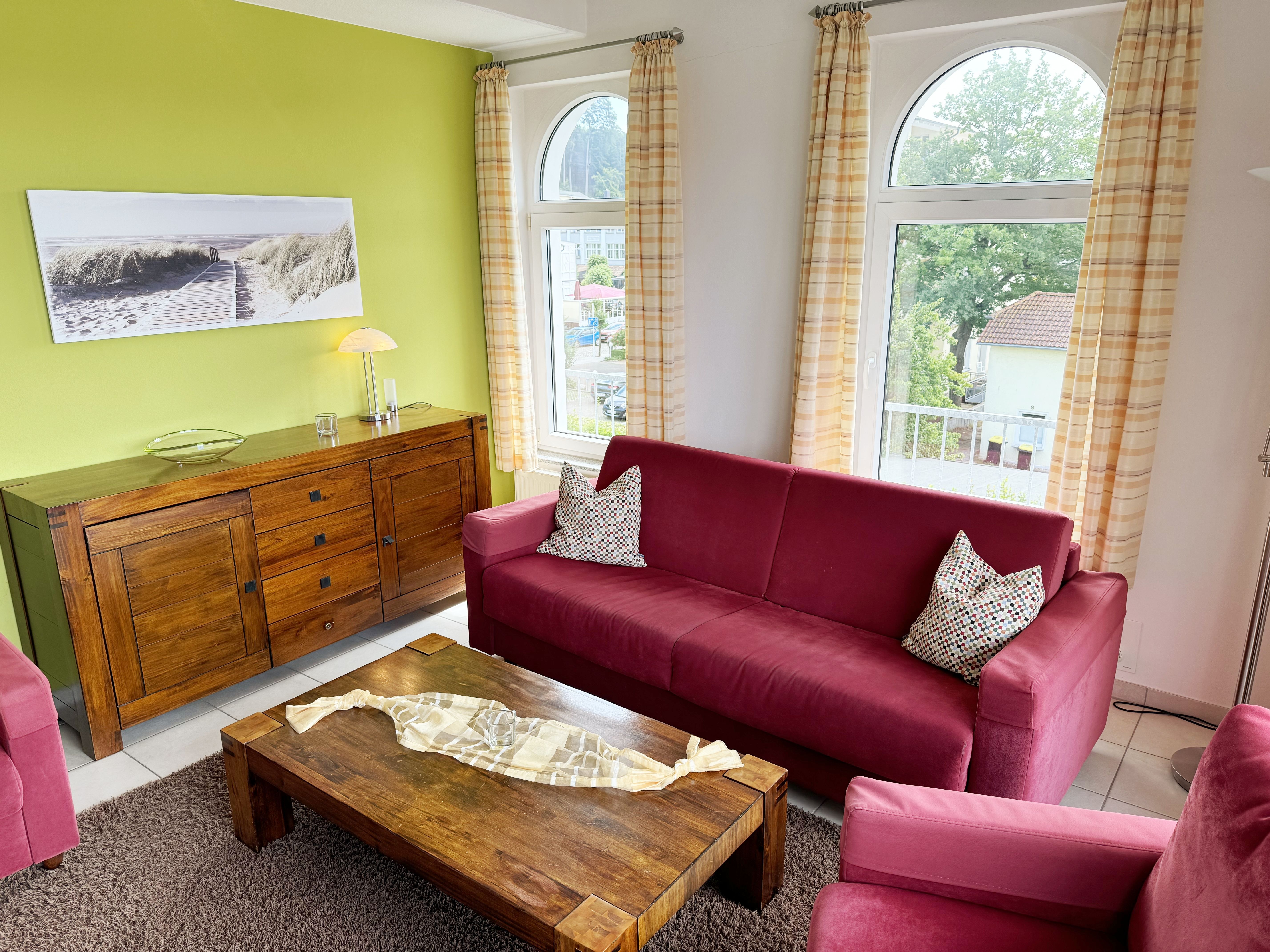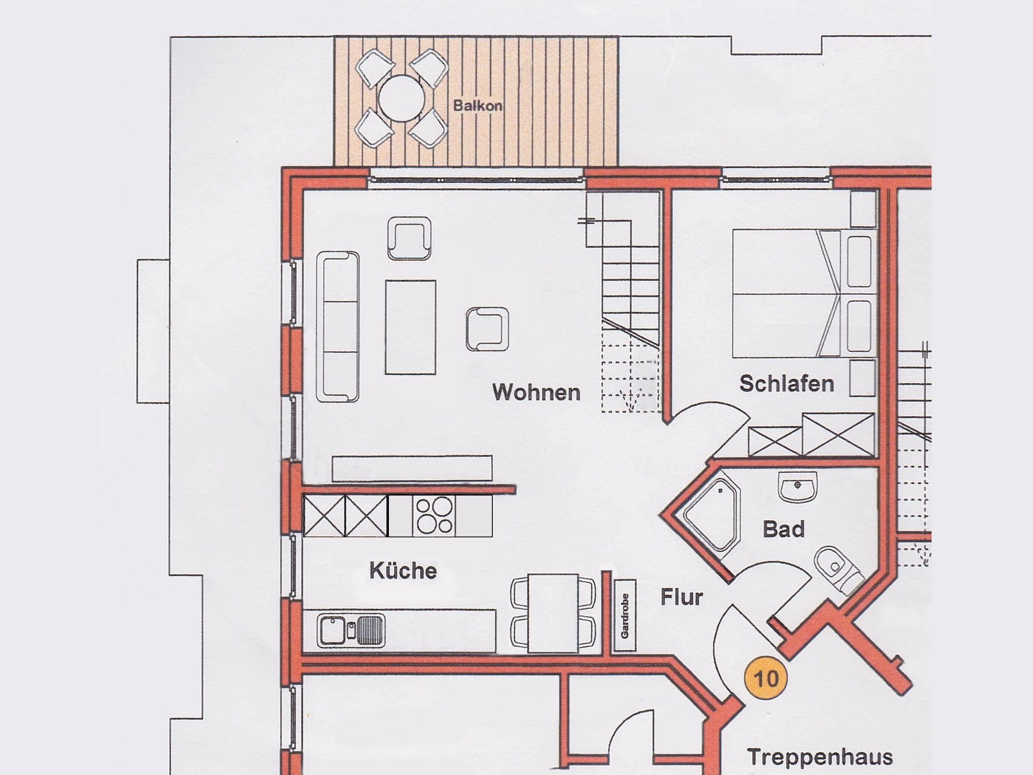 Das Ferienapartment Wohnung 10 selbst, dass Sie bequem über einen Aufzug erreichen, befindet sich im zweiten Obergeschoss der Dependance. Vom großzügigen Balkon der Wohnung haben Sie einen wunderschönen Panoramablick über das Ostseebad.
