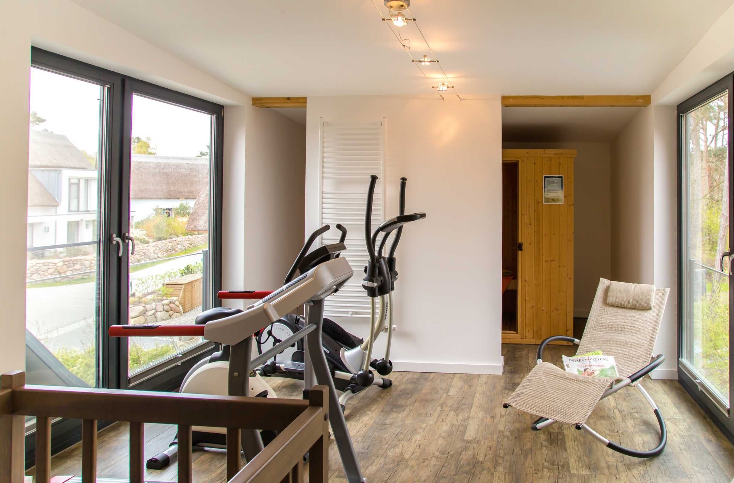• offener, lichtdurchfluteter Sport- und Wellnessbereich mit Laufband, Crosstrainer und Fahrradheimtrainer, Flachbild-TV