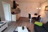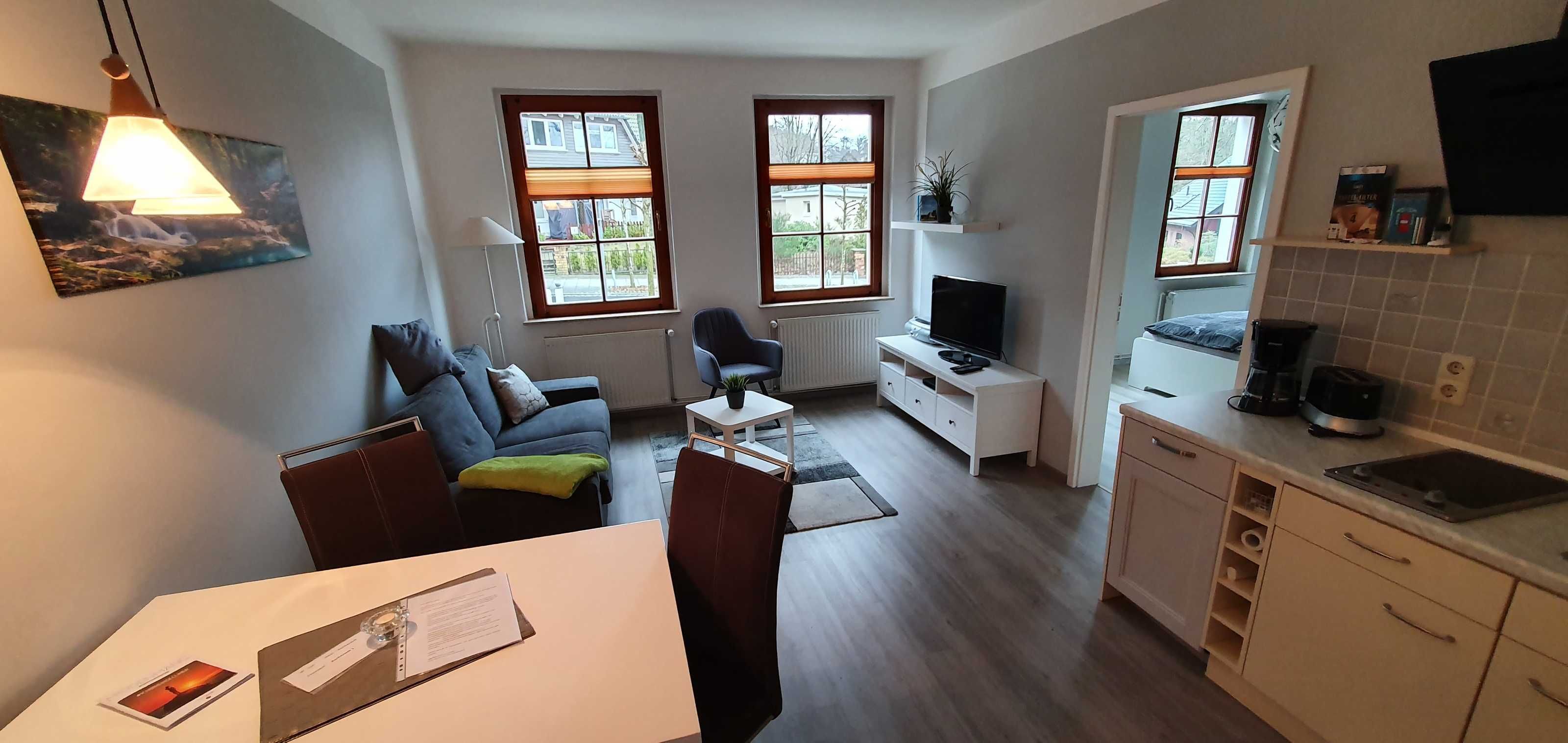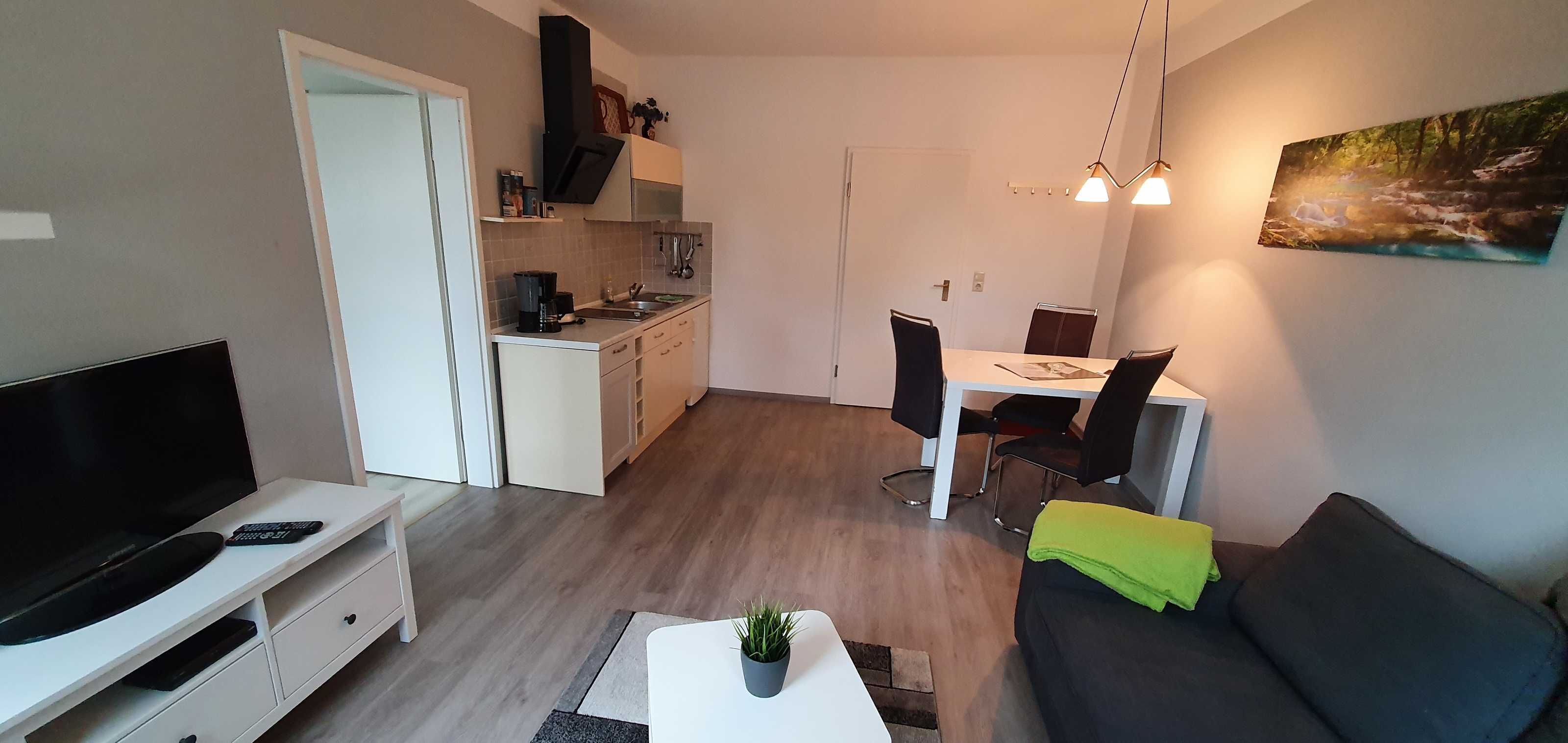 Über einen separaten Eingang und einen kleinen Vorflur mit Garderobe gelangt man in den Wohnraum. Hier befinden sich eine bequeme Sitzcouch mit Tisch, ein modernes Flachbild-TV-Gerät und ein Esstisch mit Stühlen. Die Küchenzeile ist mit einem Herd, Abzugshaube, Geschirrspüler, Wasserkocher, Kaffeemaschine, Toaster und Kühlschrank komplett ausgestattet.
