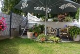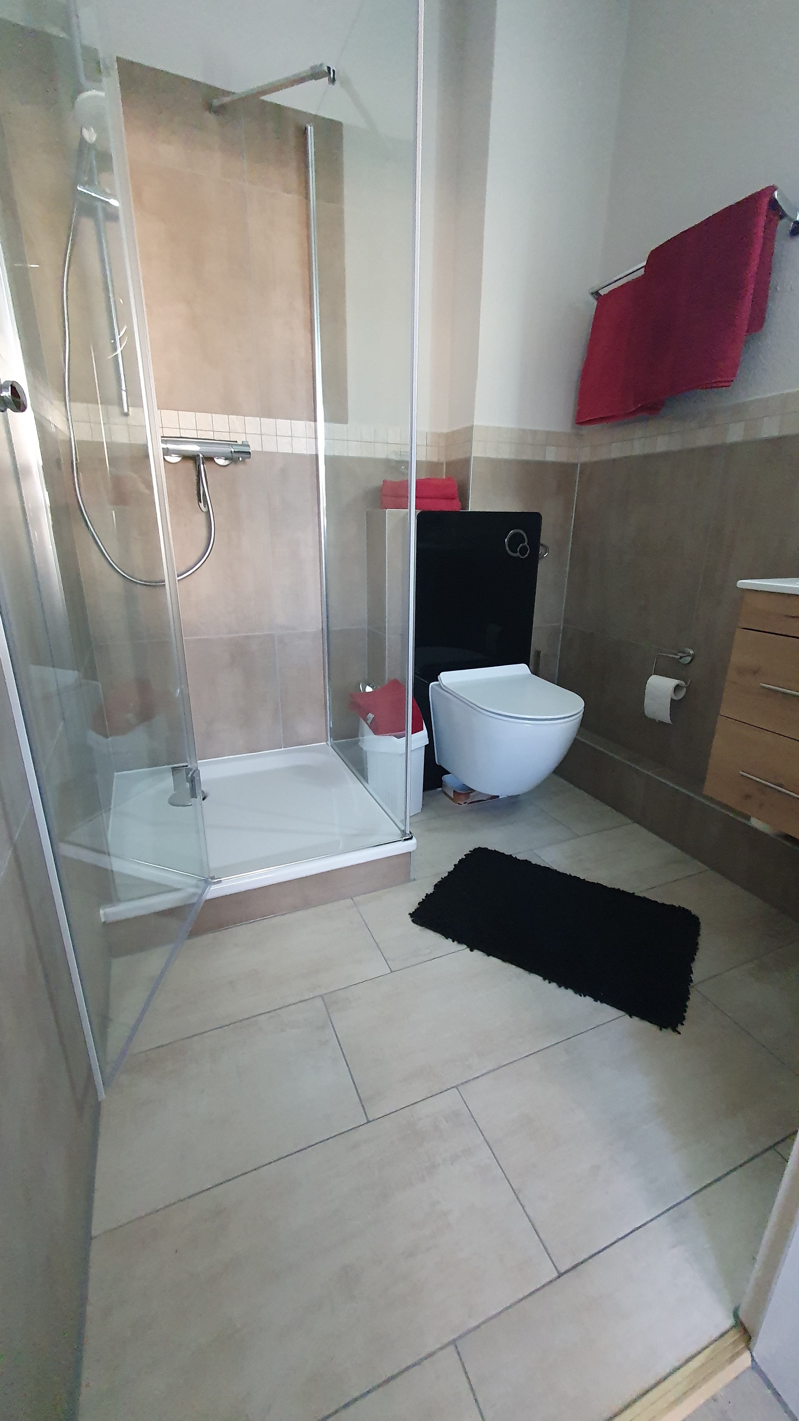 Im Schlafzimmer befinden sich ein bequemes Doppelbett mit Nachttischen und Leselampe und ein großer Kleiderschrank. Hier steht auch eine Liege für ein Kind bis max. 16 Jahre. Ein kleines Kinderreisebett kann auf Wunsch kostenlos bereit gestellt werden. Bei Ihrer Anreise liegen frische Handtücher bereit und die Betten sind selbstverständlich bereits mit Bettwäsche bezogen. Das moderne Bad ist mit Dusche, WC und Waschtisch ausgestattet. Zum diesem Appartement gehört auch eine Terrasse im Garten mit Gartenmöbeln.