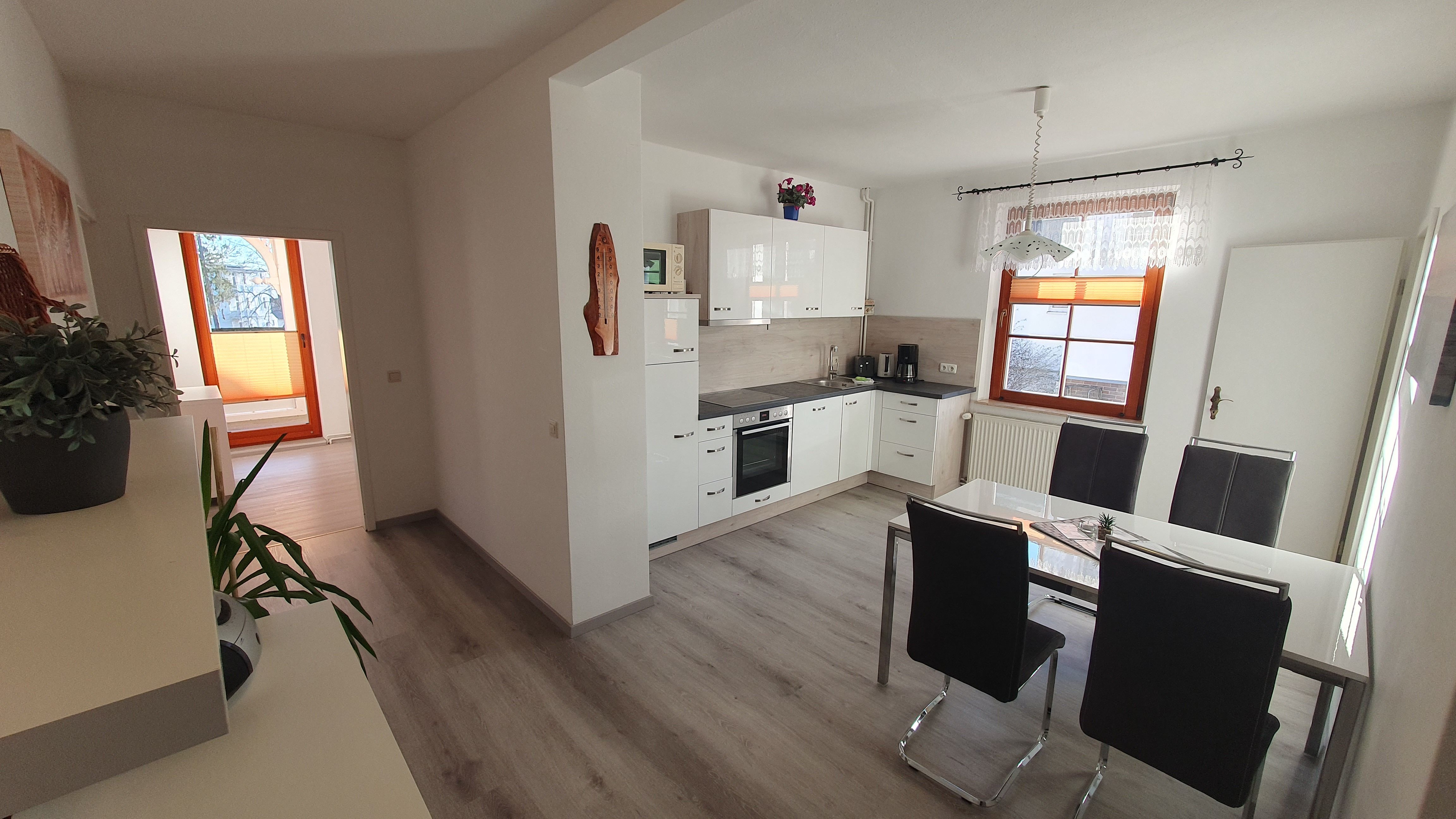 Über einen separaten Eingang und einen kleinen Vorflur mit Garderobe gelangt man in die separate Küche. Diese ist mit Bachofen, Herd, Abzugshaube, Mikrowelle, Wasserkocher, Kaffeemaschine, Toaster und Kühlschrank komplett ausgestattet. Hier stehen auch ein Esstisch und Stühle.