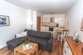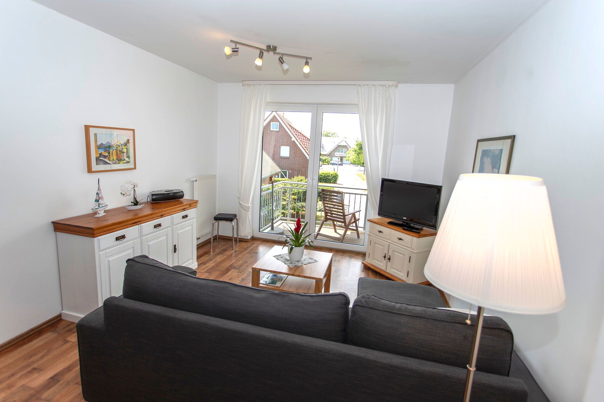 Der kombinierte Wohn-Küchenraum ist stilvoll eingerichtet. Er verfügt u. a. über einen modernen Flachbild-TV, einem Lowboard und einem Sideboard aus massiven Holz, einem Couch- und Esstisch sowie einer ausziehbaren roten Couch. Das Schlafzimmer ist mit einem Doppelbett (2,00 x 1,80m, einzelnen 21cm dicken Komfort-Kaltschaum-Matratzen und sehr guten Lattenrosten) sowie einem großen Kleiderschrank ausgestattet.