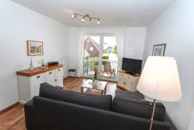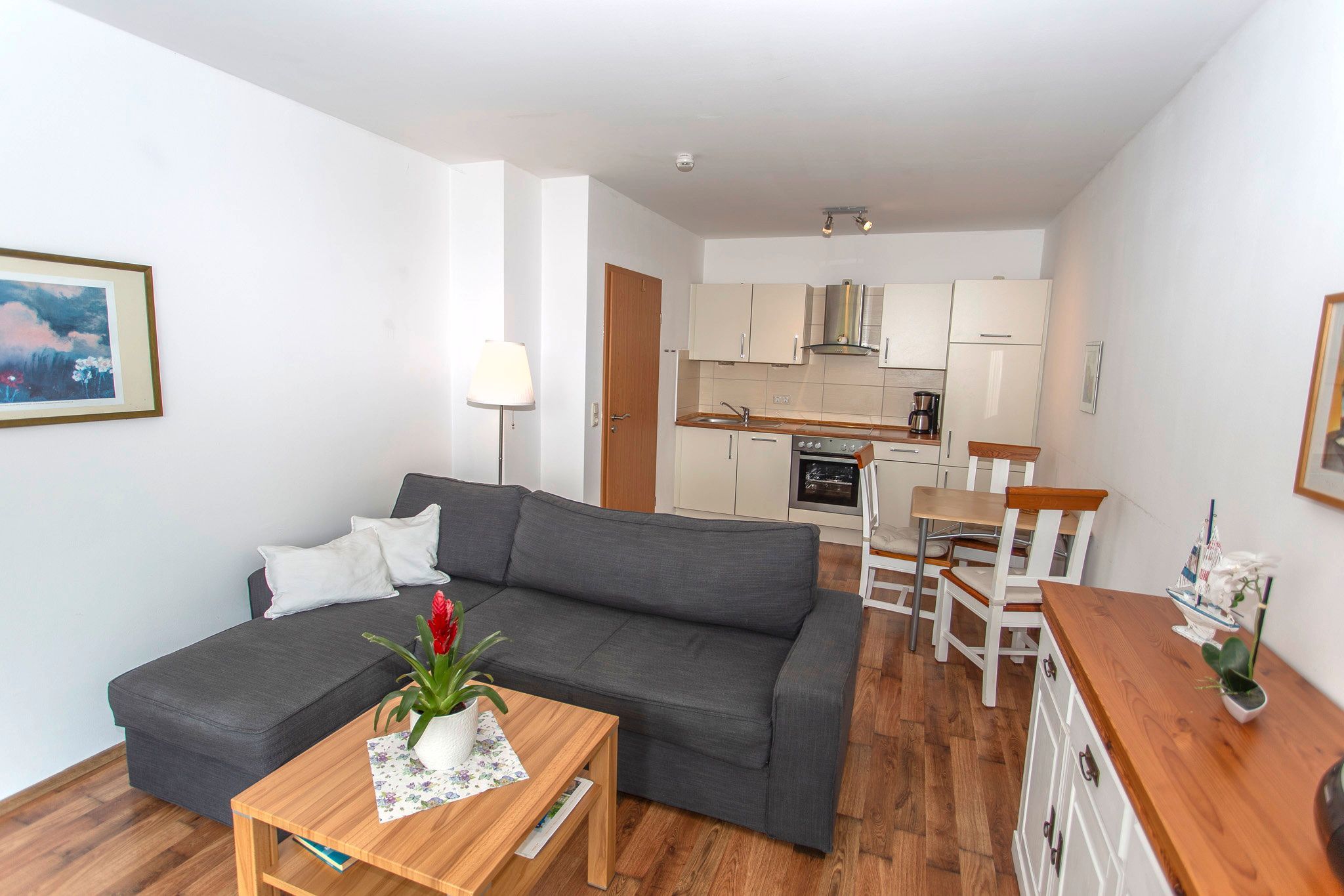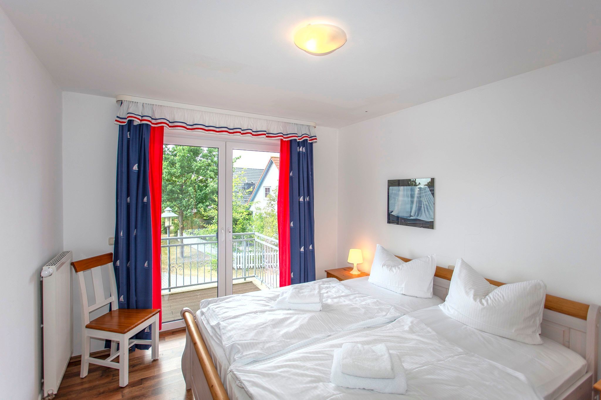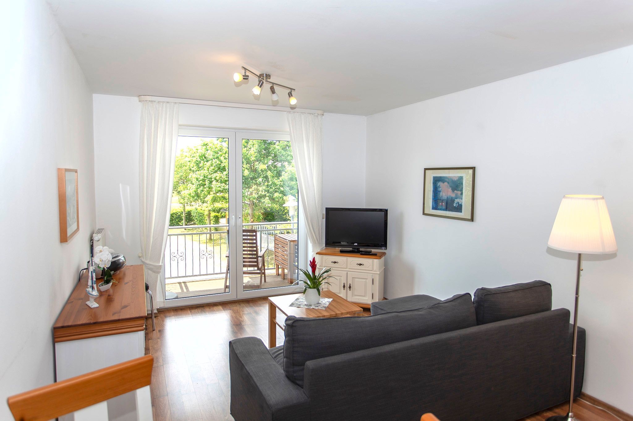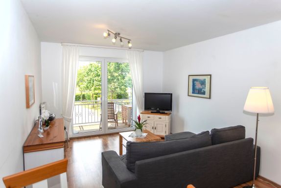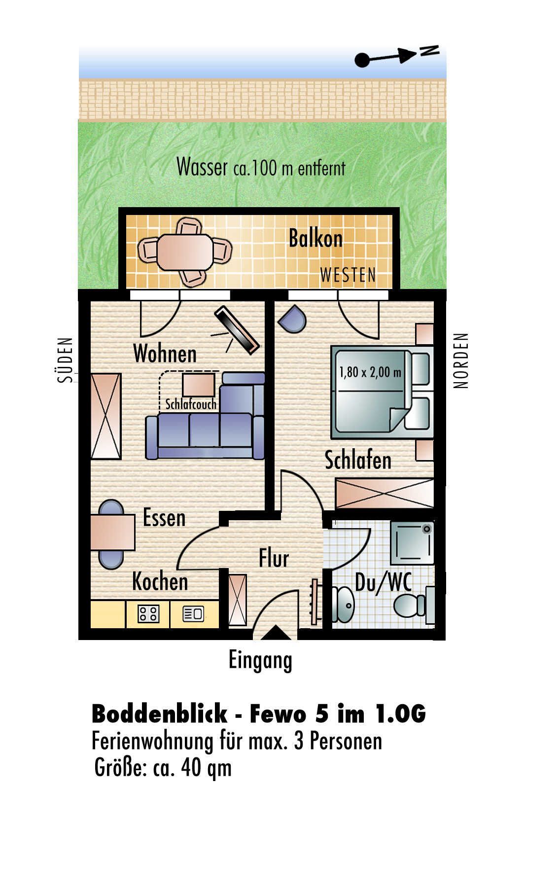 Die modern und individuell eingerichtete 2-Raum Ferienwohnung in Wiek auf der Insel Rügen befindet sich im 1. Obergeschoss im Haus Boddenblick. Sie hat eine Grundfläche von ca. 40qm. Vom Wohn- und Schlafraum gibt es direkten Zugang zum großen Balkon, von den aus man einen Blick durch die Gärten der benachbarten Wohnhäuser bis zum Bodden hat.