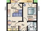 Die Küche (offen) ist mit AEG-Geräten ausgestattet: Geschirrspüler, Backofen, 4-Platten-Ceranfeld. Der große Kühlschrank mit Gefrierfach ist von Privileg. Die Küche ist weiterhin mit Toaster, Kaffeemaschine, Wasserkocher, Messerblock, Töpfe, Pfanne sowie ausreichend Geschirr und Besteck ausgestattet. Das Bad mit ebenerdiger Glasdusche, WC, Waschbecken und großem Spiegel ist inneliegend.