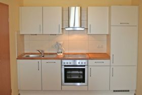 Die Küche (offen) ist mit AEG-Geräten ausgestattet: Geschirrspüler, Backofen, 4-Platten-Ceranfeld. Der große Kühlschrank mit Gefrierfach ist von Privileg. Die Küche ist weiterhin mit Toaster, Kaffeemaschine, Wasserkocher, Messerblock, Töpfe, Pfanne sowie ausreichend Geschirr und Besteck ausgestattet. Das Bad mit ebenerdiger Glasdusche, WC, Waschbecken und großem Spiegel ist inneliegend.