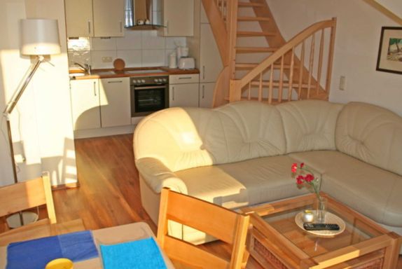 Die modern und individuell ausgestattete 53qm große 3-Raum-Ferienwohnung in Wiek auf der Insel Rügen befindet sich im 2. Obergeschoss im Haus Boddenblick. Der Wohnraum ist geschmackvoll eingerichtet und verfügt über einen Flachbild-TV, einem Lowboard sowie einer ausziehbaren hellen Ledercouch und einem Holzesstisch mit Stühlen. Vom Wohnraum- und Schlafraum ist der Zugang zum großen Balkon gegeben.