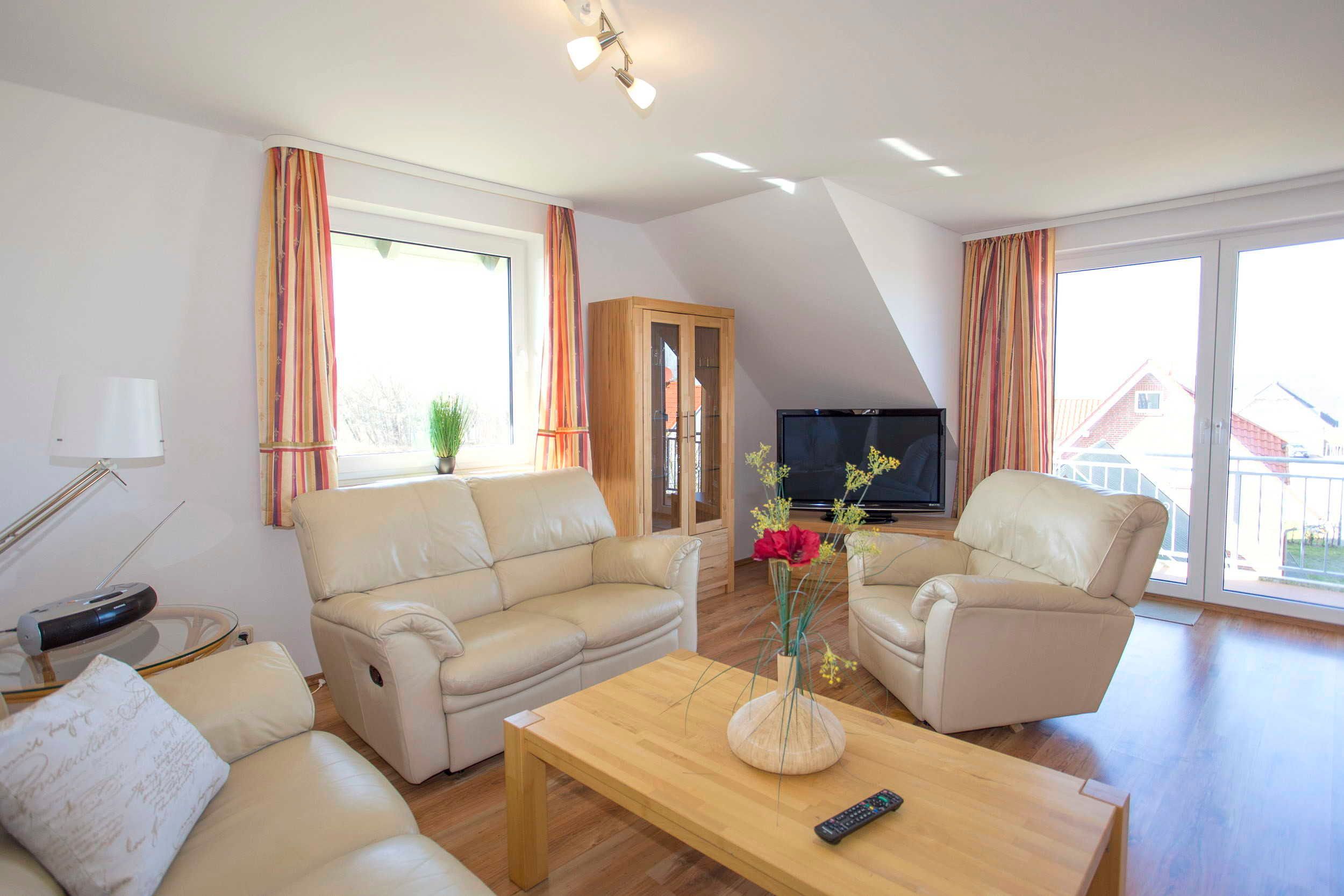 Der Wohnraum ist modern eingerichtet und verfügt über einen großen Flachbild-TV, einem Lowboard und Highboard sowie einer hellen Kunstledercouch (3-er Sofa, 2-er Sofa und verstellbarem Sofasessel) und einem großen massiven Esstisch mit passenden Holzstühlen. Vom Wohnraum ist der Zugang zum Balkon gegeben, von wo Sie aus einen tollen Blick auf den Wieker Bodden haben.