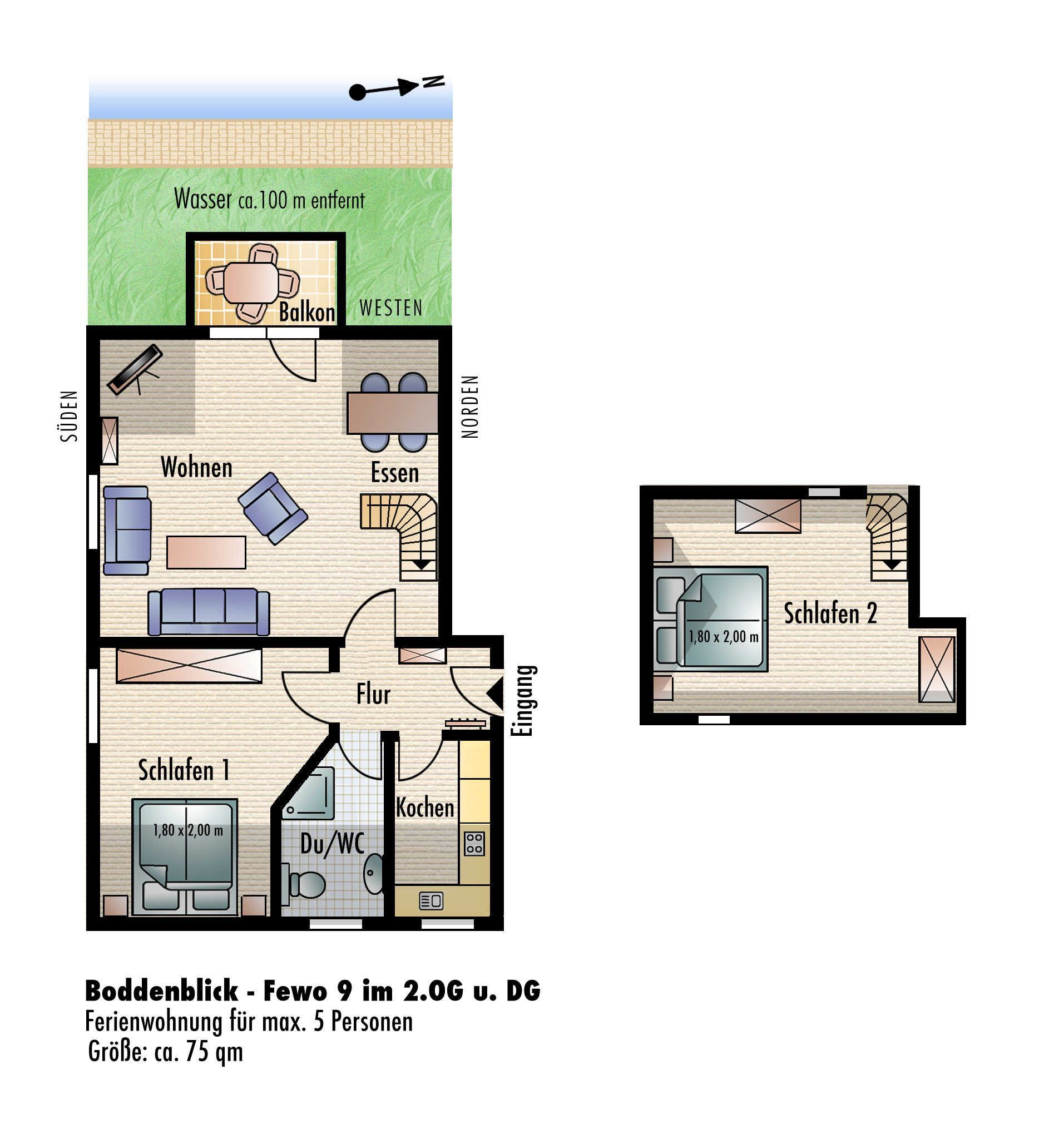 Die modern, hell und individuell ausgestattete 75qm große 3-Raum-Ferienwohnung in Wiek auf der Insel Rügen befindet sich im 2. Obergeschoss im Haus Boddenblick. Sie erstreckt sich über 2 Etagen und bietet einen herrlichen Blick sowohl über den Wieker Bodden als auch über das grüne Achterland.