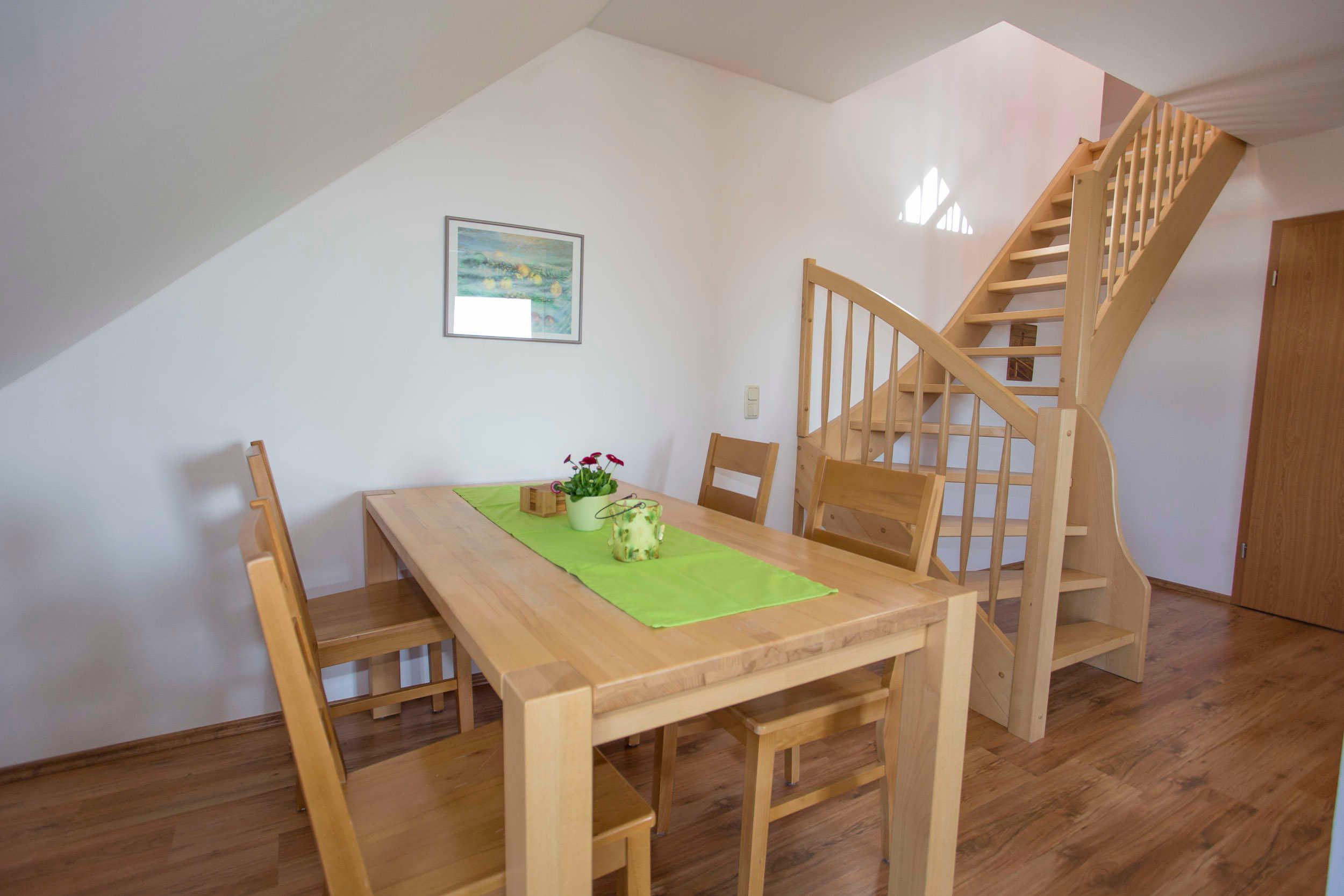 Die Ferienwohnung verfügt über zwei separate Schlafzimmer mit jeweils einem Doppelbett (2,00 x 1,80m, einzelnen 21cm dicken Komfort-Kaltschaum-Matratzen sowie sehr guten Lattenrosten). Ein Schlafzimmer befindet sich im Dachausbau und ist über eine offene Treppe vom Wohnzimmer aus zu erreichen. Es ist mit einem Sideboard ausgestattet. Im zweiten Schlafzimmer befindet sich ein großer Kleiderschrank.
