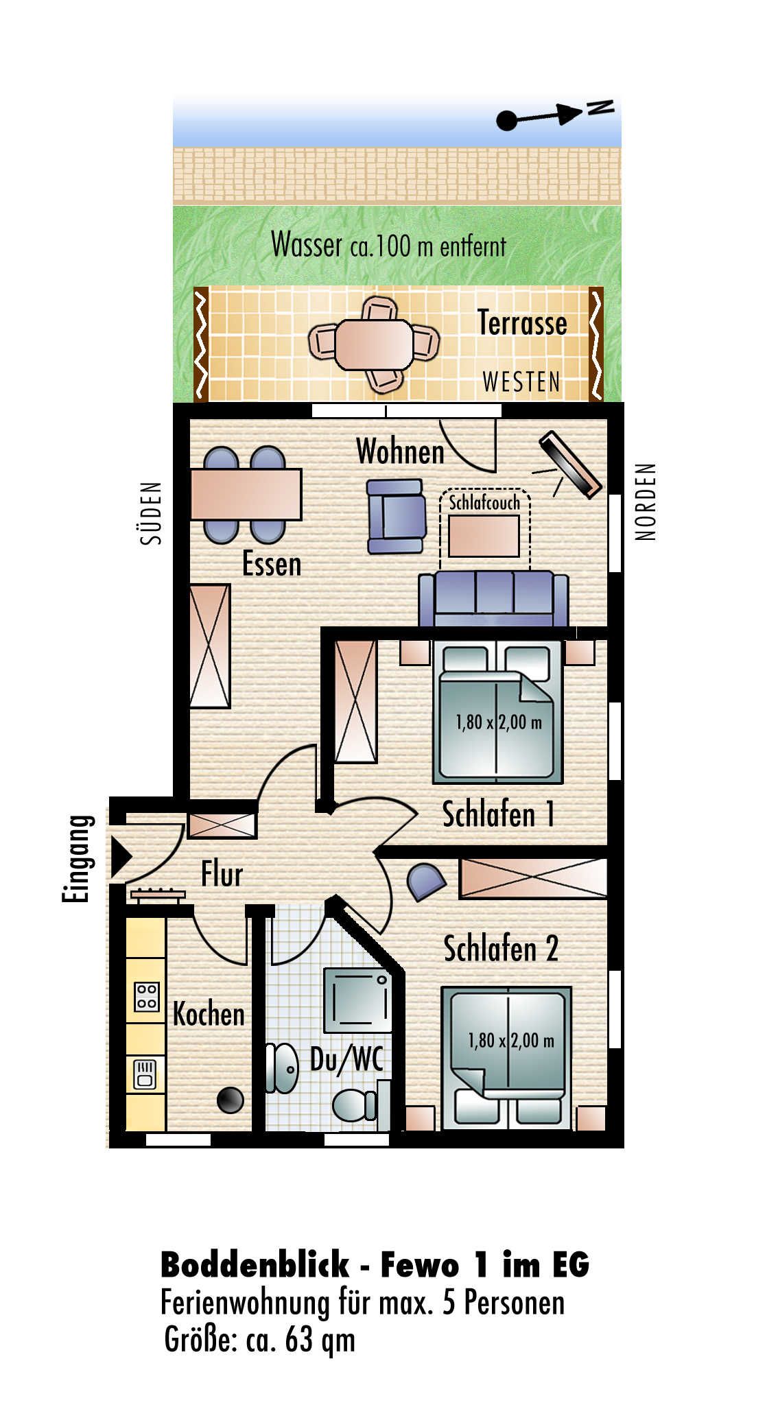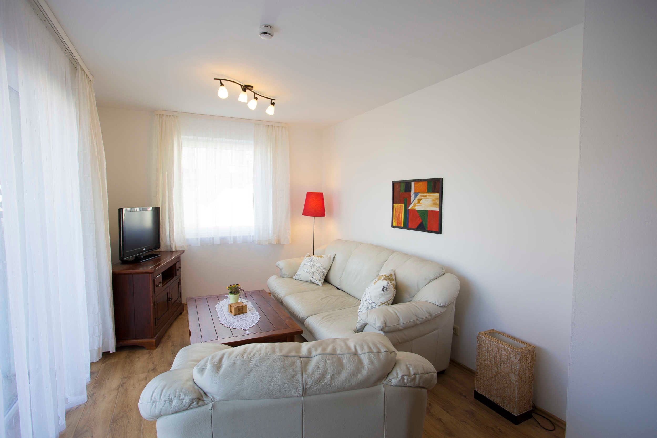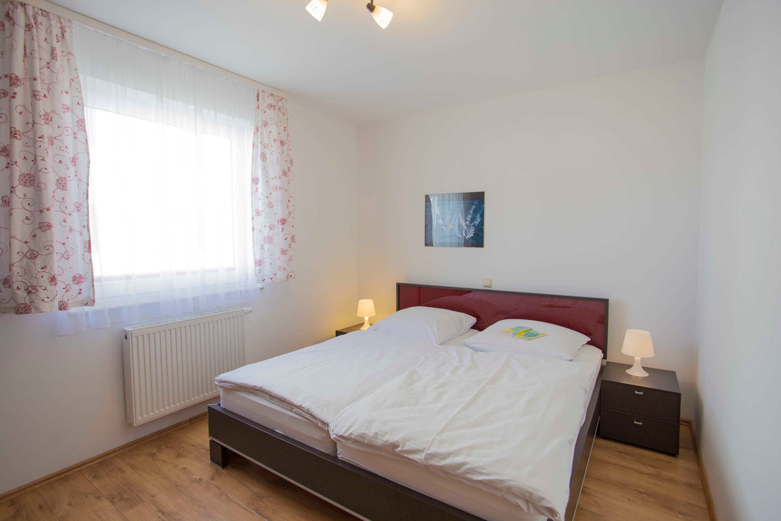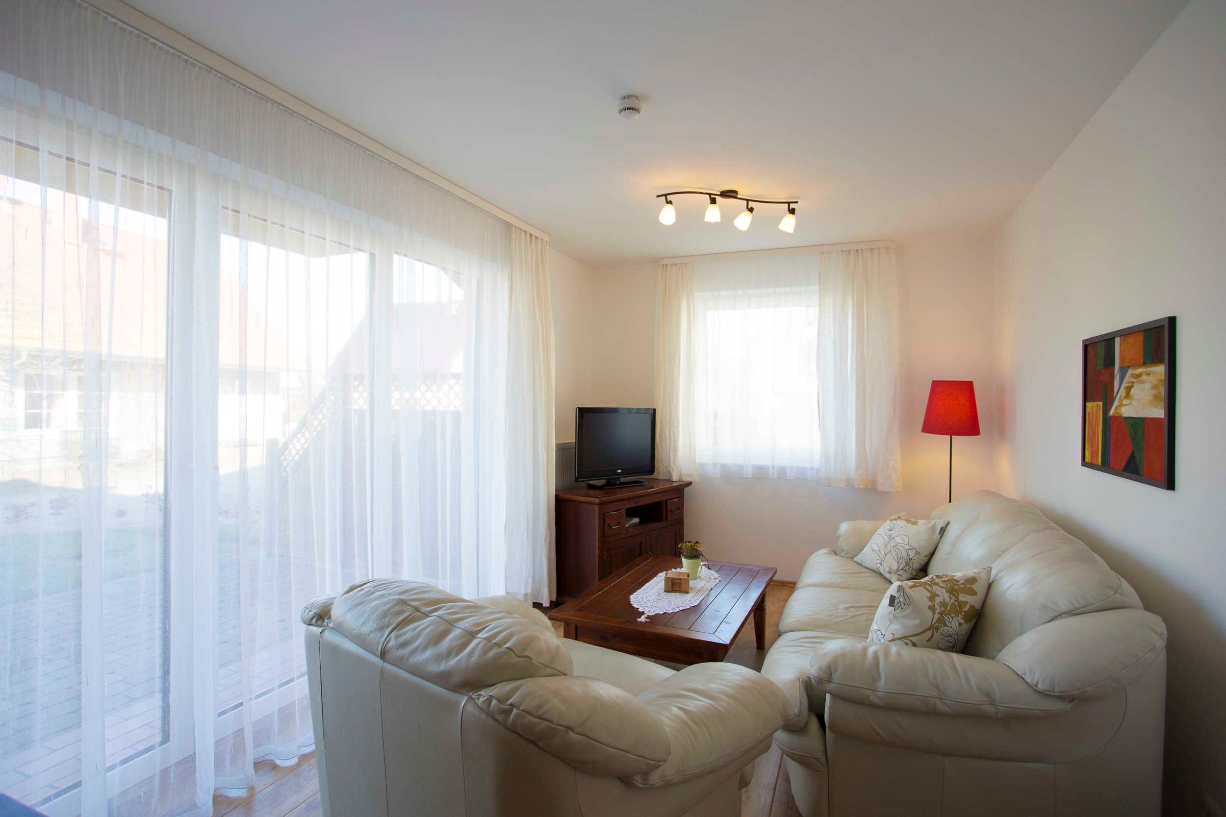 Die modern, hell und individuell eingerichtete 3-Raum Ferienwohnung in Wiek auf der Insel Rügen befindet sich im Erdgeschoss im Haus Boddenblick. Sie hat eine Grundfläche von ca. 63qm. Der Wohnraum ist geschmackvoll eingerichtet und verfügt über einen Flachbild-TV, einem Lowboard sowie einer ausziehbaren weißen Ledercouch und einem großen massiven Holzesstisch mit 6 Stühlen. Vom Wohnraum ist der Zugang zur großen Terrasse gegeben. Die Ferienwohnung verfügt über zwei separate Schlafzimmer mit jeweils einem Doppelbett (2,00 x 1,80m, einzelnen 21cm dicken Komfort-Kaltschaum-Matratzen sowie sehr guten Lattenrosten) und jeweils einen großen Kleiderschrank.