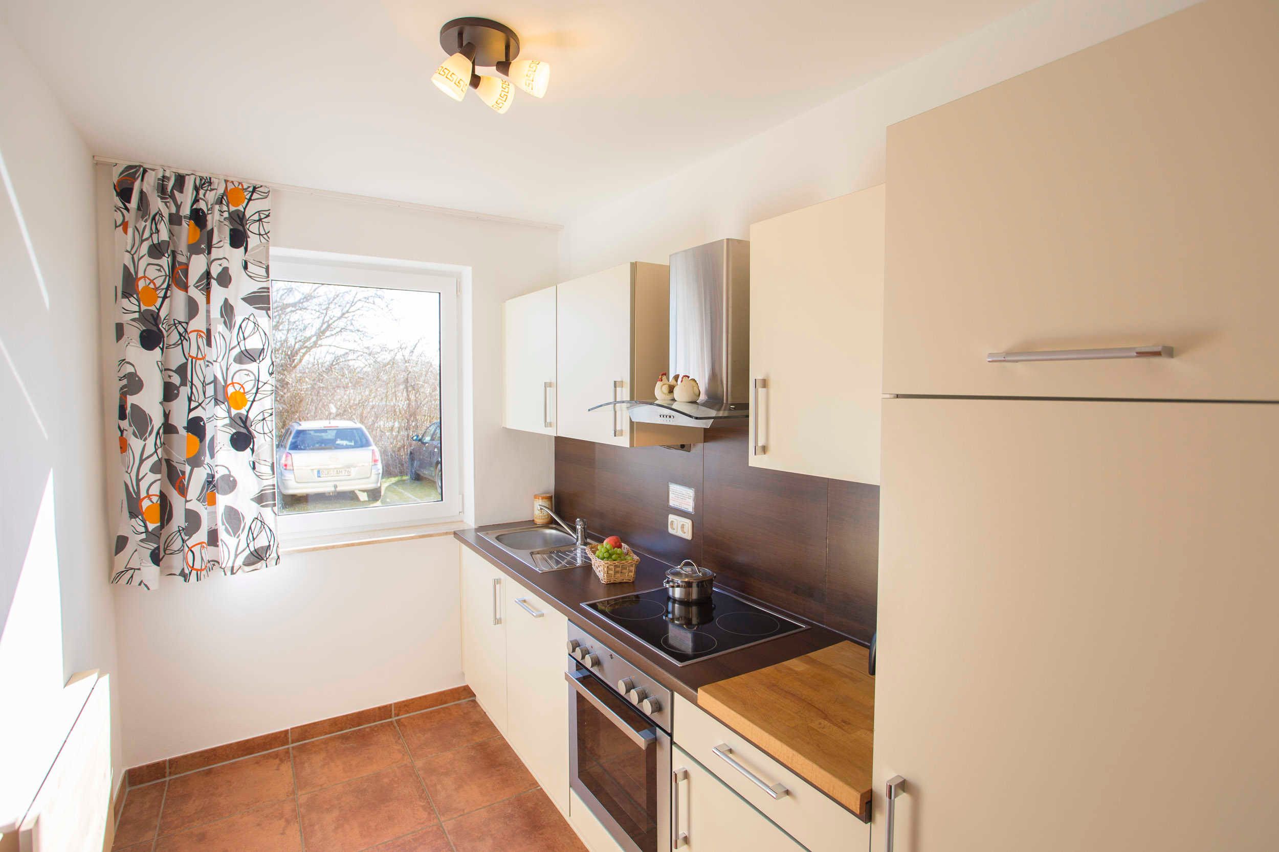 Die Küche ist mit AEG-Geräten ausgestattet: Geschirrspüler, Backofen, 4-Platten-Ceranfeld. Der große Kühlschrank mit Gefrierfach ist von Privileg. Die Küche ist weiterhin mit Toaster, Kaffeemaschine, Wasserkocher, Messerblock, Töpfe, Pfanne sowie ausreichend Geschirr und Besteck ausgestattet.