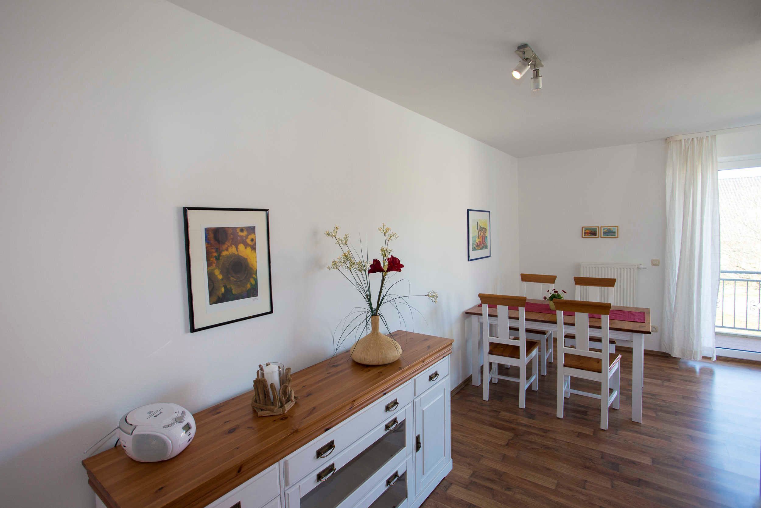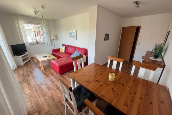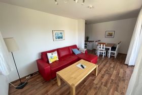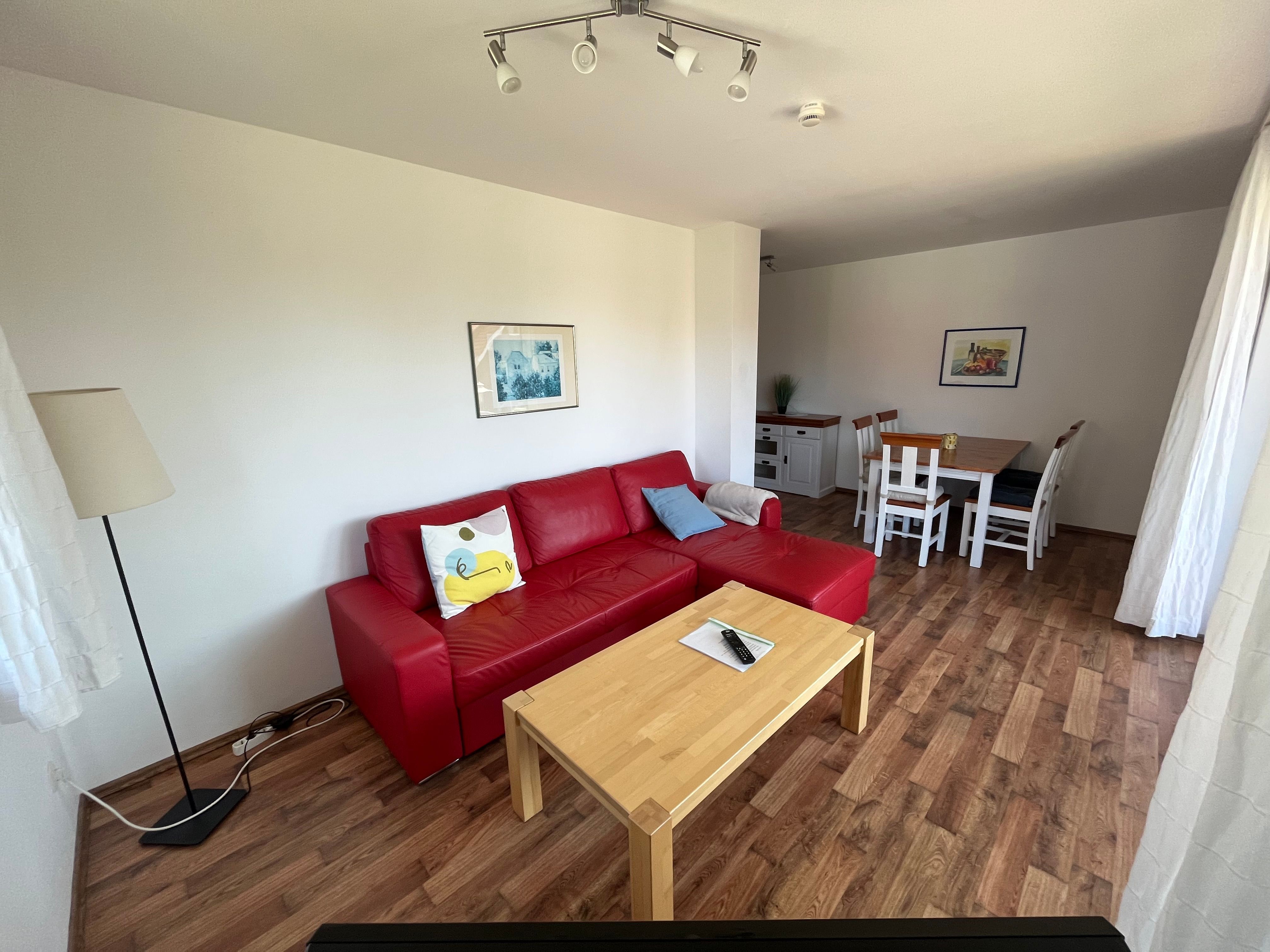 Der Wohnraum ist geschmackvoll eingerichtet und verfügt über einen Flachbild-TV, einem Lowboard sowie einer ausziehbaren roten Couch und einem großen massiven Holzesstisch mit 6 Stühlen. Vom Wohnraum ist der Zugang zur großen Terrasse gegeben. Die Ferienwohnung verfügt über zwei separate Schlafzimmer mit jeweils einem Doppelbett (2,00 x 1,80m, einzelnen 21cm dicken Komfort-Kaltschaum-Matratzen sowie sehr guten Lattenrosten) und jeweils einen großen Kleiderschrank.