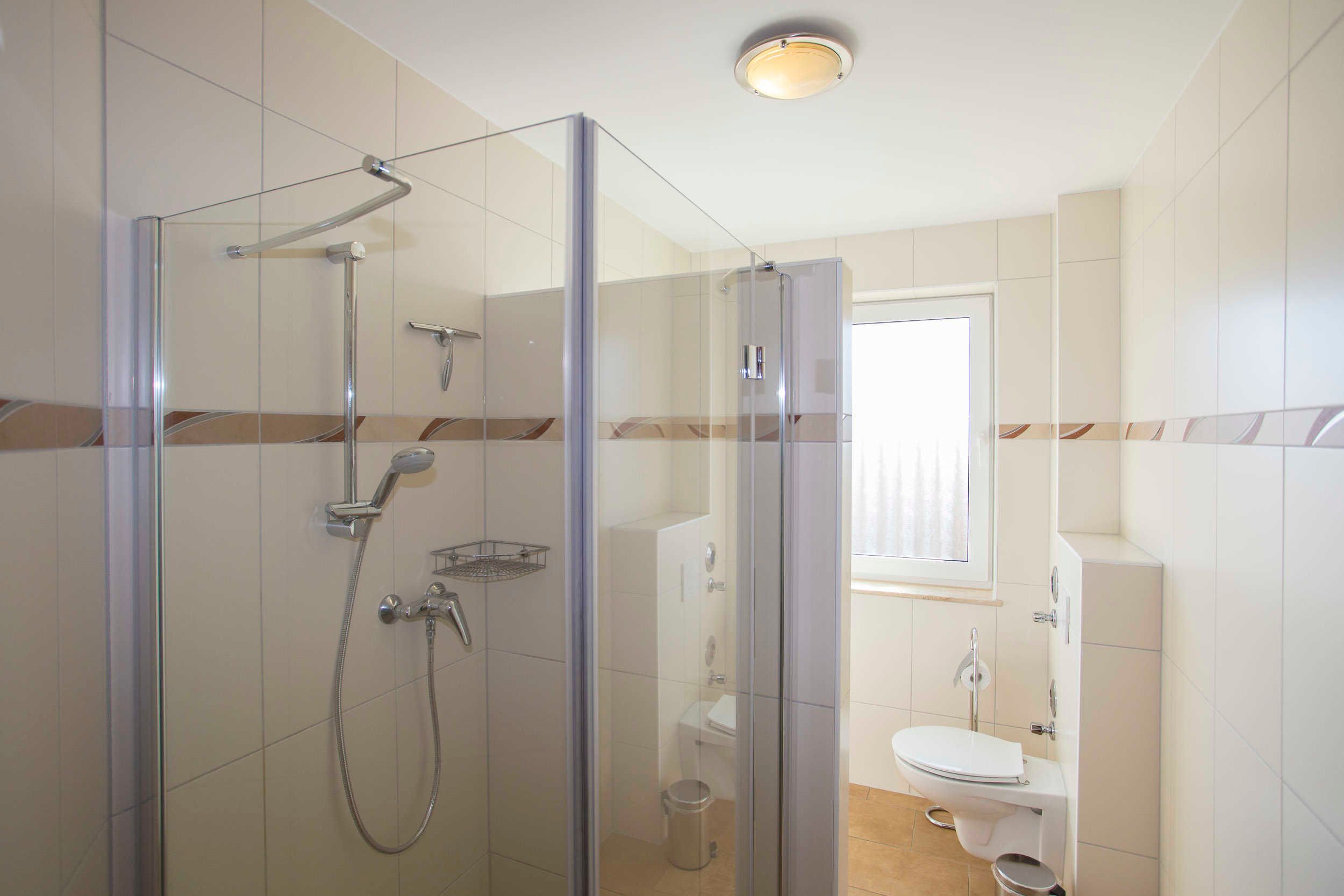 Das Bad verfügt über ein Fenster. Es ist mit einer ebenerdigen Glasdusche, WC, Waschbecken und einem großen Spiegel ausgestattet.
