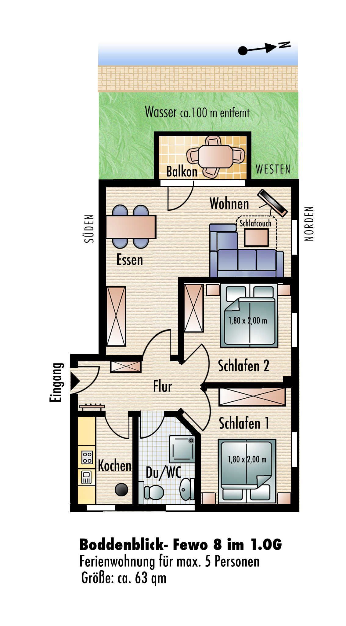 Die modern, hell und individuell eingerichtete 3-Raum Ferienwohnung in Wiek auf der Insel Rügen befindet sich im 1. Obergeschoss im Haus Boddenblick. Sie hat eine Grundfläche von ca. 63qm.