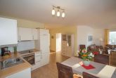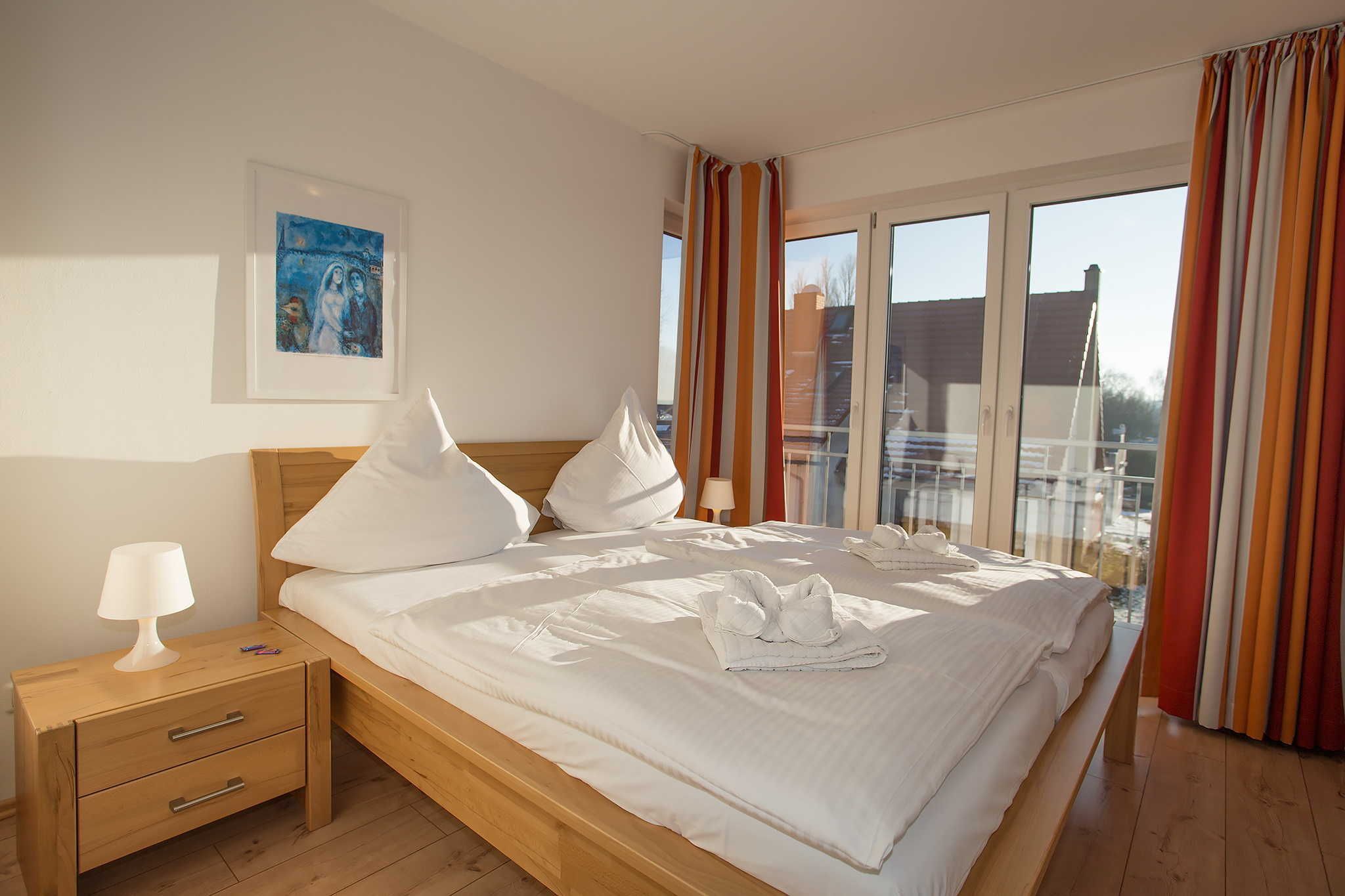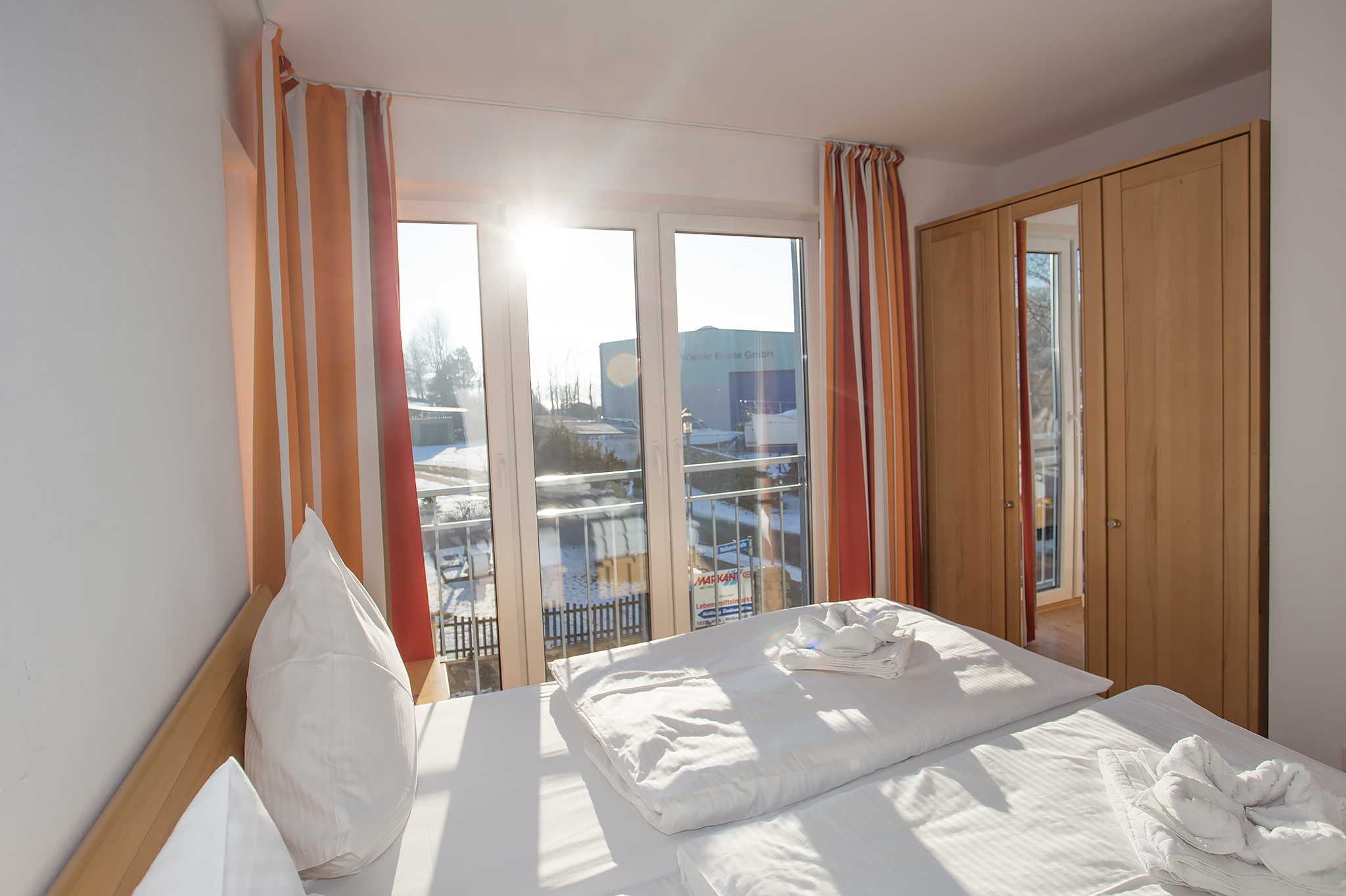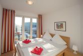 Der Wohnraum ist modern eingerichtet und verfügt über einen großen Flachbild-TV, einem Lowboard, einem Highboard und einer stilvollen Couch (3-er Sofa, 2-er Sofa und verstellbarem Sofasessel) sowie einem großen massiven Esstisch mit passenden Stühlen. Vom Wohnraum ist der Zugang zum großen Balkon gegeben. Die Ferienwohnung verfügt über zwei separate Schlafzimmer mit jeweils einem Doppelbett (2,00 x 1,80m, einzelnen 21cm dicken Komfort-Kaltschaum-Matratzen sowie sehr guten Lattenrosten) und jeweils einen großen Kleiderschrank.