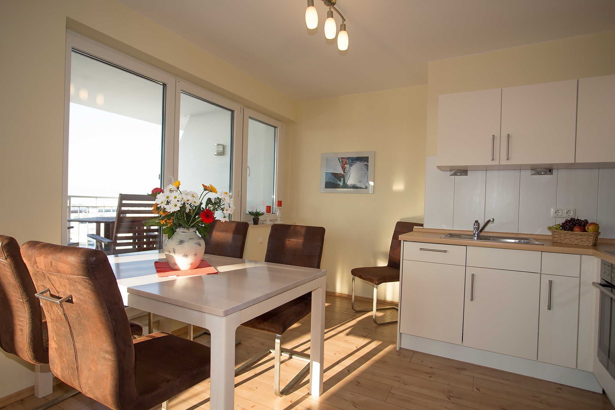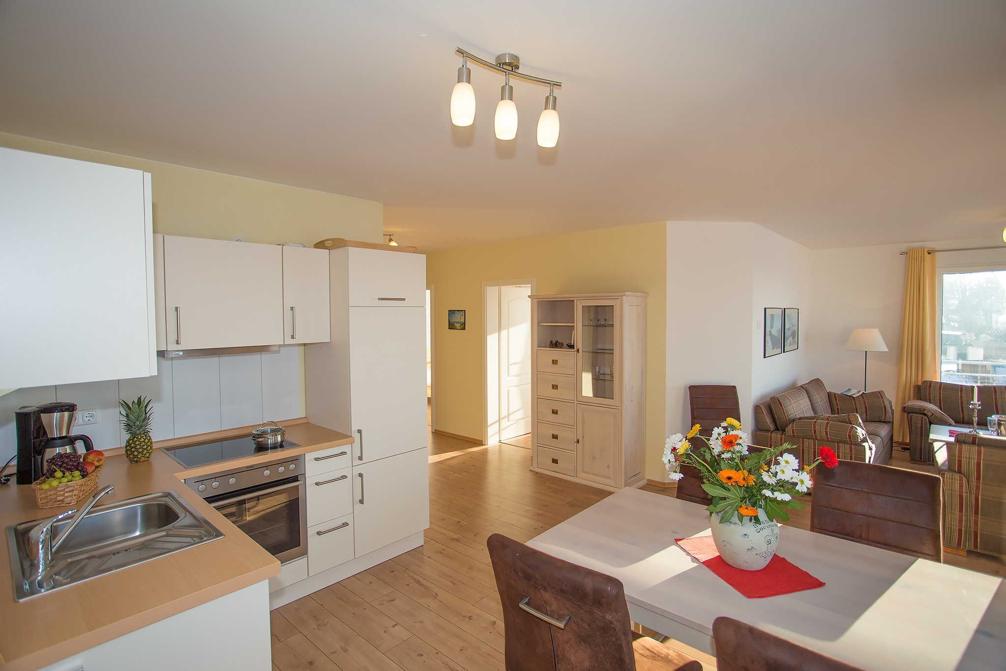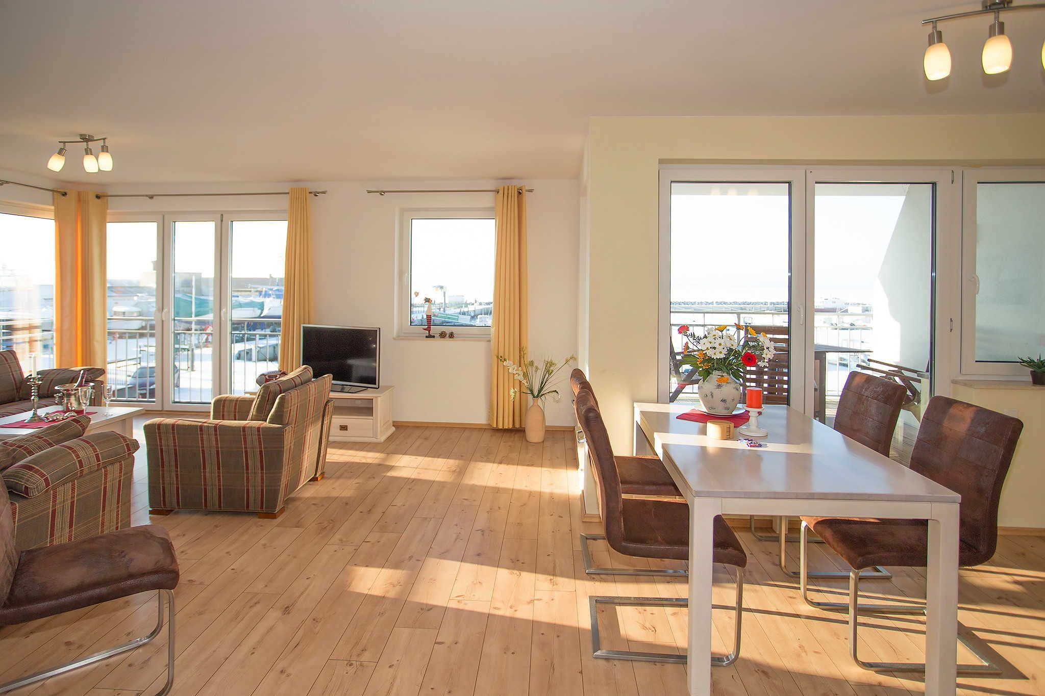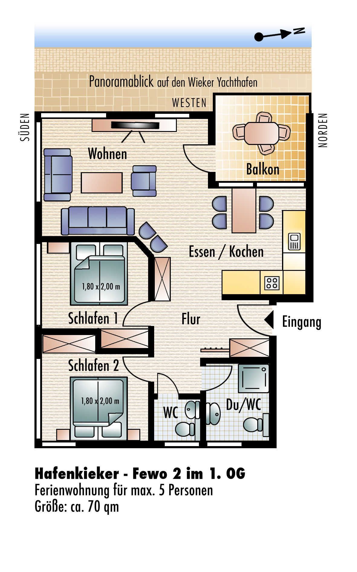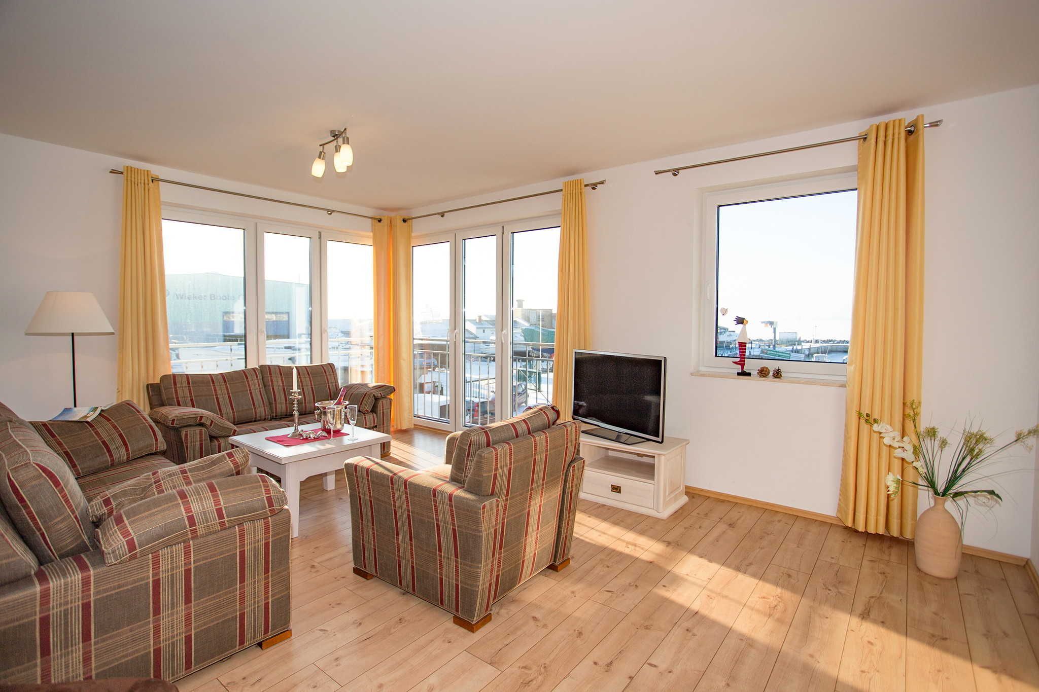 Das Haus Hafenkieker beherbergt 6 stilvoll und hochwertig eingerichtete Ferienwohnungen in Wiek. In allen Ferienwohnungen gibt es eine Fußbodenheizung. Die Ferienwohnungen verfügen über ein eigenes Bad, einem Flachbild-TV, einem kostenfreien Internetzugang (Wlan) und einem großen Balkonfenster mit Blick auf den Hafen. Sie sind in warmen Farben und mit massiven Holzmöbeln modern und individuell eingerichtet. 5 Wohnungen verfügen über ein zusätzliches WC und Waschbecken.
